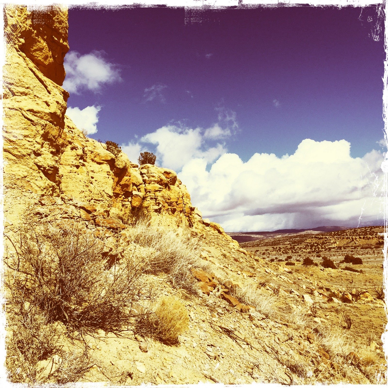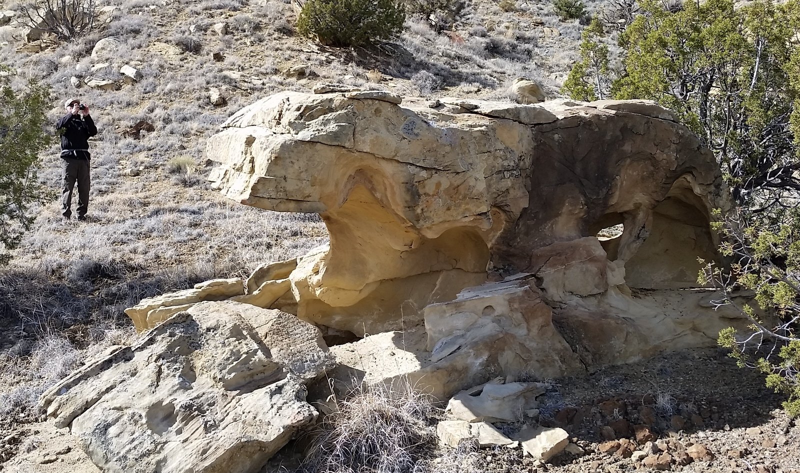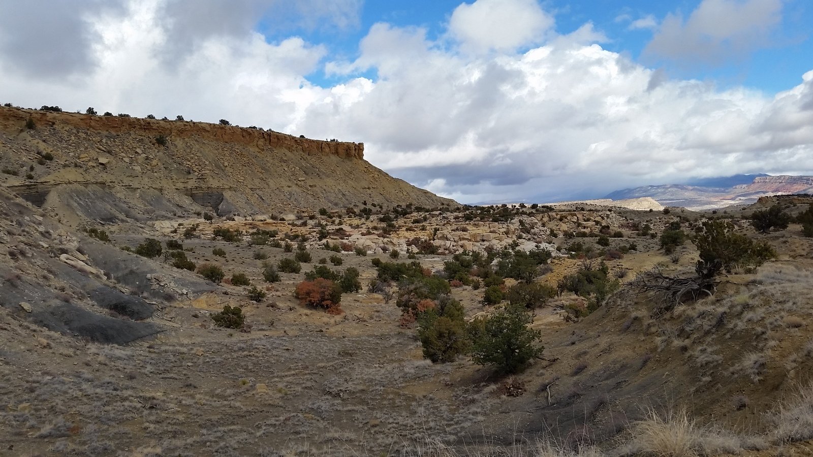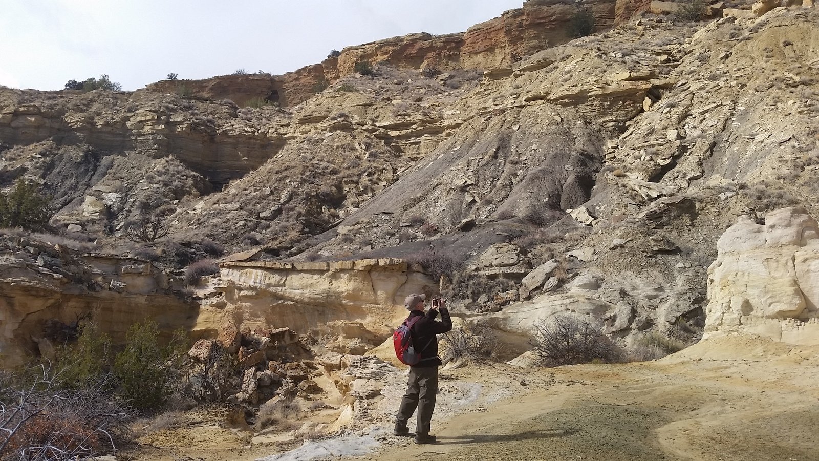 The weather alternated between sunny and warm, and cloudy, breezy, and cool; we found a protected area up near the mesa side for our coffee break. We watched a rain/snow squall move across north of us, further than where we parked the truck, but uncertain of its path we headed back across the grassy plain. Nearing the place where the truck was parked, Mother Nature visited us with drizzle that turned to snow pellets, just enough to get us damp. And enough to wet the two-track so the clay was becoming slick – we were happy to get out before it became unmanageable (happy to have 4-wheel drive, too).