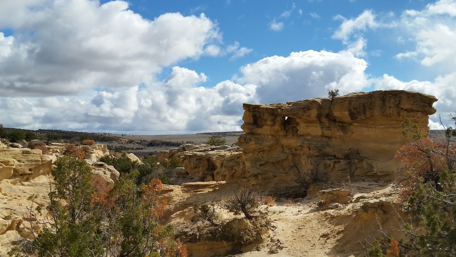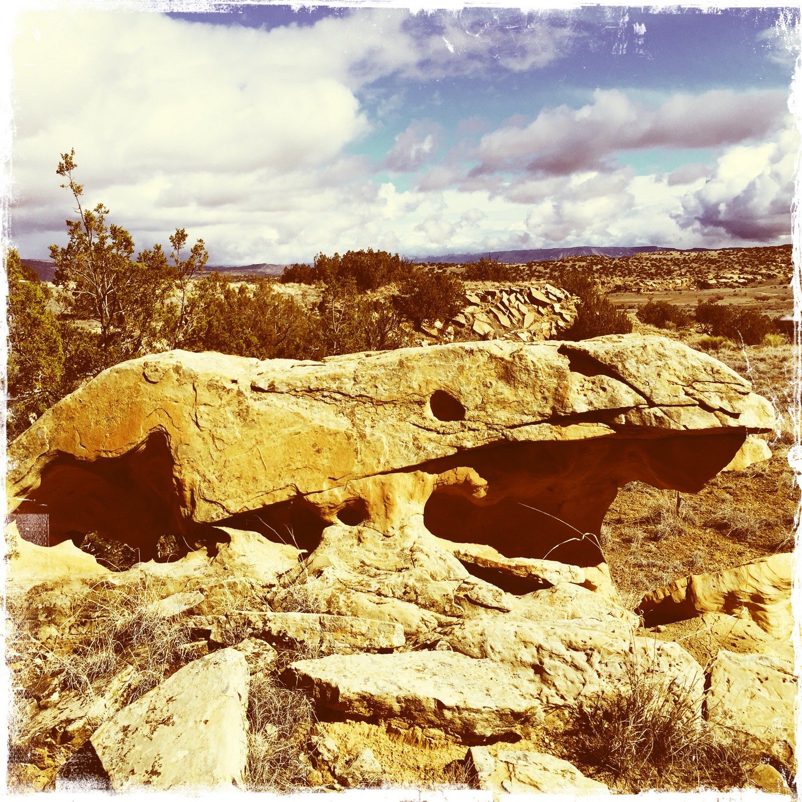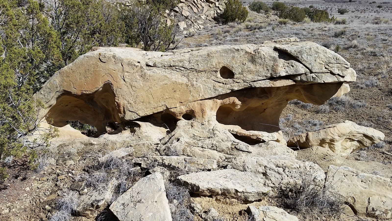 Today we explored another of the areas we thought would be interesting on the mesa south of Cabezon Road (see Ojito Mesa/South Hike). Striking out on our own, to explore an area that looked interesting via GoogleEarth. Mesa Prieta is in the background, with Mount Taylor and Chivato Mesa on the horizon.