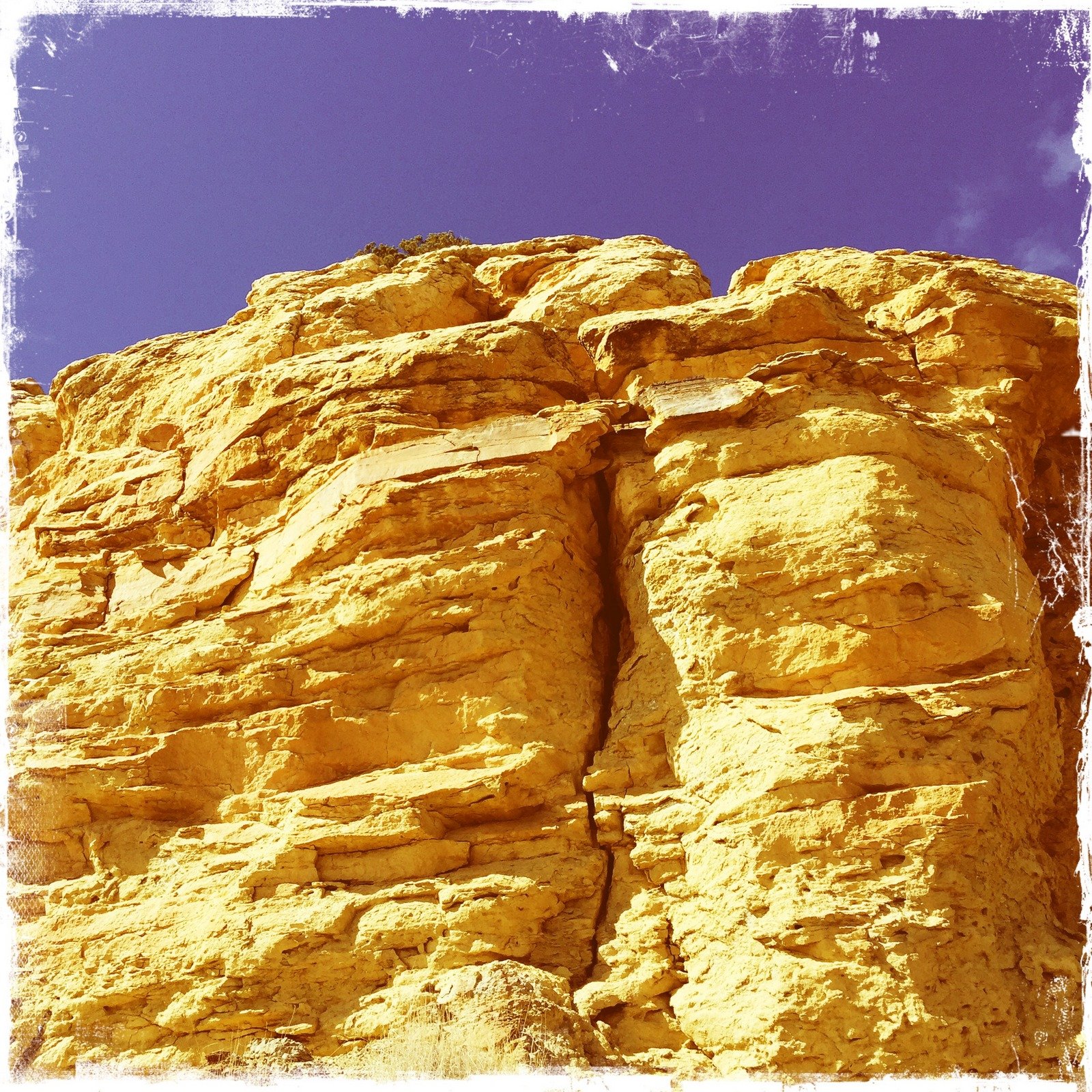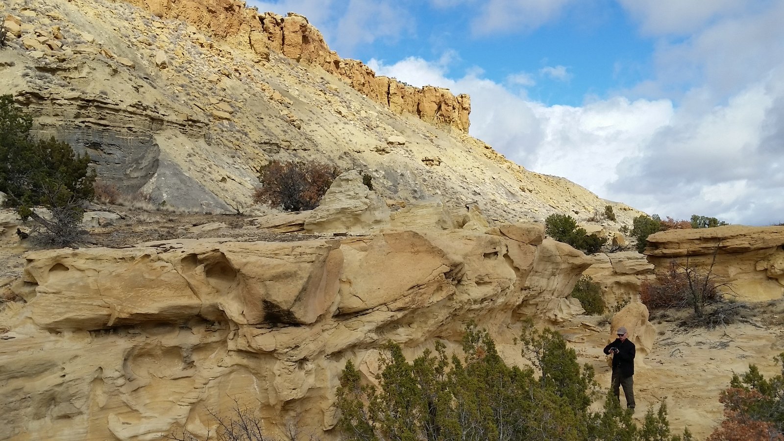 We continued south along the face of the mesa, looking for an area where we might ascend to the mesa top – none presented itself (although another .25 mile or so a canyon extending into the mesa appeared to offer such an opportunity). Along the way we had to slide under another fence, much as was required on the Ojito Mesa/South hike (I suspect this is another section of the same fence line.)