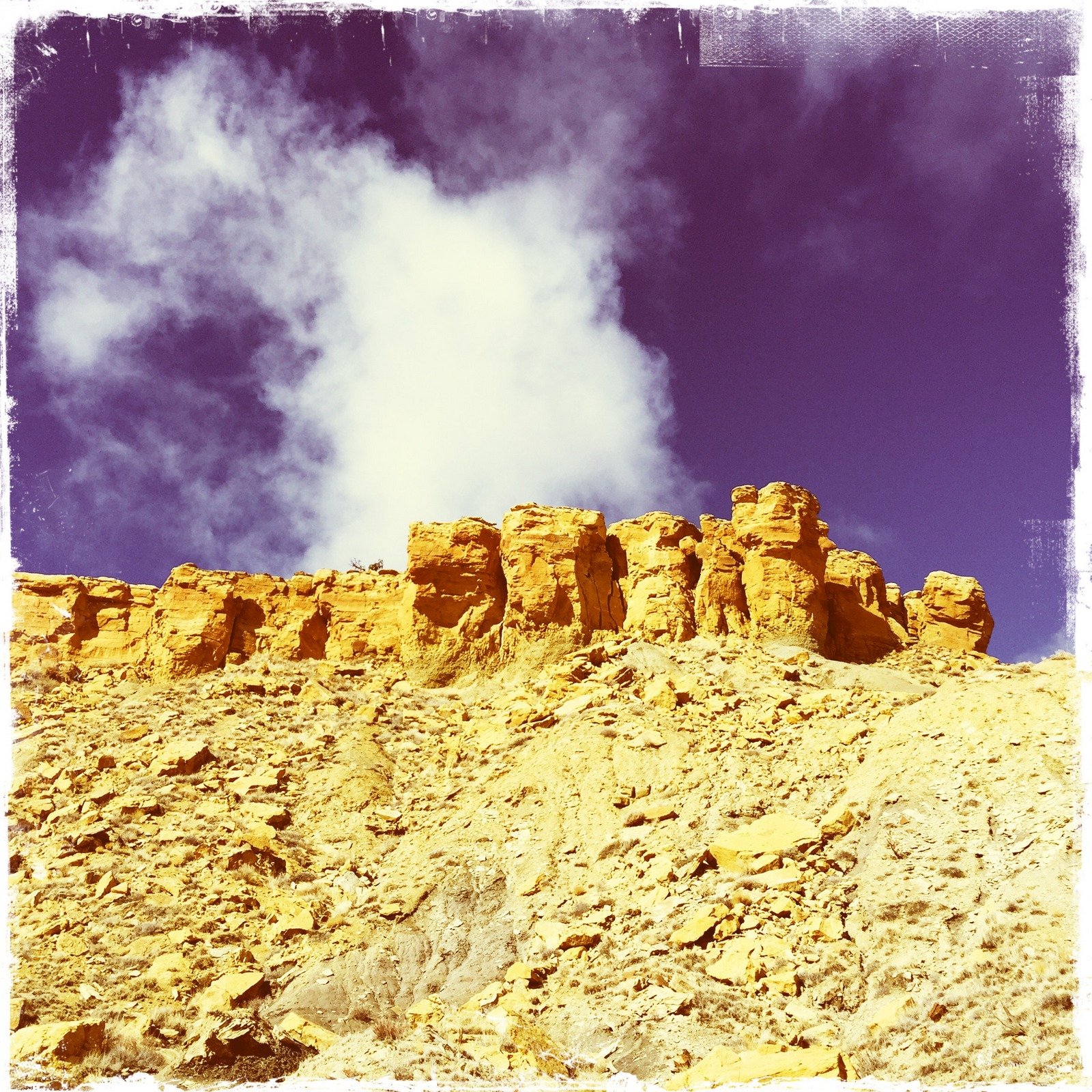 Leaving the road on a two-track, we proceeded on somewhat rough terrain until prudence said “far enough”. Then walking up the tortured two-track and cresting the rise, a wide open plain lay before us, with the mesa as a backdrop. Approaching the face of the mesa, we decided to follow along heading south. Soon we found ourselves in an area of amazing rock formations – colors, shapes, textures, and more. As can be seen from our speed (the blue area on the profile graph on GoogleEarth image), from the .5 mile point until .8 mile, we spent a lot of time marveling at the rocks and terrain in this area. This definitely made this a great hike.