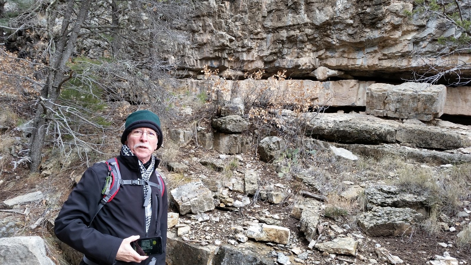 Temperature was cool (low 40s) but no wind on the trail, and with moderate cold weather clothing we were quite comfortable. As mentioned, mud, slush, and some soft ice were the order of the day. The trail goes up Otero Canyon, the climbs to the ridge north of the canyon, and returns to the parking area. Surface is almost entirely soil, tho’ if one sticks to the canyon bottom it is rock covered (which we did in sections to avoid the often very muddy trail proper). There are no steep sections (great for the bikers?) thanks to good switchbacks climbing out 0f the canyon.