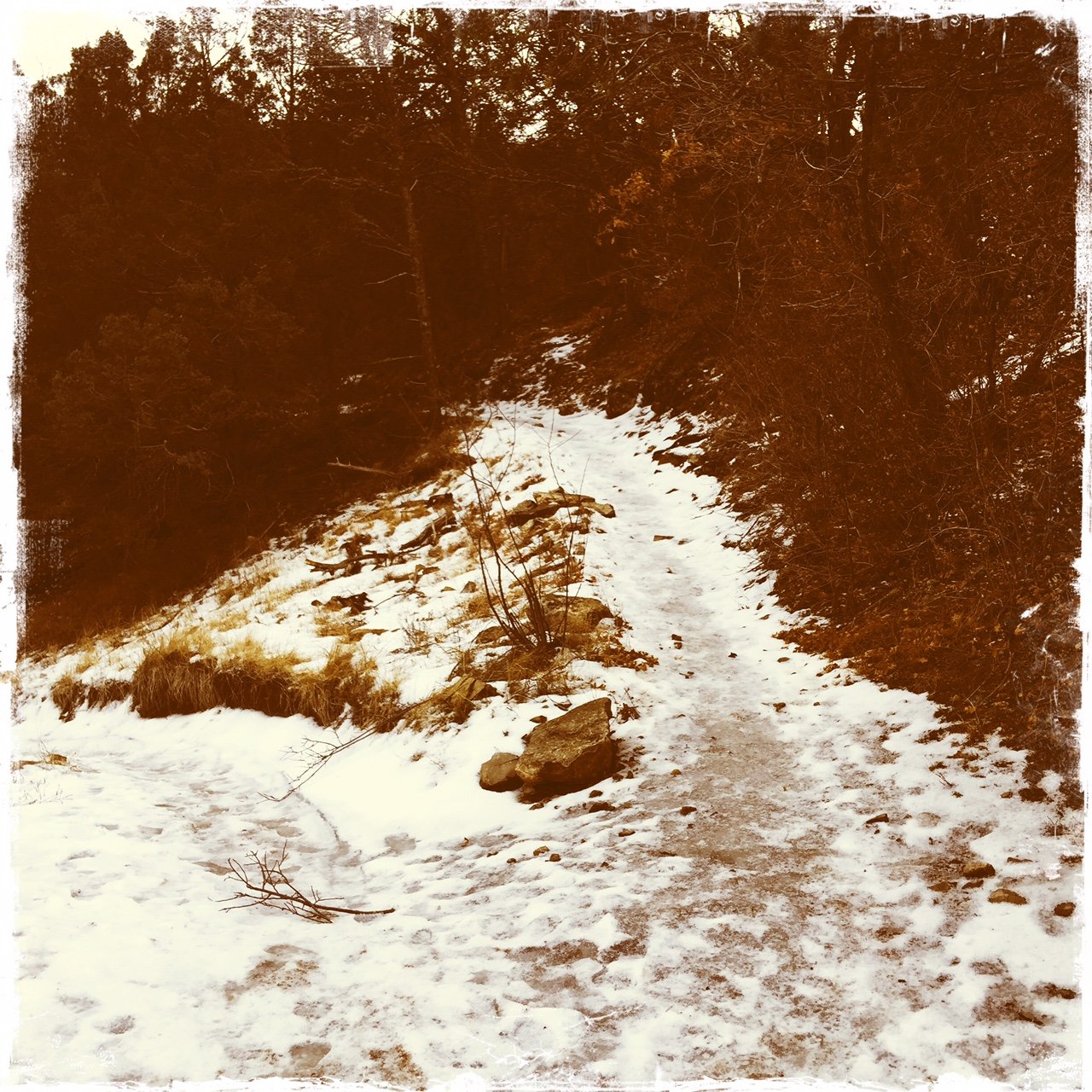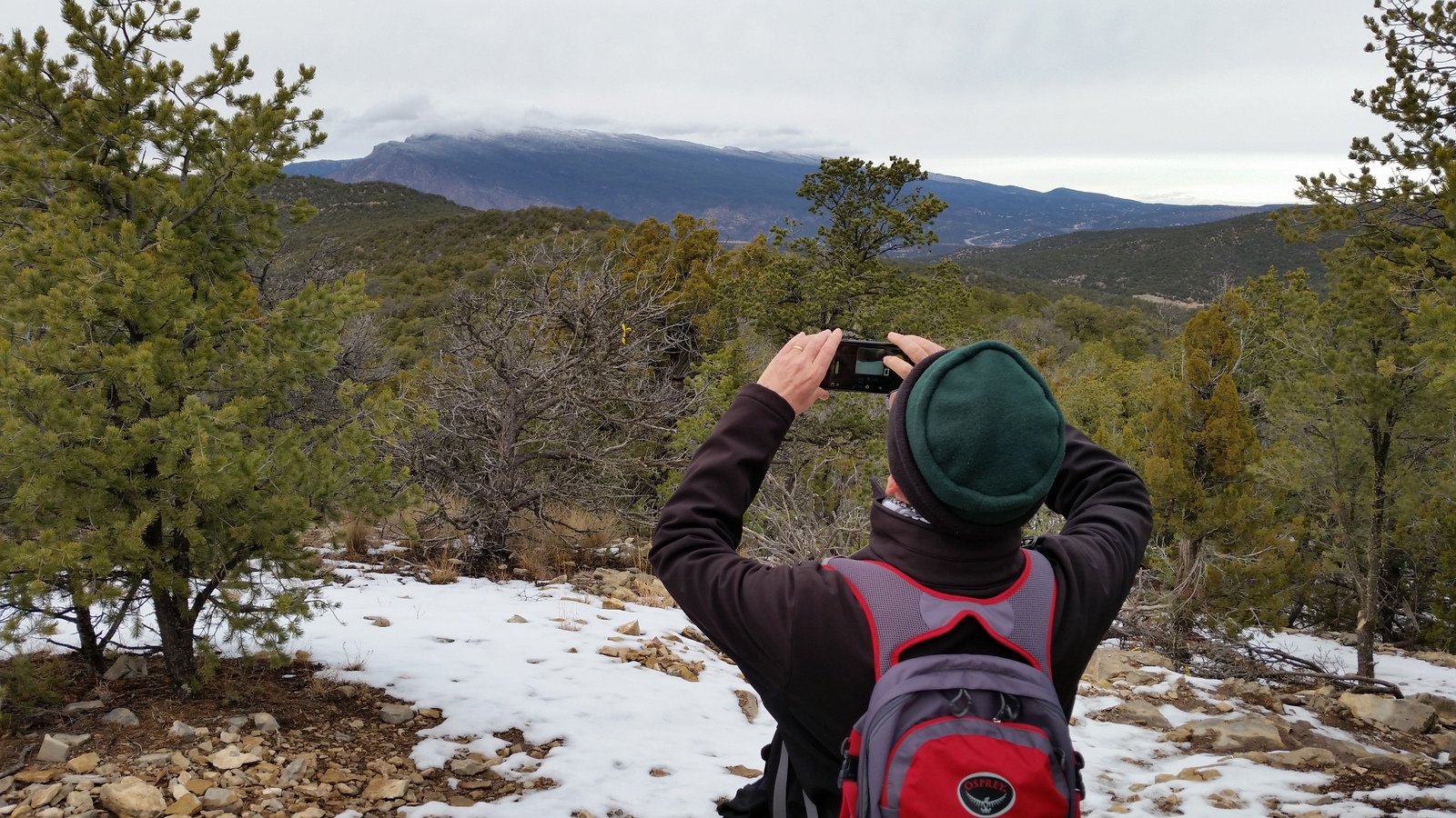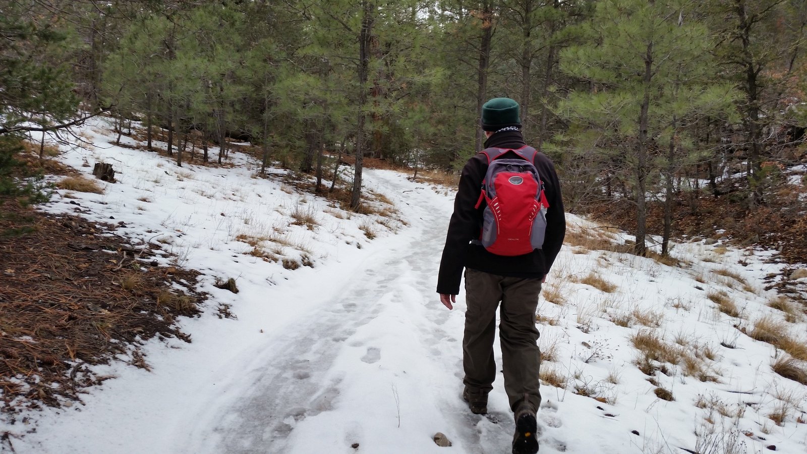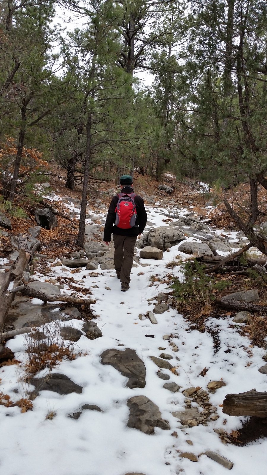 Jay here: The mud, ice and snow made for an intimidating hike experience. I kept thinking that we would reach some point on the trail that was just impassable due to the depth of the mud or danger of ice. In that respect it was another example of pushing beyond one’s comfort zone. When we got back to the trailhead it took us 10 minutes to scrape the mud off the bottom and sides of our boots. Next time there’s the prospect of mud, we’re bringing shoes to change into.