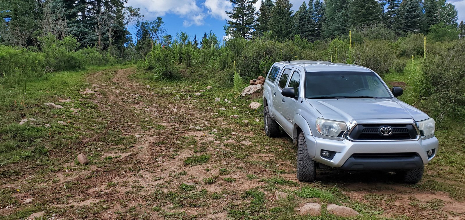 We continued towards the end of the mesa; the two-track dwindled until we were on a faint path that followed the map’s trail. Using the topo lines as a guide, we continued to the pointy end of the mesa where we found ourselves again on a faint path down a moderate slope to the base of the mesa .. and the trailhead. Perhaps a mile from the trailhead, Mother Nature visited us with some light rain, enough to get out our raincoats and to make mud around the truck when we got there.