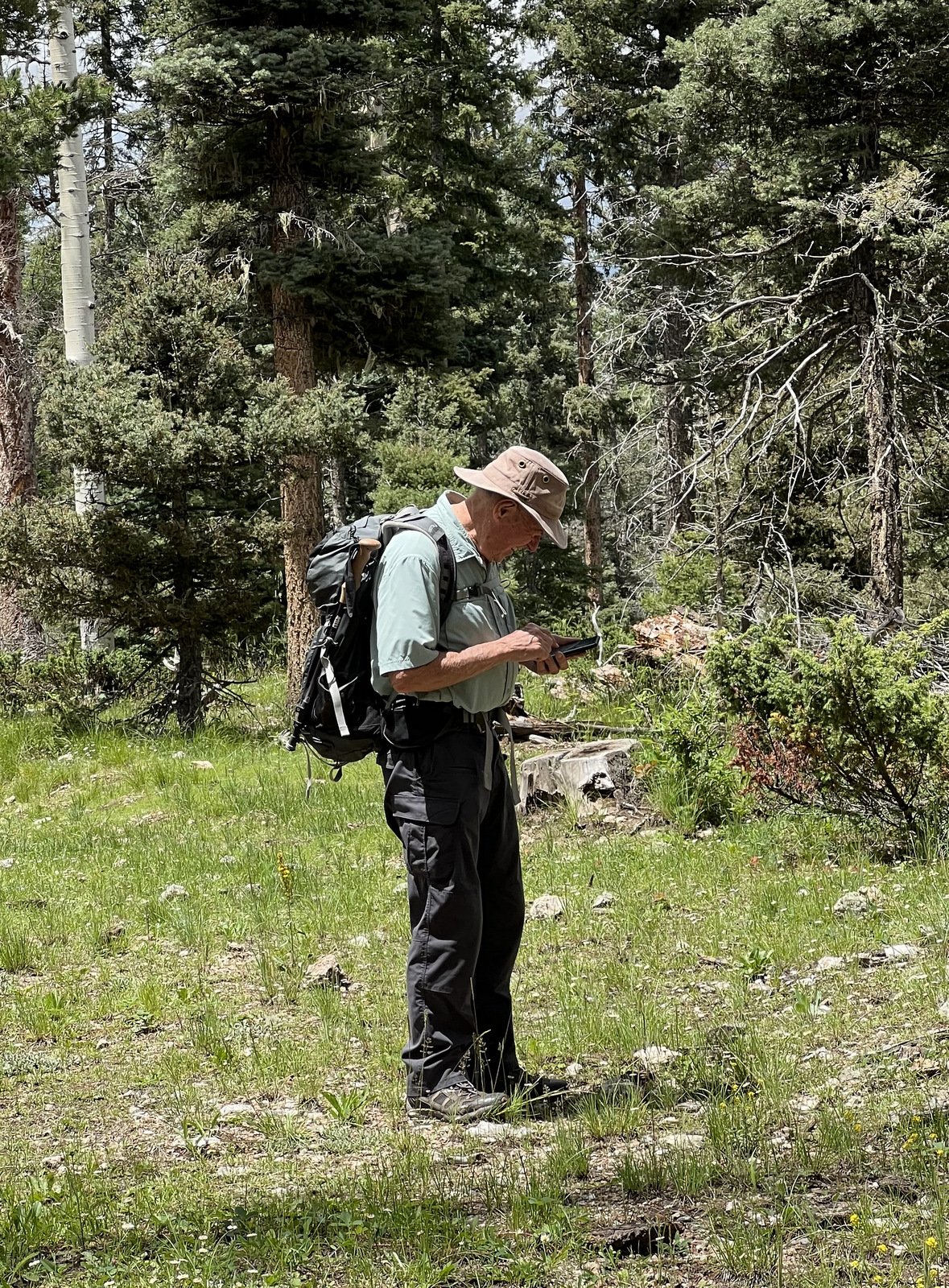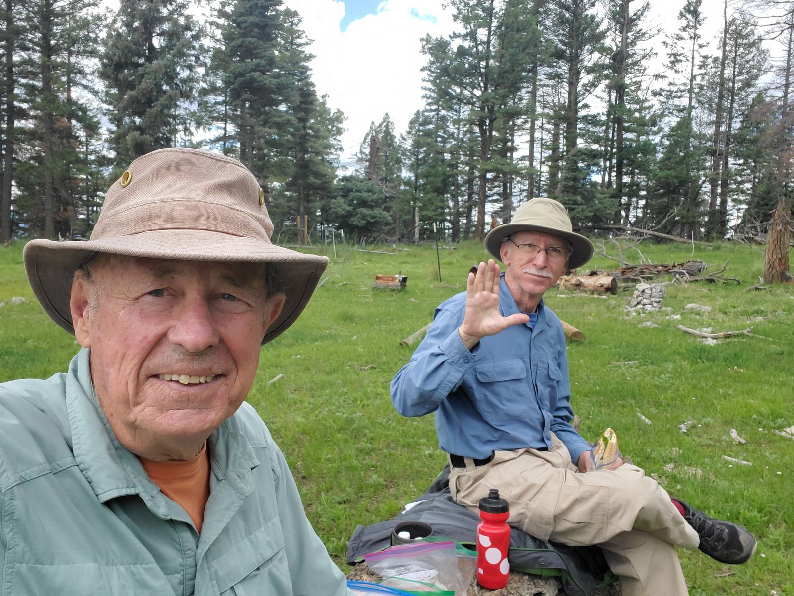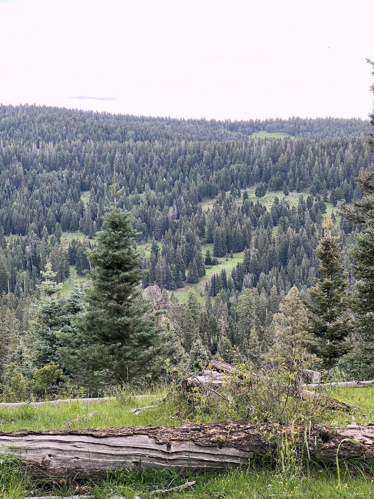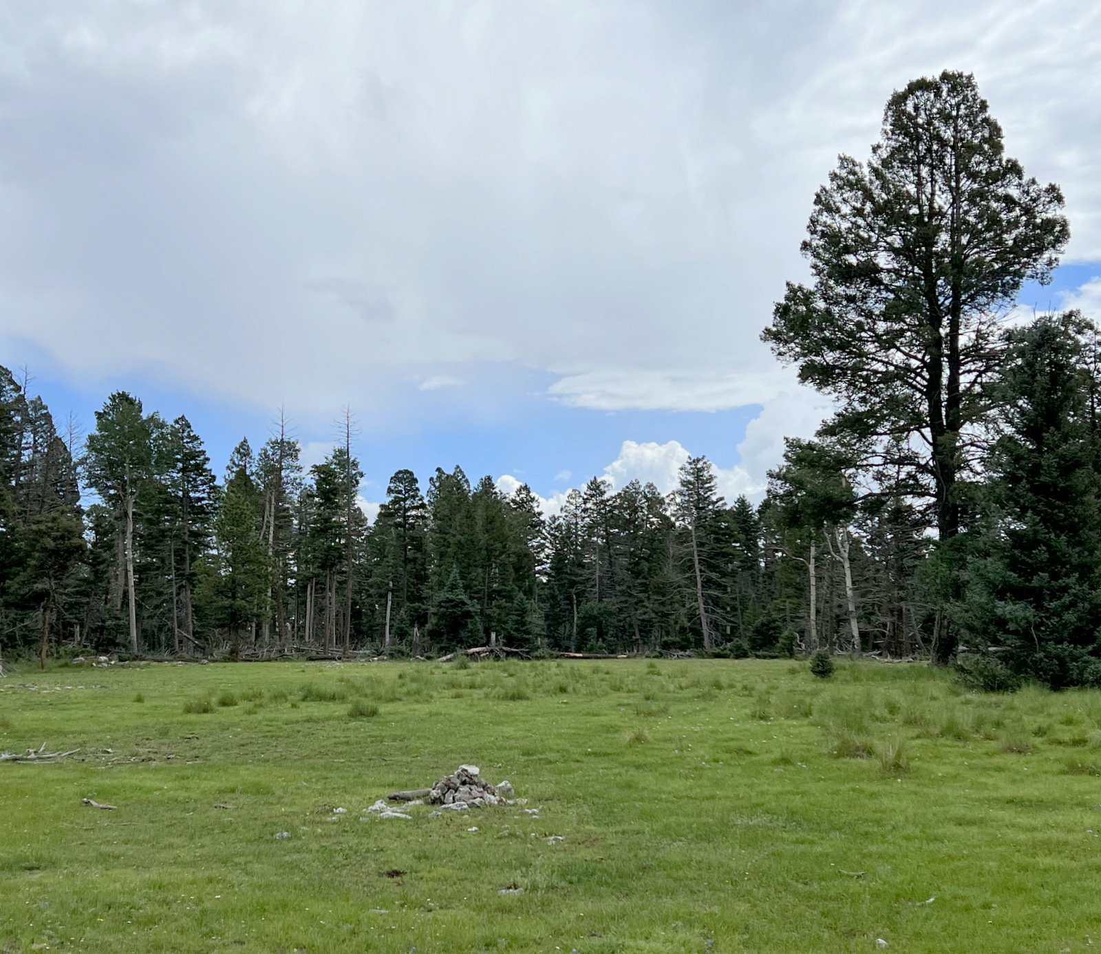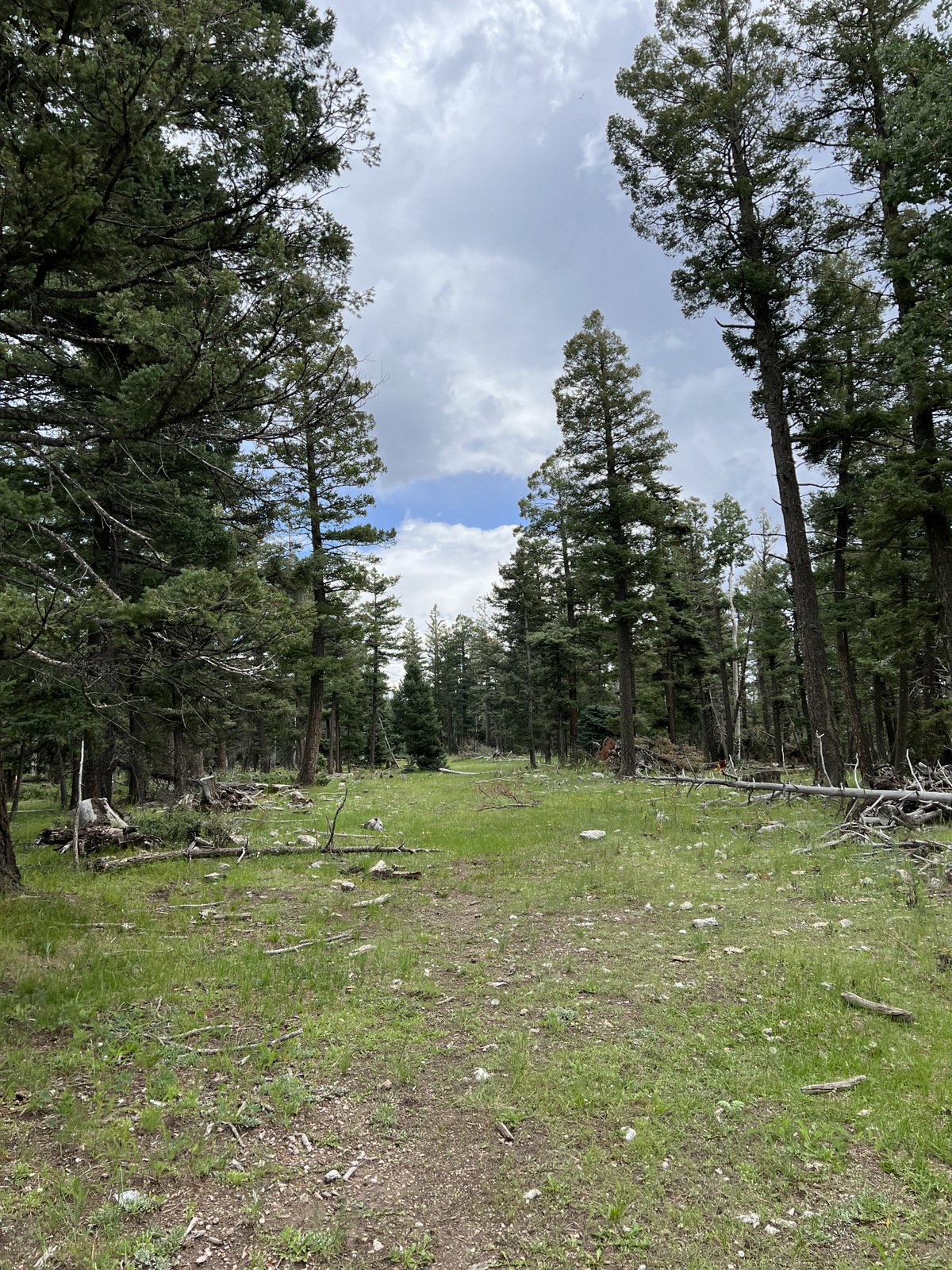The trail was depicted to be on the west side, so we headed across. Not really bushwhacking, but there was no trail to follow; we walked through open forest and lots of green grass and flowers, among tall ponderosa trees. Approaching the west edge of the mesa, we hoped to find the trail depicted on the topo maps – it was not apparent. We wandered a bit further up the mesa along an opening in the forest (appeared to be an old two-track). This took us away from the western edge, until encountering a fence. We followed the fence back towards that edge, into a large opening in the forest.