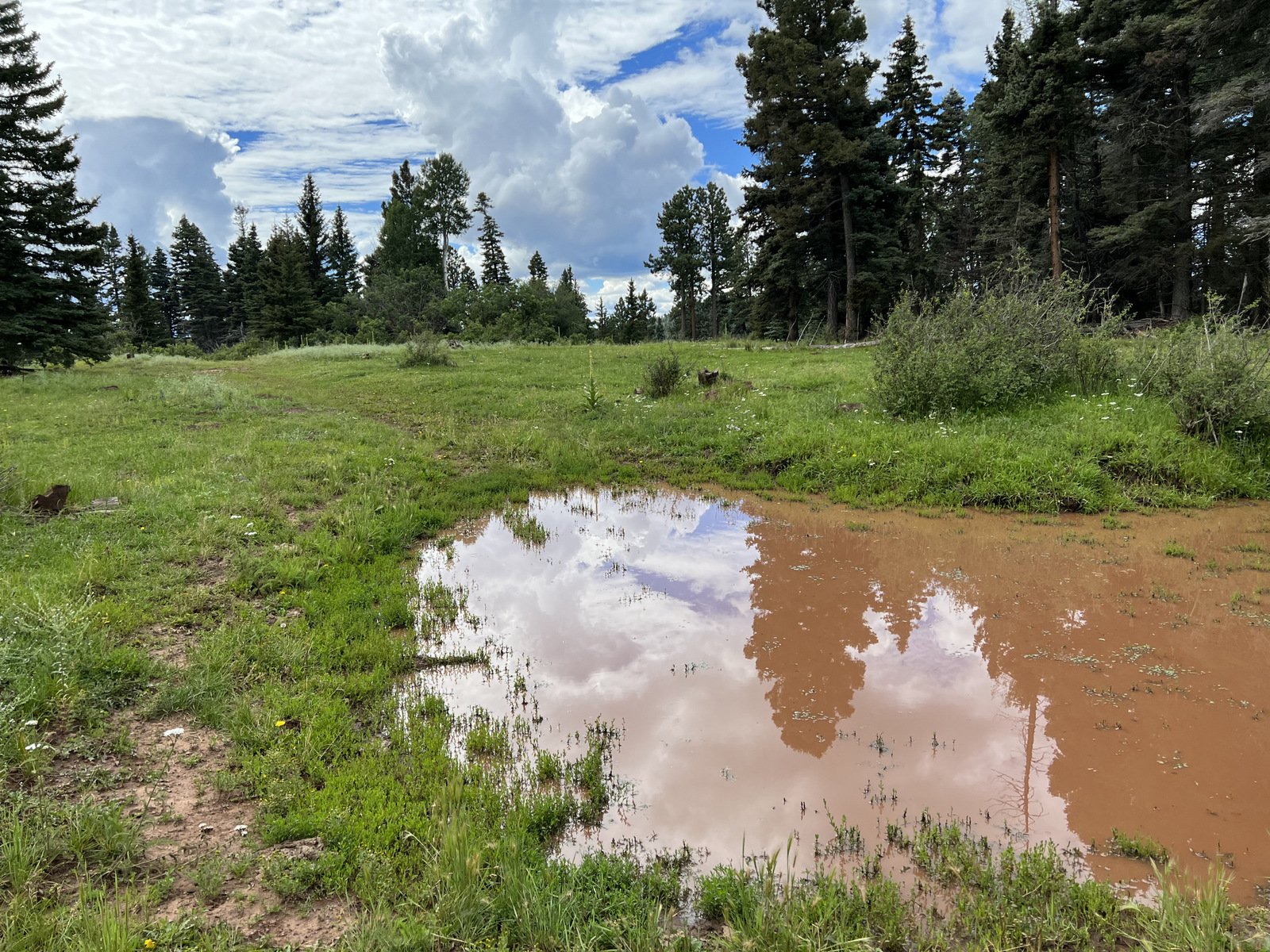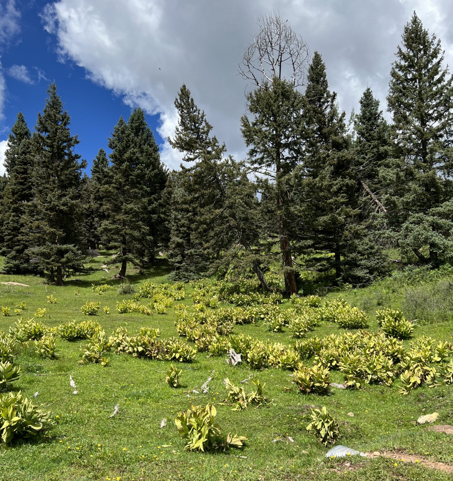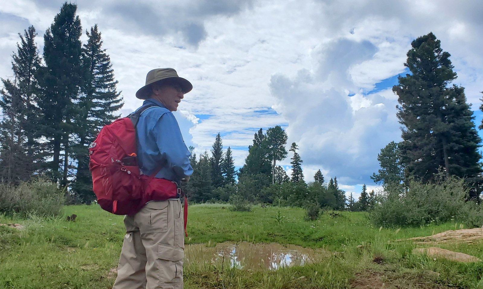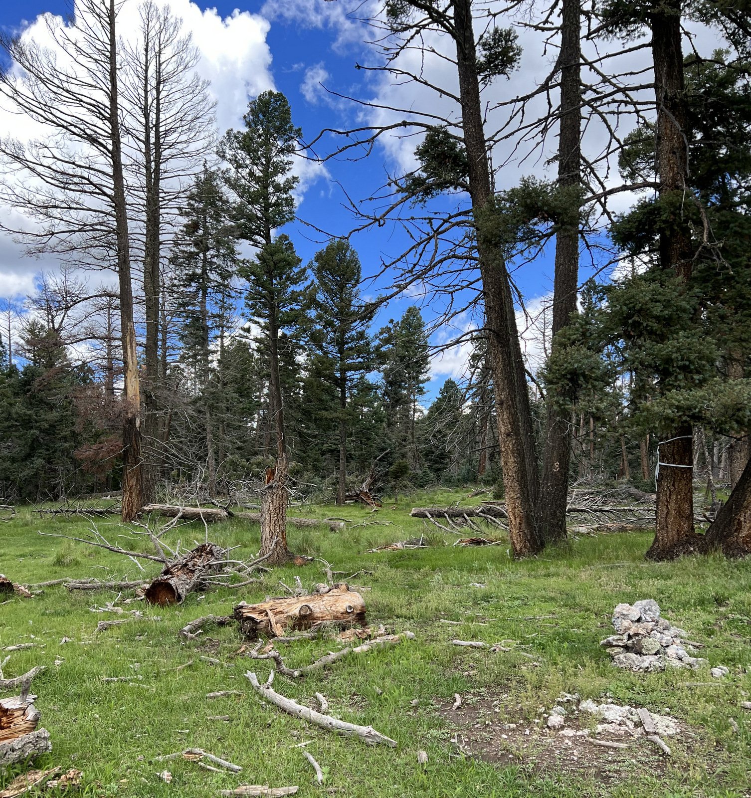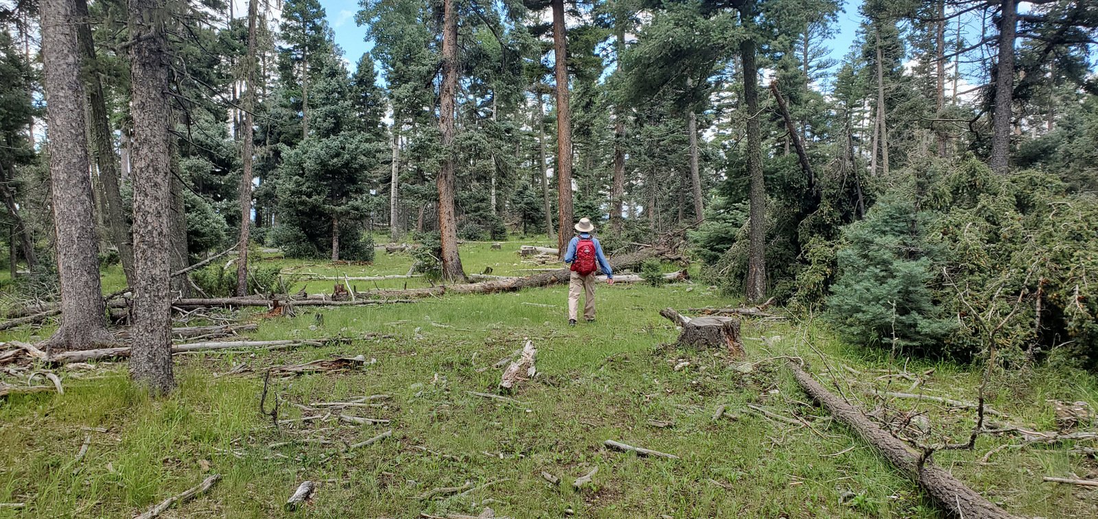 The trail was depicted to be on the west side, so we headed across. Not really bushwhacking, but there was no trail to follow; we walked through open forest and lots of green grass and flowers, among tall ponderosa trees. Approaching the west edge of the mesa, we hoped to find the trail depicted on the topo maps – it was not apparent. We wandered a bit further up the mesa along an opening in the forest (appeared to be an old two-track). This took us away from the western edge, until encountering a fence. We followed the fence back towards that edge, into a large opening in the forest.