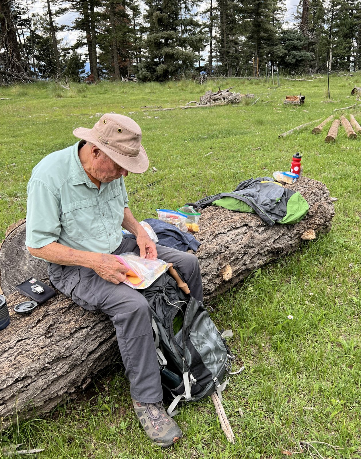 Figuring the trail was just not evident, and before heading back to the trailhead, we paused for our mid-hike break, on a log nicely in place for lunchtime seating.