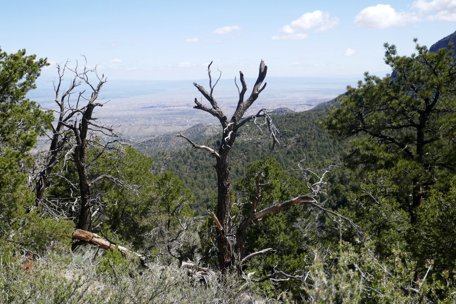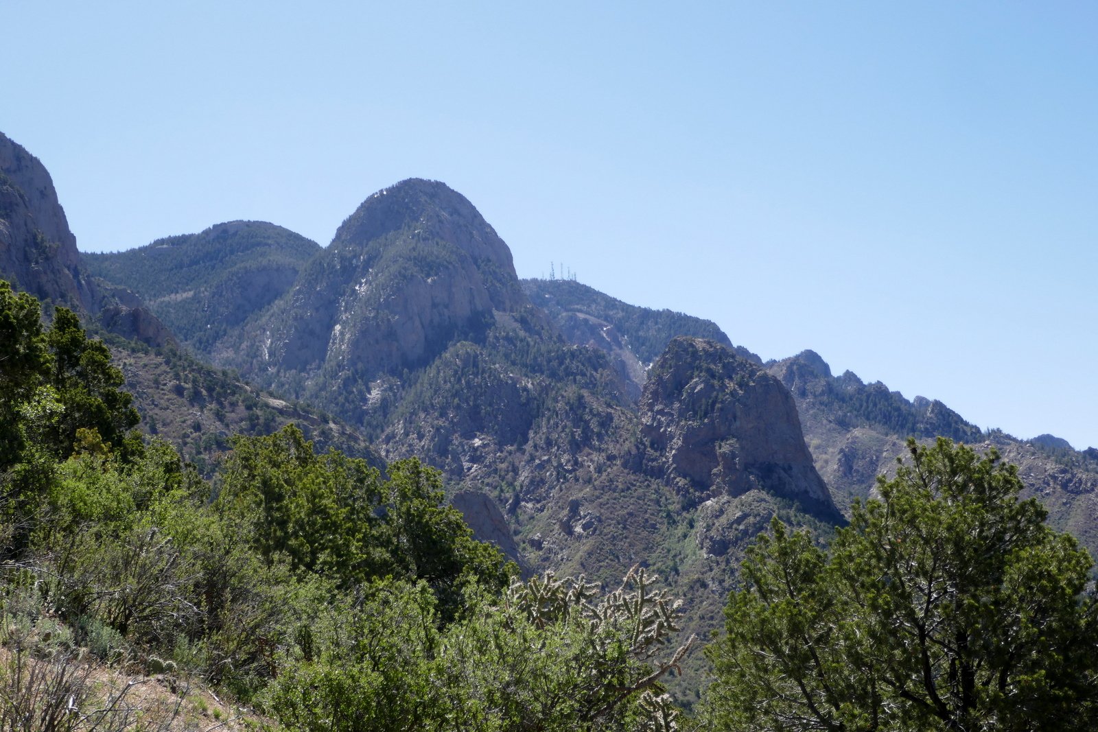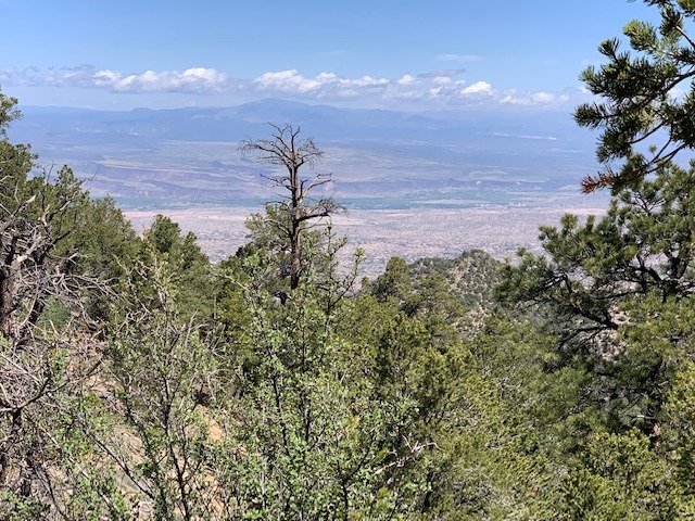 We hadn’t planned on such a hike but were pleased to have conquered Piedra Lisa. All along the trail the views were great: to the southwest down La Cueva Canyon and beyond to a broad vista of Albuquerque and to the east the cliffs of this west side of the Sandia Mountains. Unfortunately this was a hazy day so the photos below don’t convey the views very well. At the “top”, a saddle atop Rincon Ridge, we stopped for our mid-hike break where we had a nice view north into Placitas. (From here, one can continue north on the Del Agua trail that ends on the Loop Road that comes off NM165 in Placitas; Jay and I did a p0int-to-point on these trails back in 2013, not long after we started hiking regularly.)