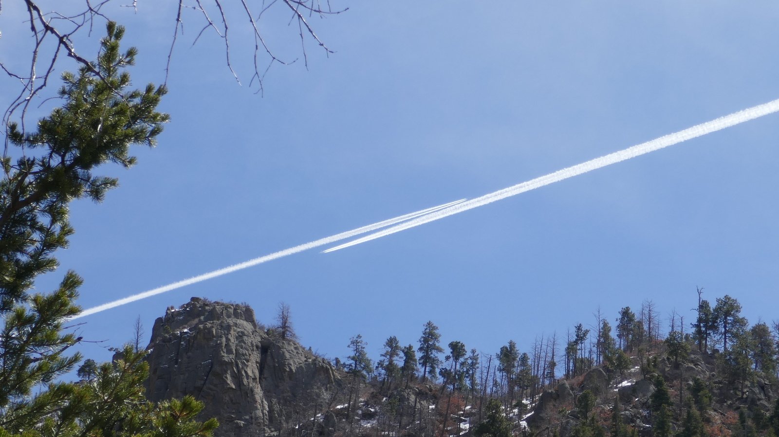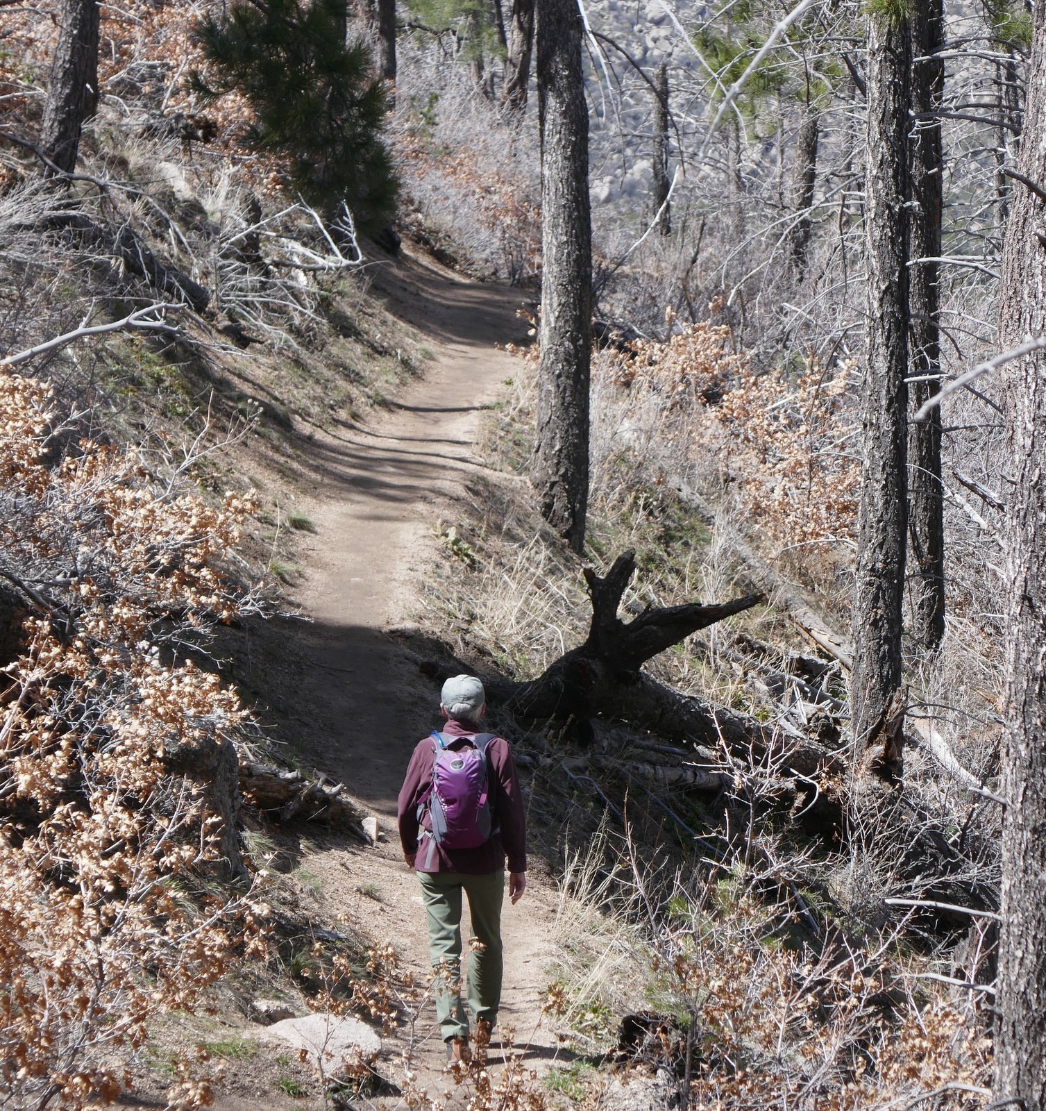 This day’s hike was most pleasant – a comfortable temperature (started with 3 layers, shed to 2 midway outbound), no wind, bright blue sky with some filmy clouds at times. Folks we met on the way up reported encountering snow near the top – we weren’t expecting to go that far so no problem for us. We did go far enough to find small patches of snow in heavily shaded spots, some on the trail, but none making the trail even muddy. We stopped for our mid-hike break at a wide, sandy area, perfect to brew some coffee, and enjoy a peanut butter and jelly sandwich, carrots, and a bit of tequila.
