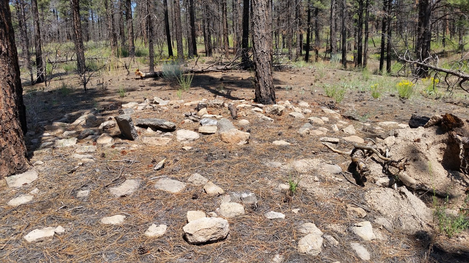 Continuing on FR 10 beyond the Paliza Campground, one climbs to the top of Ponderosa Mesa – park here to go south to Boletsakwa. Today we continued further on FR 10 for about 1.7 miles, where we parked and headed south about 100 yards to the northern edge of the Kiatsukwa Ruins.