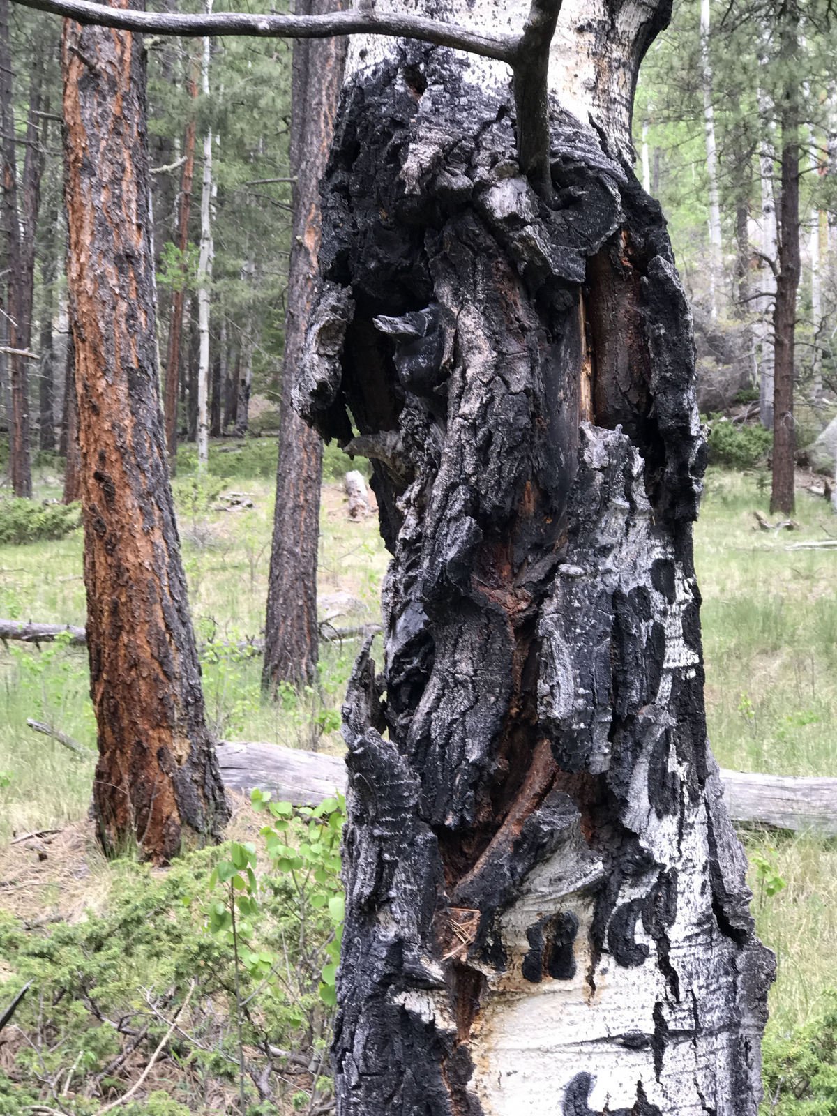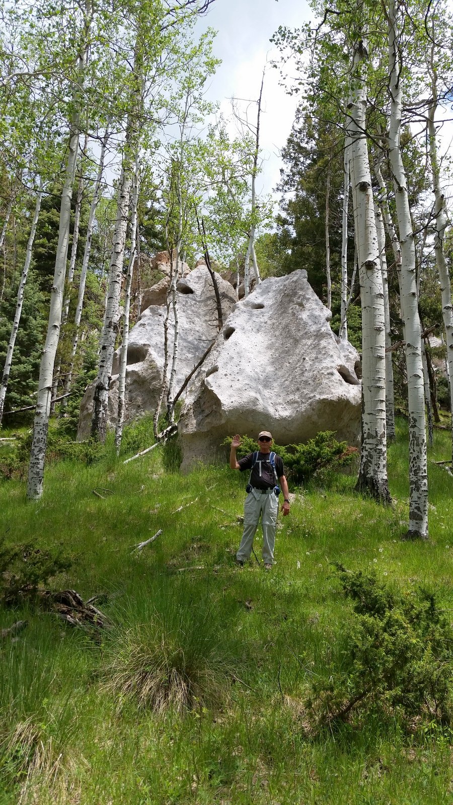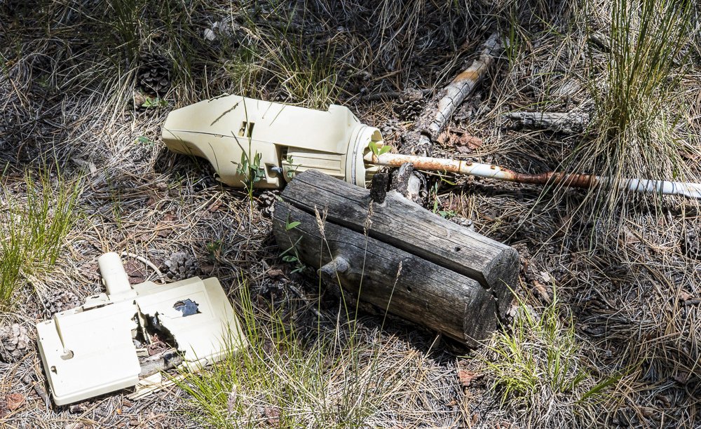 Jay here: This was a surprisingly pleasant hike for the fact that we were surrounded by large aspen groves most of the way. It didn’t take long for it to dawn on us that this would be a magnificent walk in the fall when all the apsens have turned gold. And once again, the detritus was both interesting and puzzling. The bones of a foreleg and hoof we surmised to be that of an elk perhaps. The electric broom style vacuum cleaner is another story. Who brings a vacuum on a hike only to dispose of it? Or was it tossed out of an airplane? We’ll never know but we can dream up some strange scenarios to explain it.