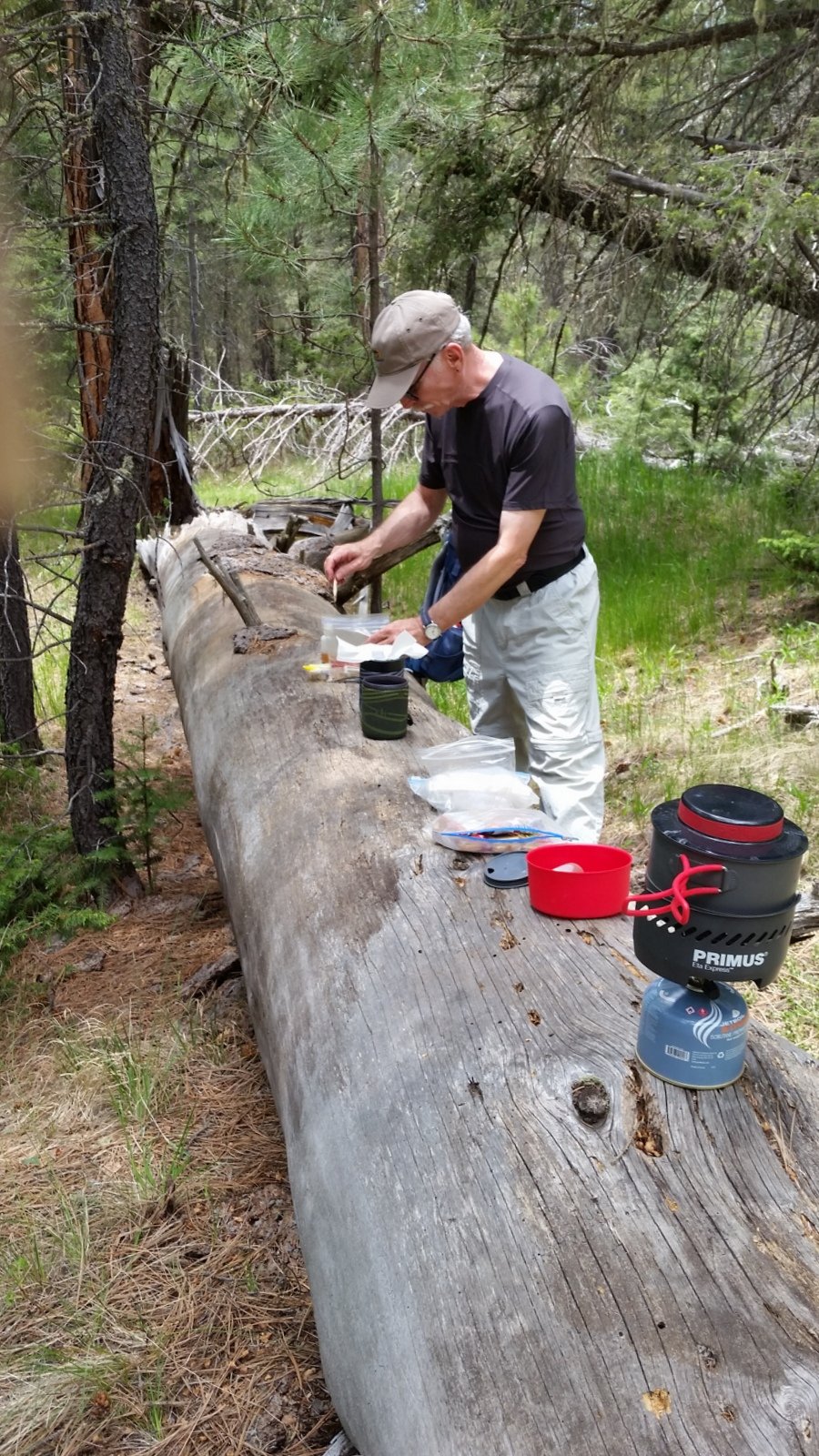 About 1.8 miles from where we started, we found the north side of the canyon permitted ascent to the ridge above – perfect to cross that ridge into the unnamed canyon to the north. Near the ridge-top we had our mid-hike break, then angled down into the unnamed canyon. This canyon’s floor wasn’t as open as the others, and at times we found ourselves skirting many down trees and occasionally clumps of underbrush.