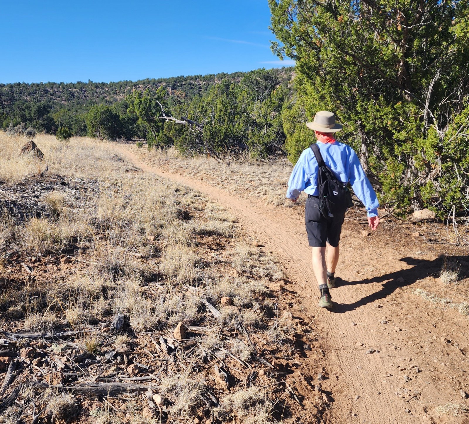 The return to the trailhead, gently up hill, was pleasant with more ponderosa pines offering a modicum of shade. Nearing the trailhead, we referred often to GAIA, choosing a trail among the web of trails that are laid out in this area.
