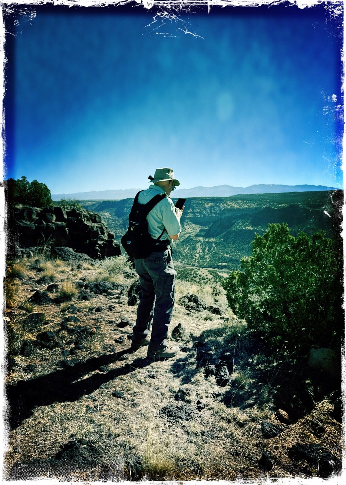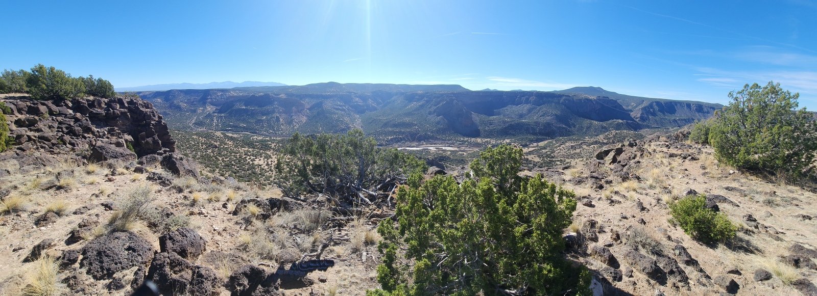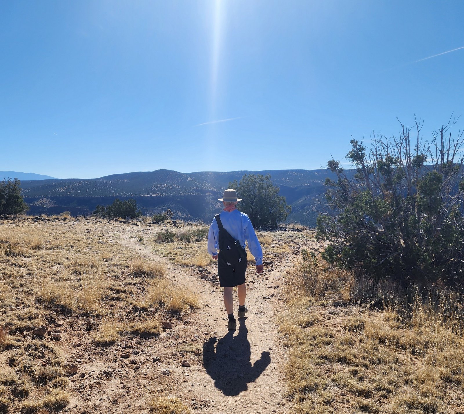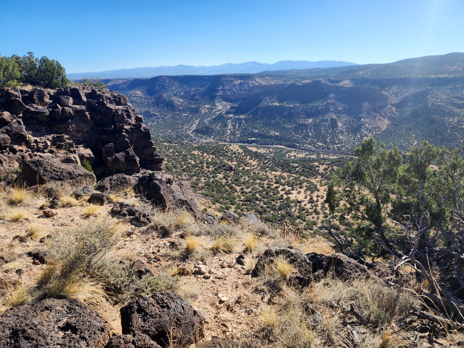 The trail descends gradually from the trailhead across generally open ‘NM desert’ terrain – mostly dust, occasional rocks, and among scattered juniper, piñon, and the occasional ponderosa pine. When we reached the end of the Loop, we chose to continue on the Estante Trail and its extension to an overlook of the Lower Water Canyon to the Rio Grande and to the cañons coming down to the Rio Grande from the other side.