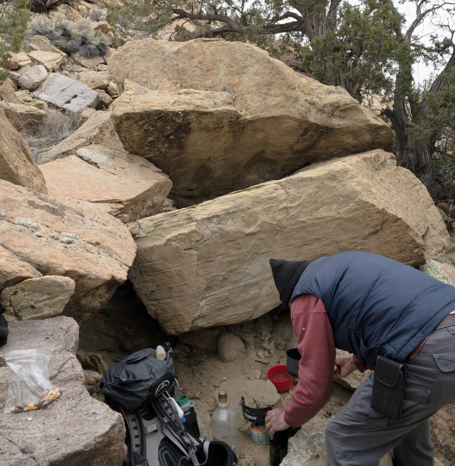 We chose to do a WalkAbout (just wandering, not a great distance), exploring galleries protruding into the ‘unnamed’ mesa. (We were also curious about the condition of the two-track beyond our stopping point; as far as we explored, it was in good condition. On further inspection via GoogleEarth, it appears to be very challenging further along as the canyon becomes more narrow before topping out still some distance from Pipeline Road. It would seem to make a great route for something more nimble than the Tacoma, like an ATV or such.) After the WalkAbout, we enjoyed our traditional mid-hike snack, then headed back to US 550.