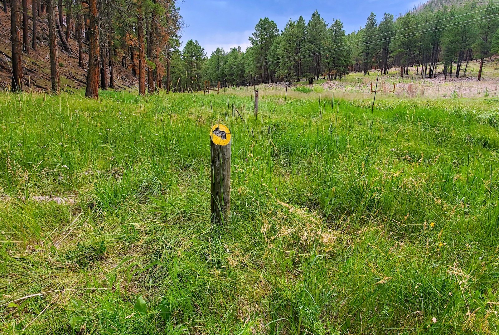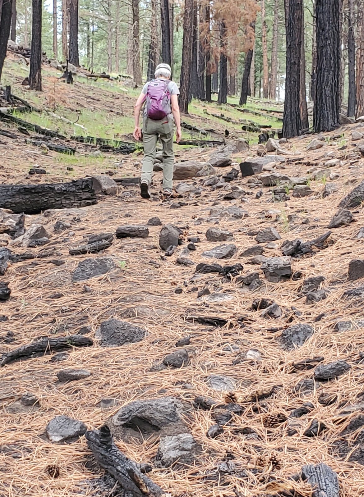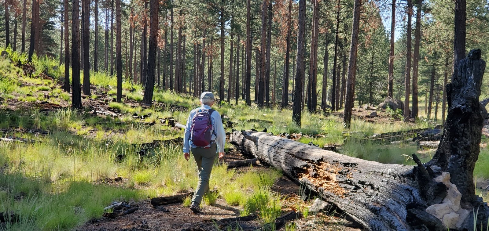 We proceeded on the 2-track, including a portion that was elevated above the Meadow – shaded and offered a great view down into the Meadow. From that vantage point we spotted an interesting feature, a circular area of burned grass, in the center a burned tree trunk. Looked to us like a lightning strike.