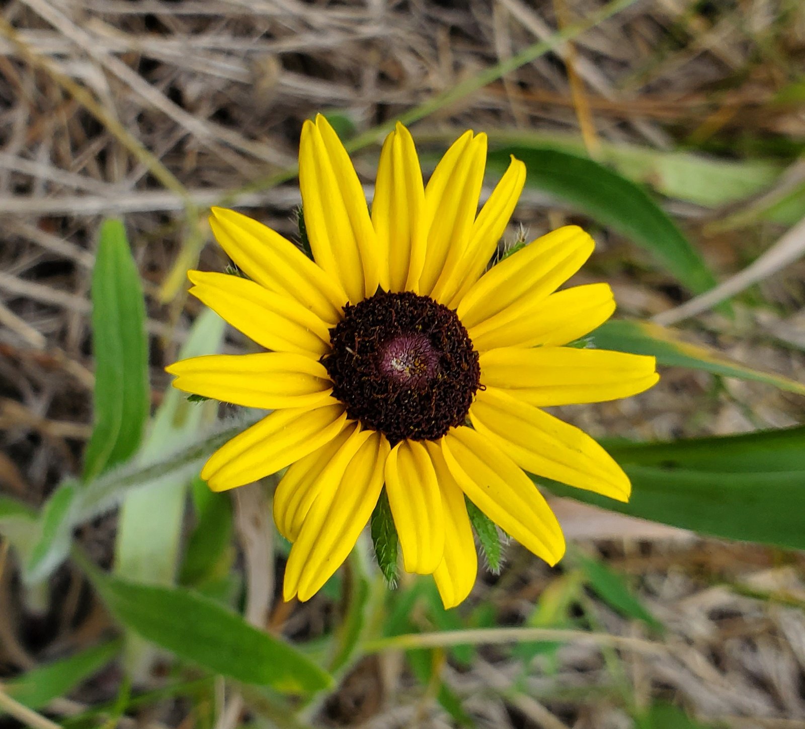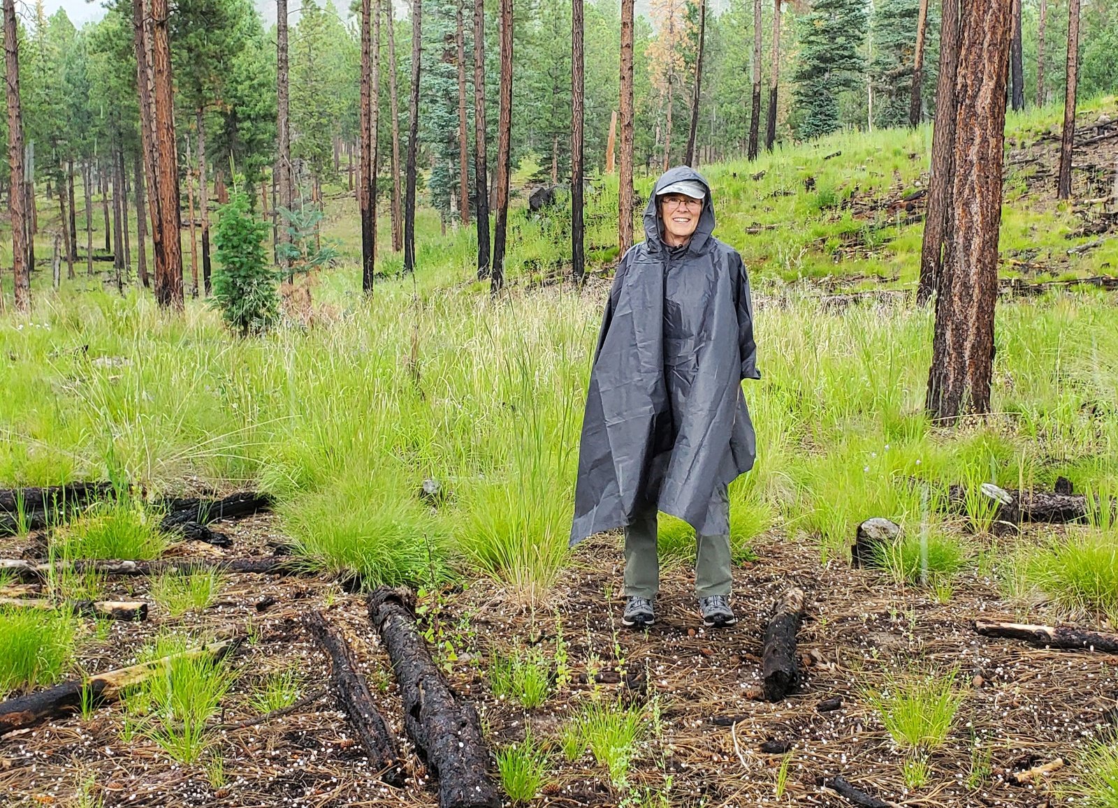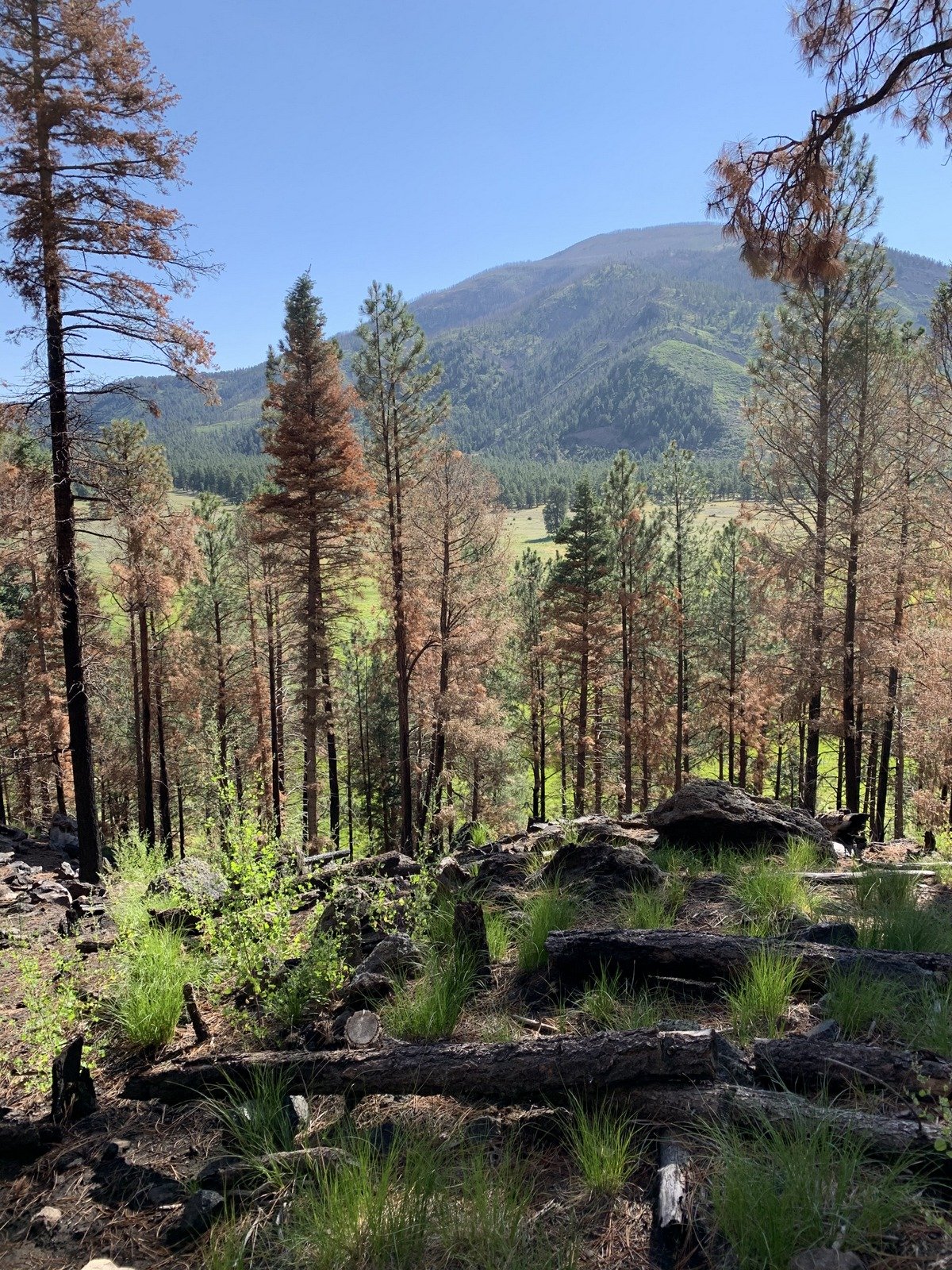 We proceeded on the 2-track, including a portion that was elevated above the Meadow – shaded and offered a great view down into the Meadow. From that vantage point we spotted an interesting feature, a circular area of burned grass, in the center a burned tree trunk. Looked to us like a lightning strike.