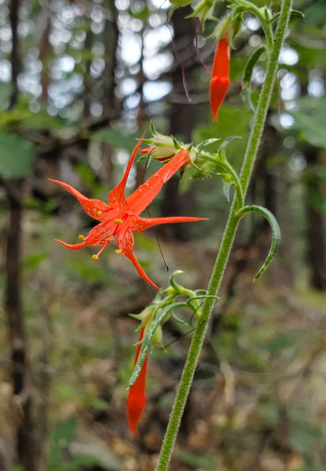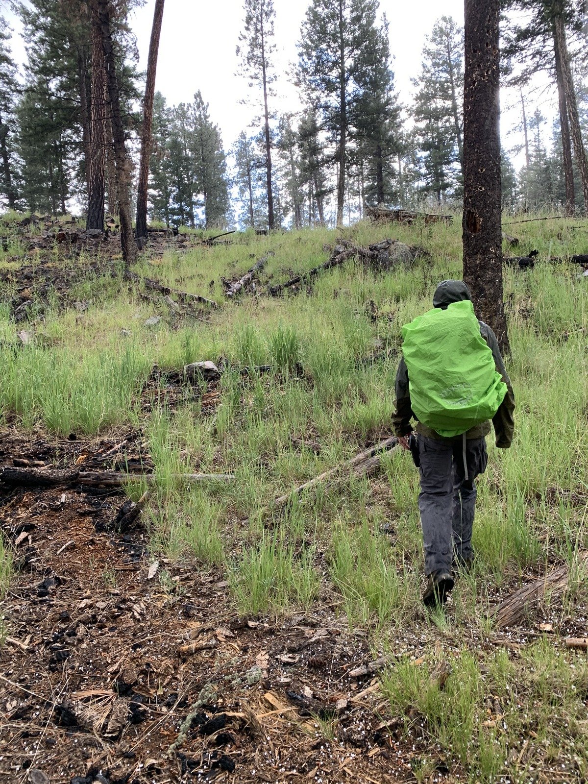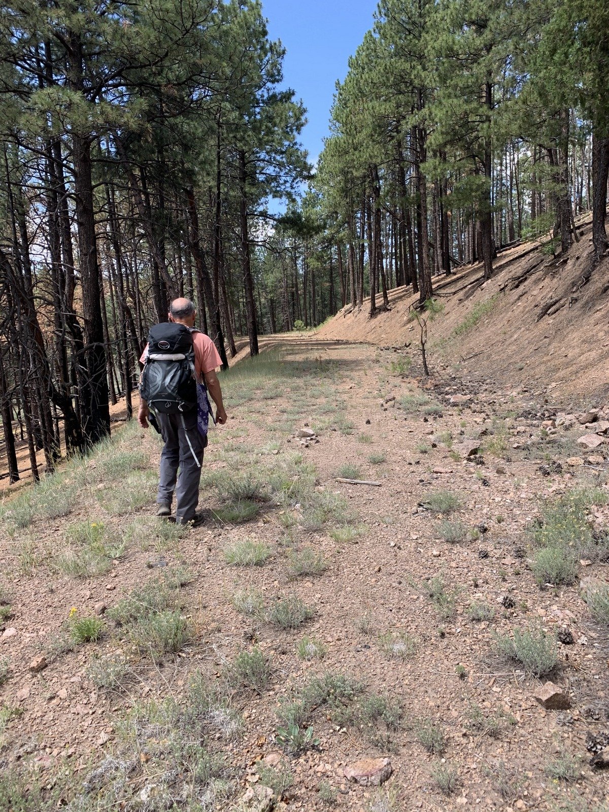 Following the bearing towards our intended descent, working our way around steep climbs onto mounds or ridges in the topography of Banco Bonito, we soon came across a 2-track (Class 5), likely an old logging road. We followed it for some distance, but when it turned away from the bearing to our waypoint, we were again bushwhacking. (Note: Bushwhacking is not an accurate description for transiting this forest; the forest is open, likely thinned in recent years with virtually no undergrowth – very easy hiking.)