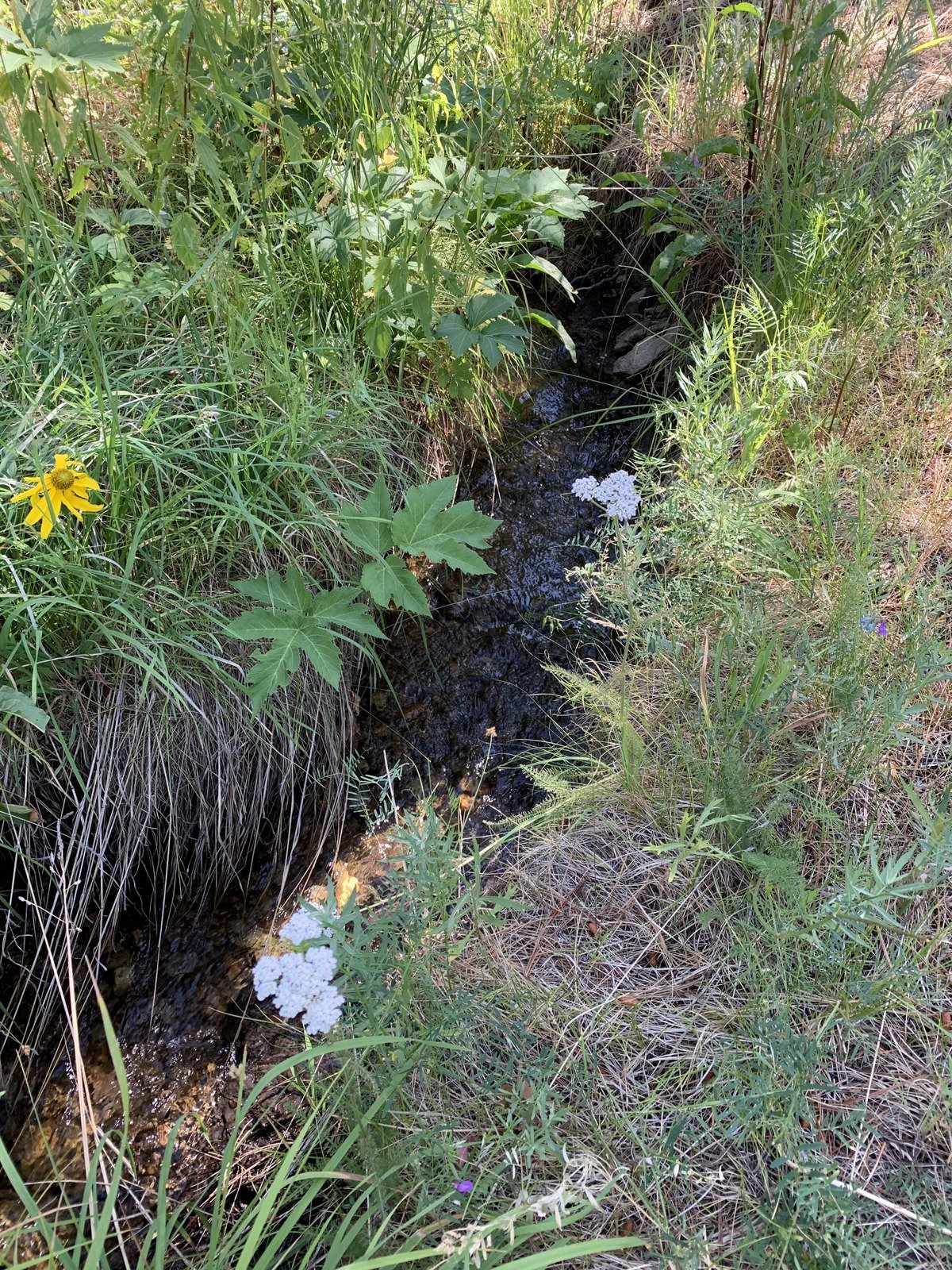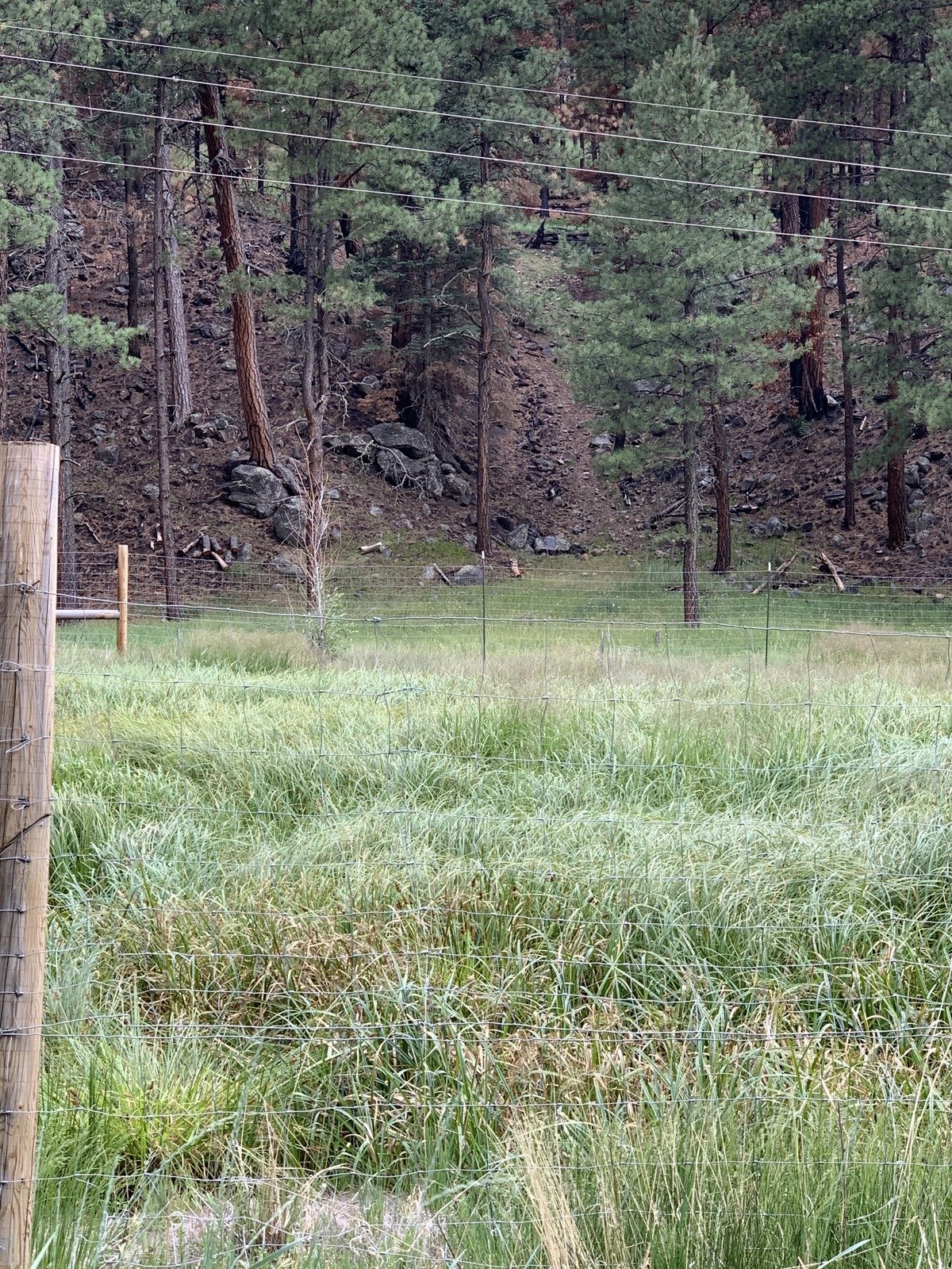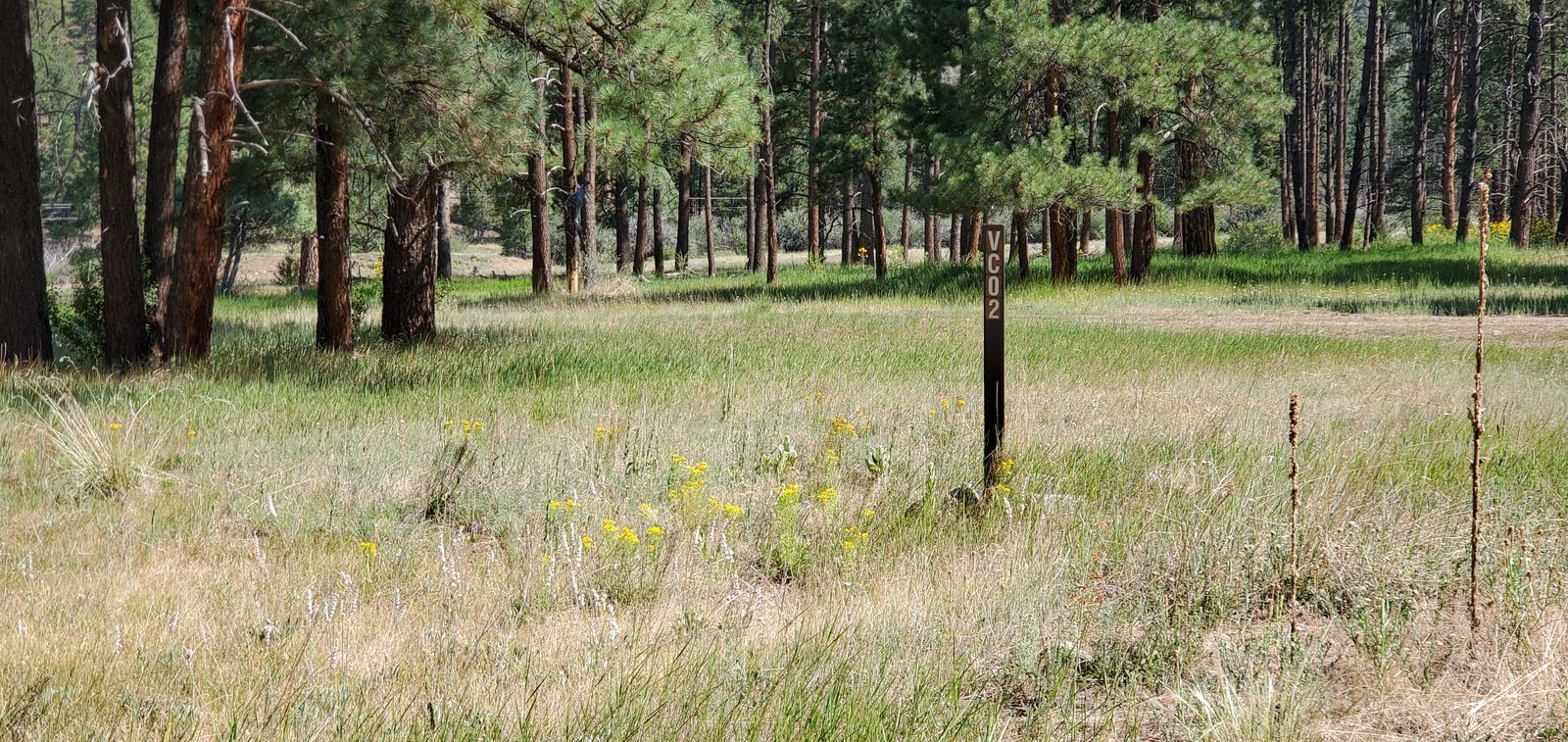 Looking to cross the Meadow, we saw tall, very green grass, an indication that it might be marshy. To avoid a wet crossing, we worked our way to the right where the apparent marshy area was narrower. That proved to be dry and easy to cross. (As we started across the Meadow, we spotted a coyote near a pair of ponderosa pines. As we approached, it moved off 100 yards or so and began barking. Concerned that it was protecting something nearby, we skirted away from it and went about our business. More on this in the post for the next day’s hike.)