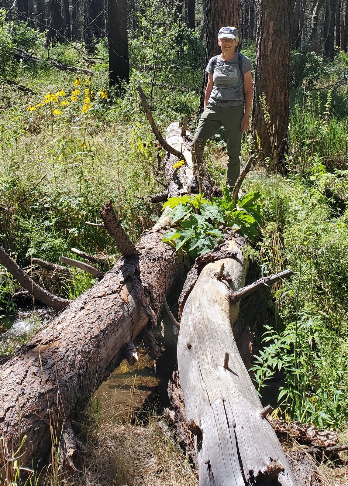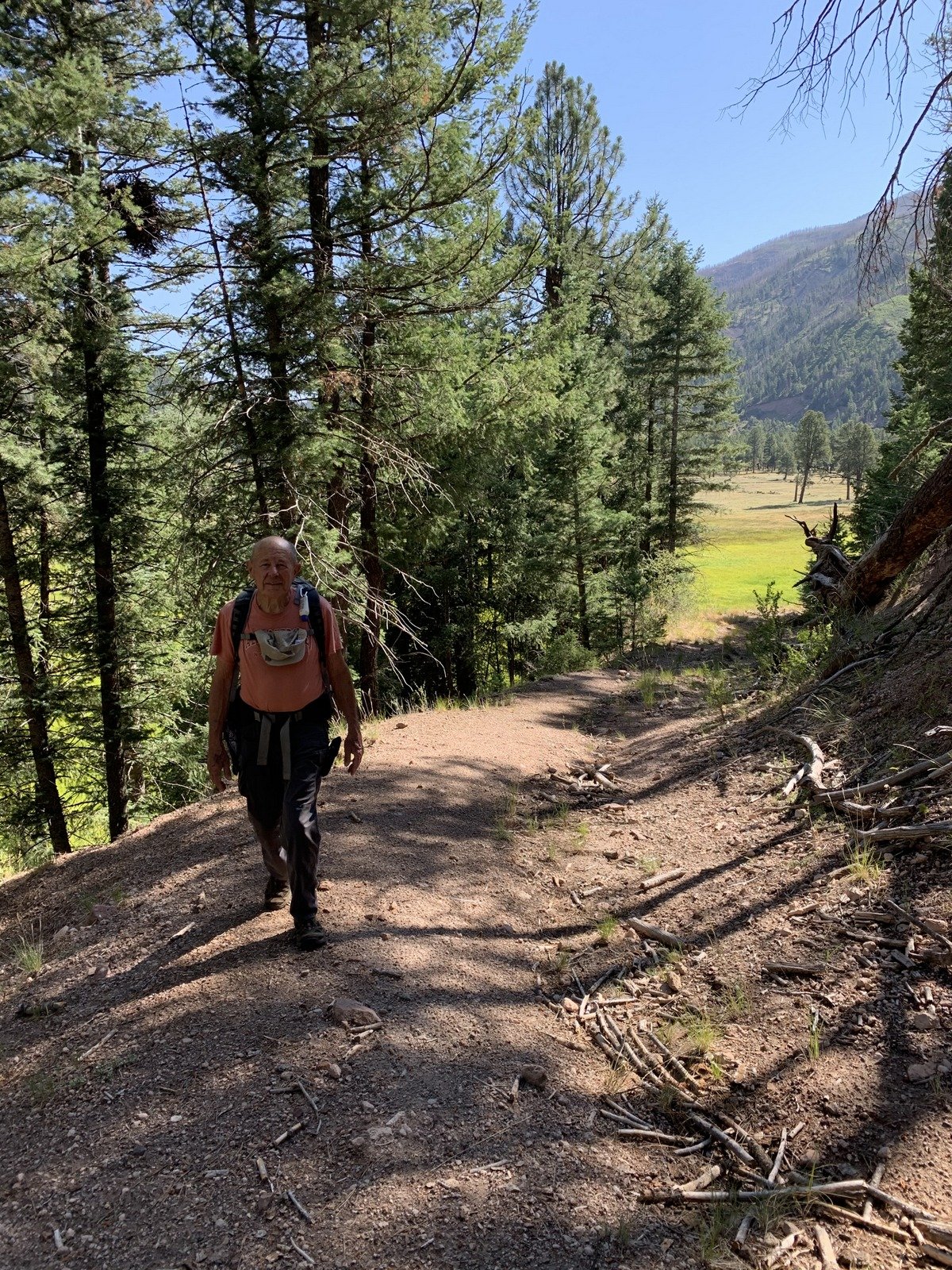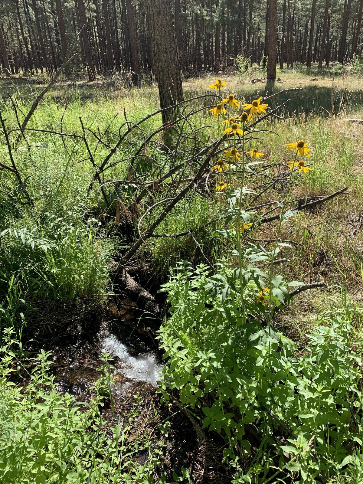 We avoided going directly across the Meadow – it appeared to be a marshy area. Taking a bit of a detour, we crossed in deep but dry grass and headed up Redondo Creek on level and flat ground through open forest. ‘Tho we crossed a 2-track going in our direction, we kept our course, crossing Redondo Creek 2 or 3 times, then hiked along the stream until scrub oak and other bush-type plants made further progress difficult. We stopped for our mid-hike break, then “whacked” our way to the 2-track and started back towards the campground.