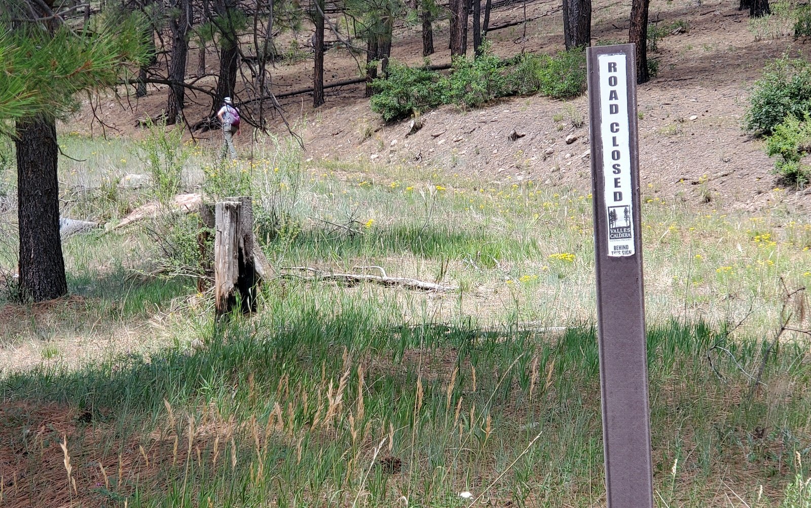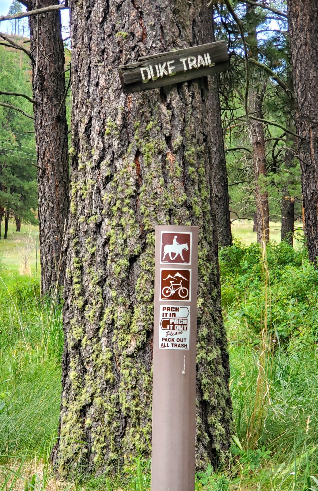 Nearing our waypoint, we came upon another 2-track leading towards the edge of Banco Bonito. Upon investigation, we found that descended to the floor of Redondo Meadow; very nice. At the base of the descent we found trail signs, a couple of yellow-topped posts with arrows and on a tree, “Duke Trail”, and information that this is an equestrian and bike trail going up the 2-track.