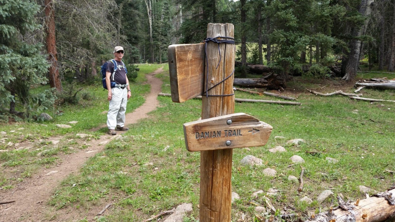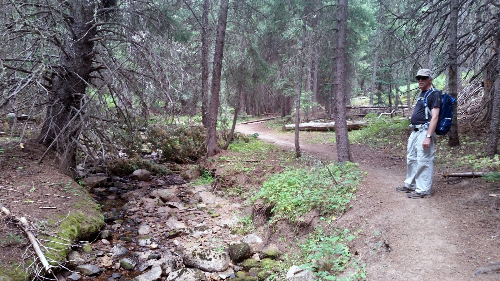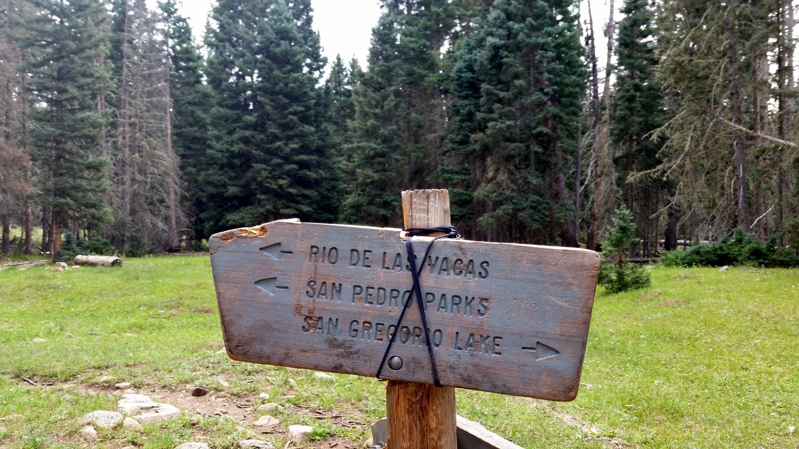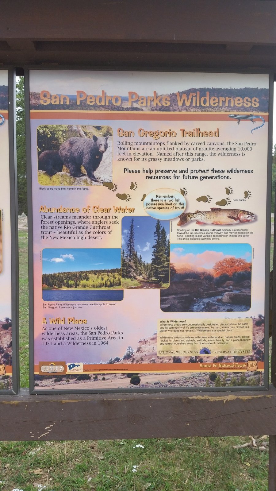 We opted for the Vacas Trail (#51), starting at the San Gregorio Lake trailhead as our first outing in the San Pedro Parks. This looked like an easy trail and closest driving distance from Bernalillo. It appears to be quite heavily used, relatively level on easy walking surface. Its pretty much a steady climb through open woods, past the San Gregorio Reservoir. We turned left some distance above the reservoir, at the junction with the Damian Trail to remain on the Vacas Trail, continuing up Clear Creek (which had a trickle of water running). We stopped for our mid-hike break, at 3.44 miles, at the junction with other trails in the Wilderness.