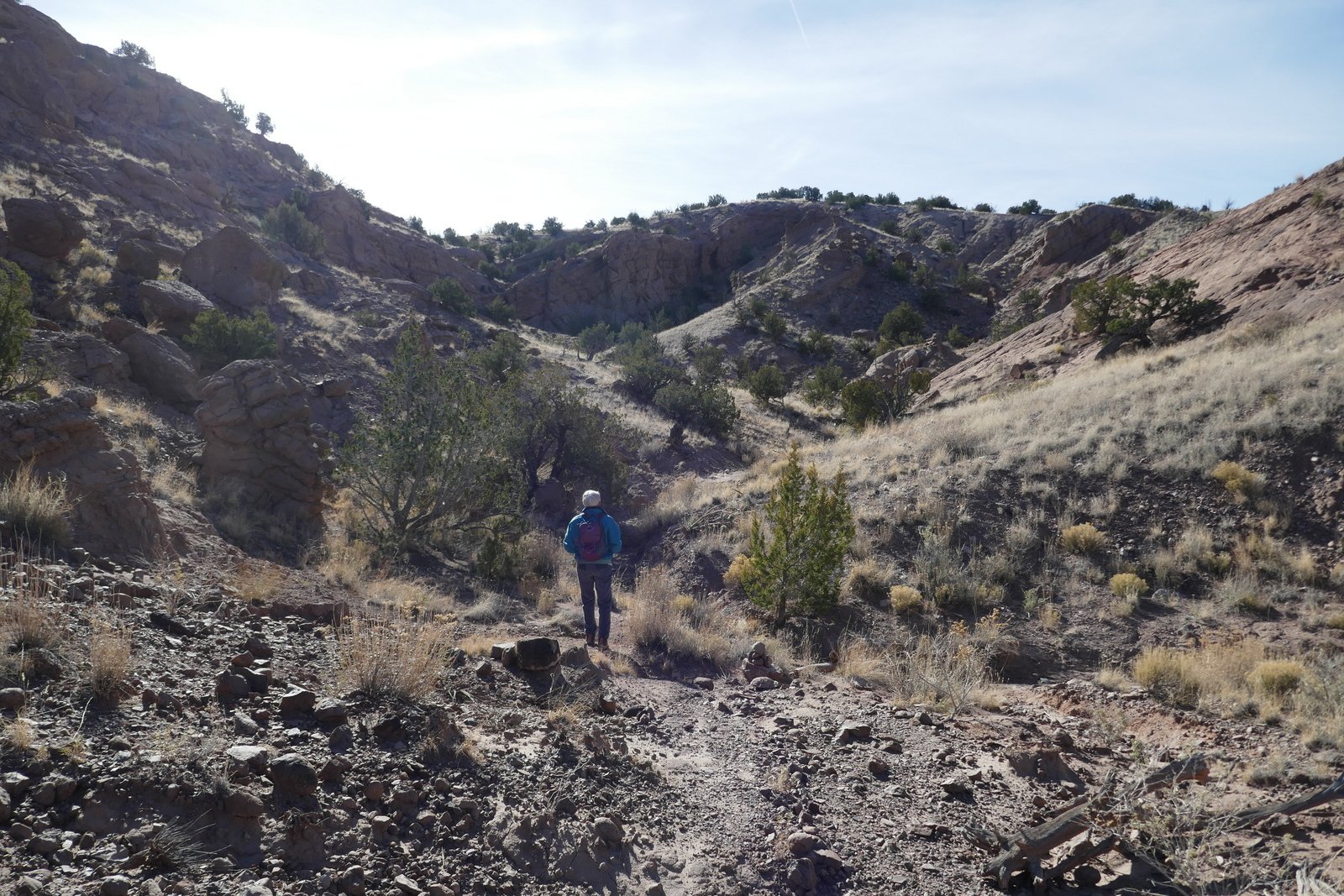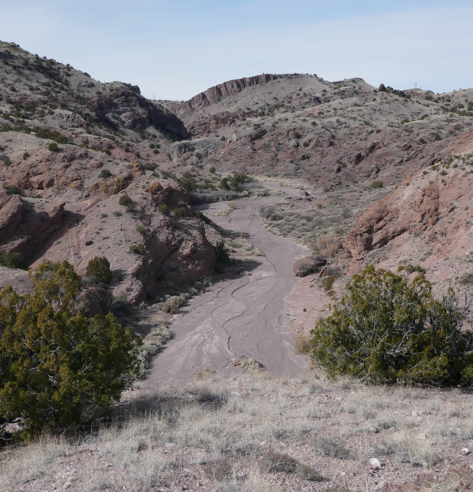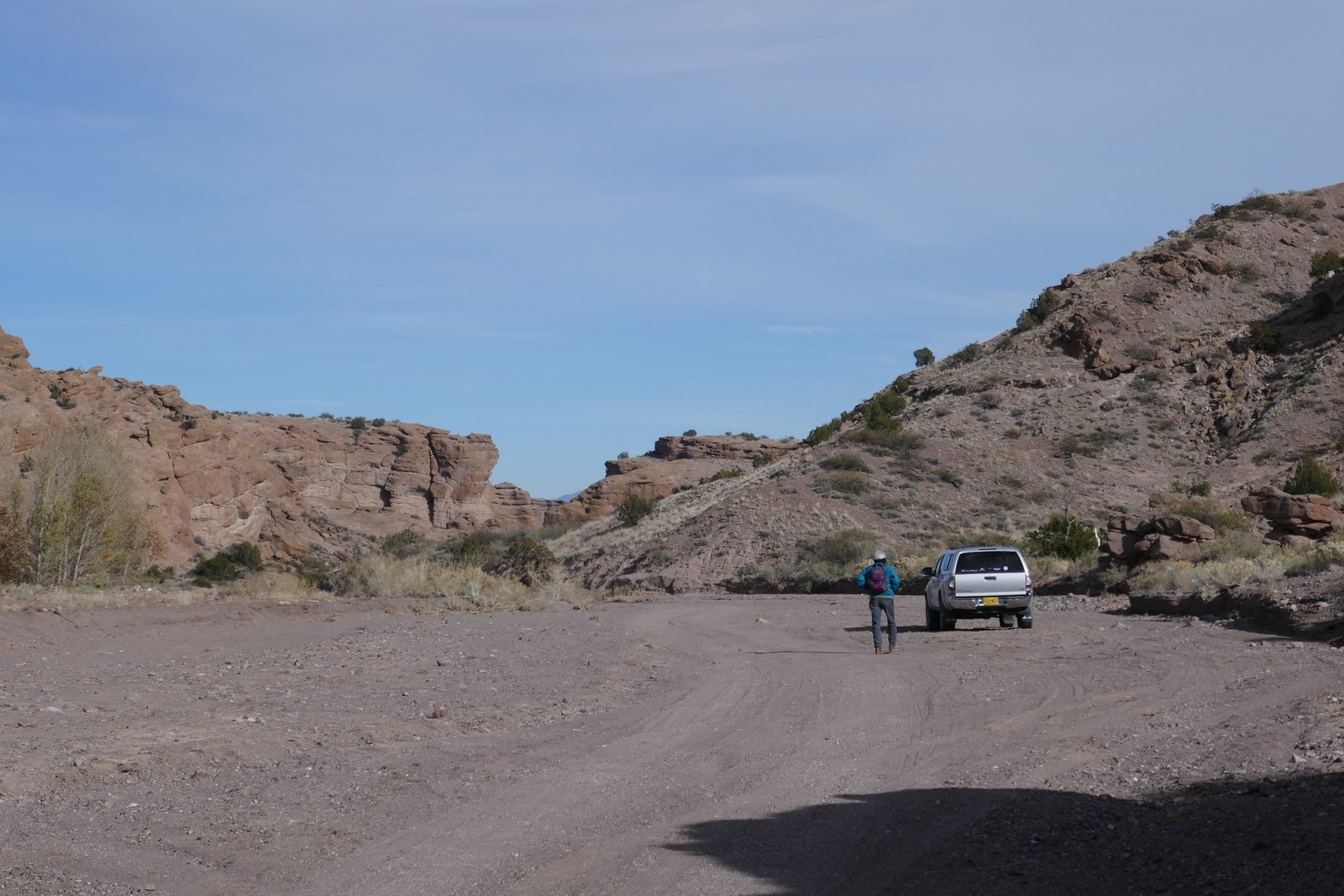 Tis winter, and again for this hike we choose territory without lots of trees, reserving such shaded areas for summertime hiking. I visited San Lorenzo Canyon back in 2014 with Vince, and thought there must be more to explore, so headed down Socorro way with Pat on this chilly winter day.