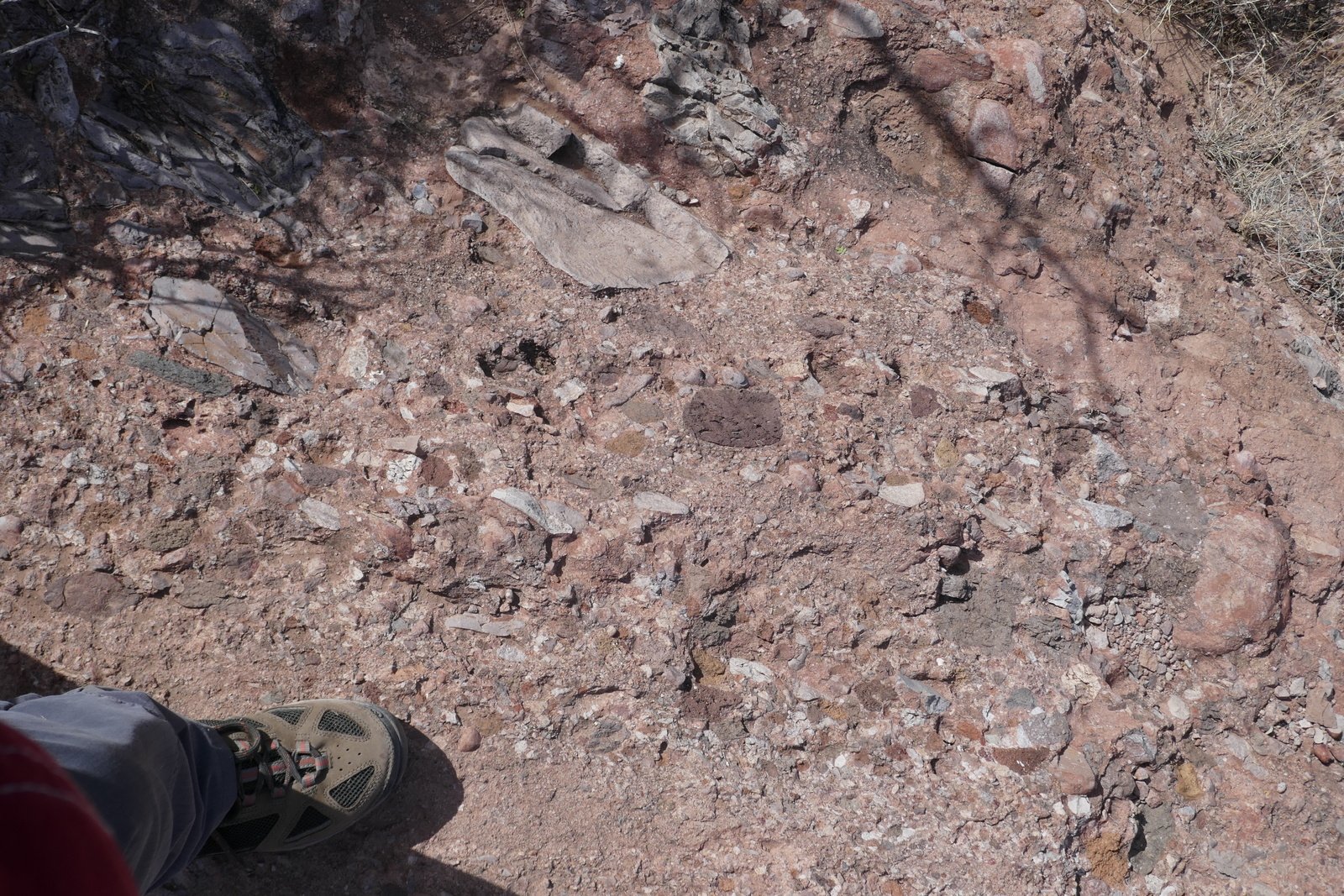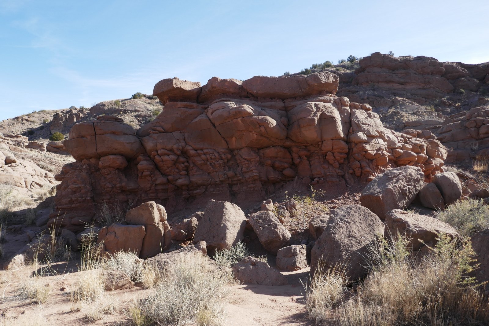 The geology (rocks) hereabouts are quite different from other places – they look mostly like large globs of mud – rounded, dark brown, but quite hard. The surface is mostly gravel and sand with a sprinkling of stones and small rocks, sometimes loose, sometimes embedded in a matrix of sand. ‘Tho there were footprints in the wash of the canyons, we didn’t encounter anything that appeared to be a trail (although at times we did follow a game trail).