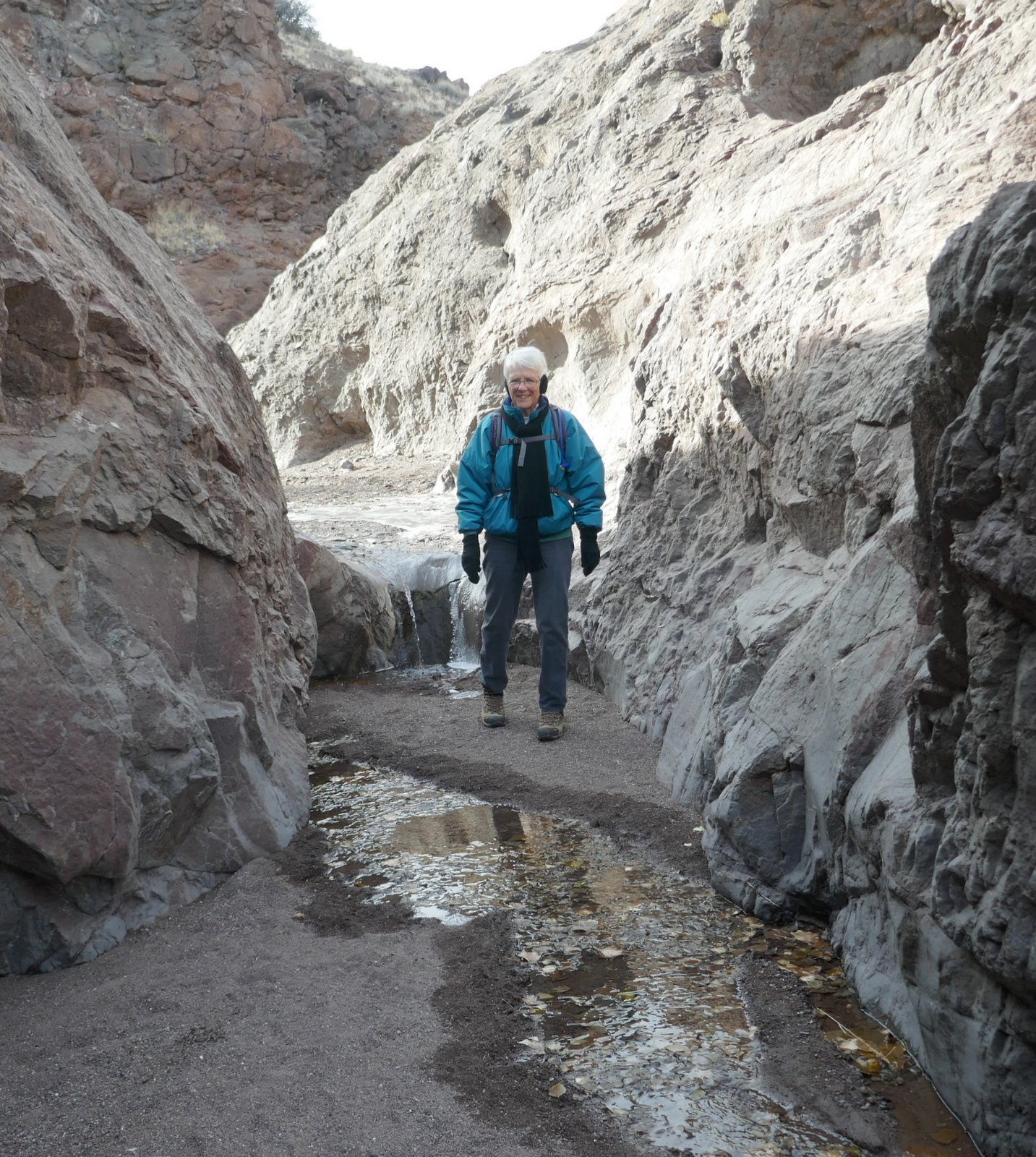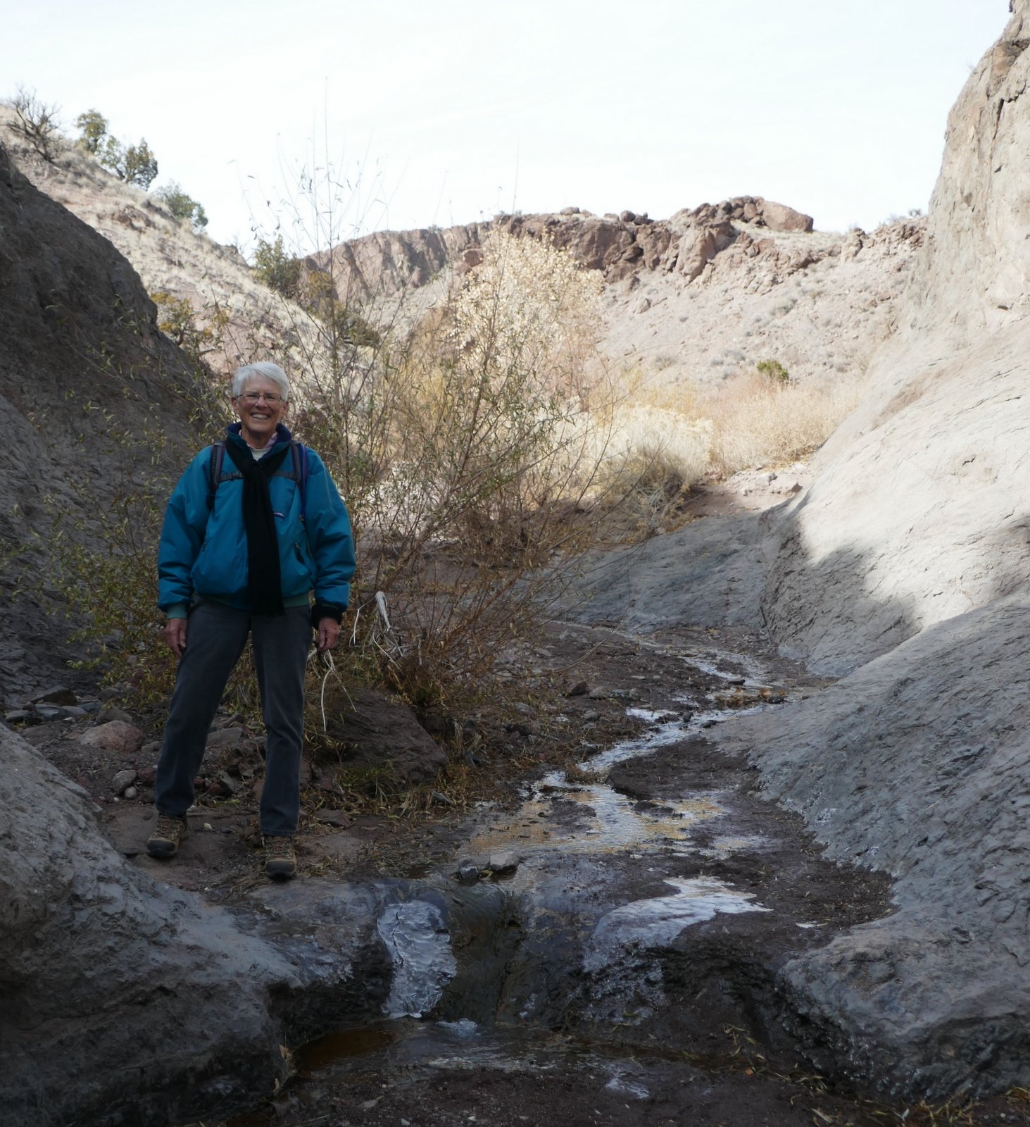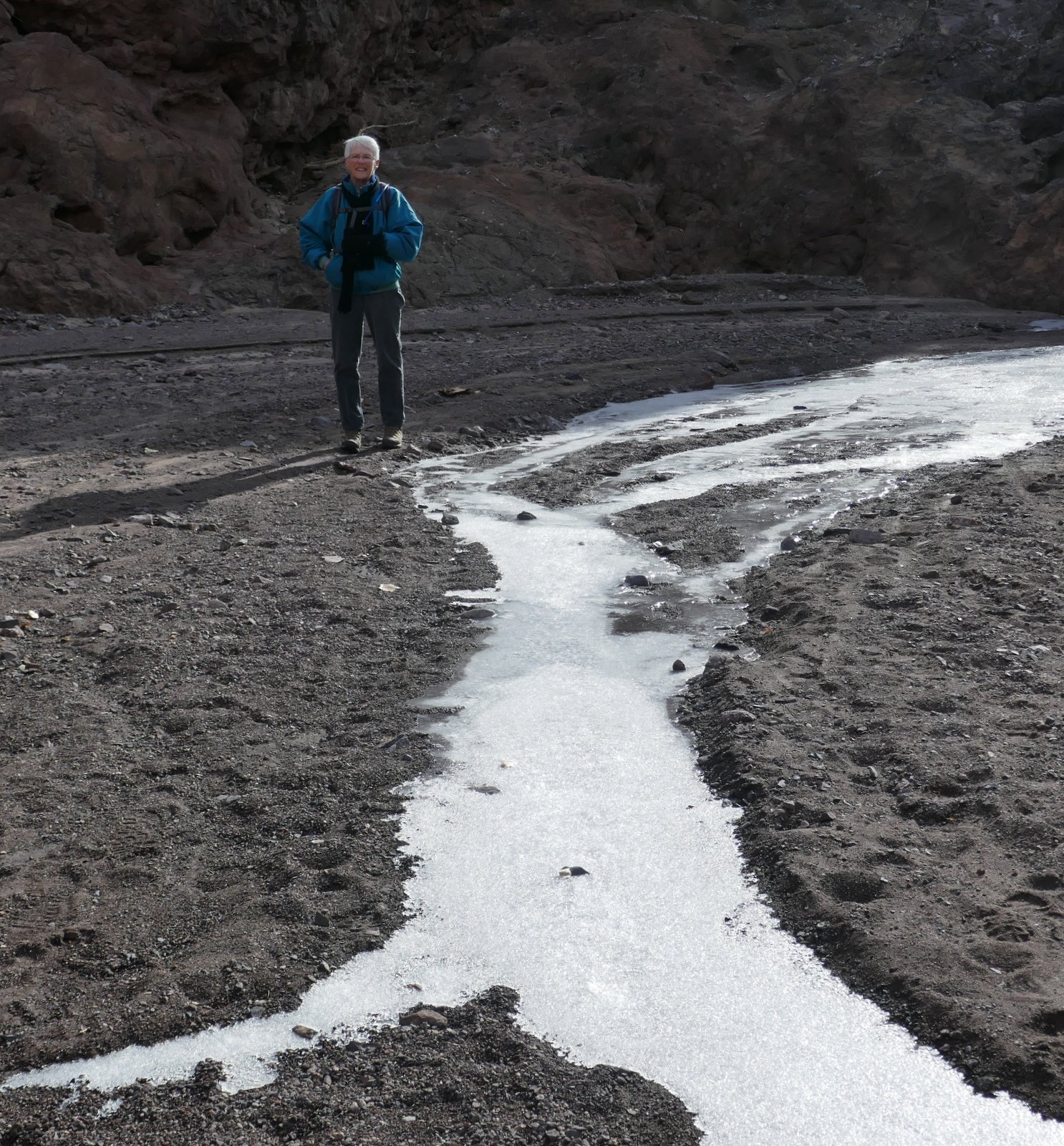 Now atop the mesa, we proceeded up-canyon to see if we could descend back into to the main Canyon, above the aforementioned rock that blocked us when driving. After a couple of look-sees over cliffs, we saw ahead a more gradual slope down to the Canyon floor. It was an easy descent; we then proceeded further up the canyon where we encountered a rivulet of water (with a skin of ice over the running stream). It seems we had come upon San Lorenzo Spring (per the Topo map). This made a nice place for our mid-hike break – in the sun and protected some from the light breeze of the day.