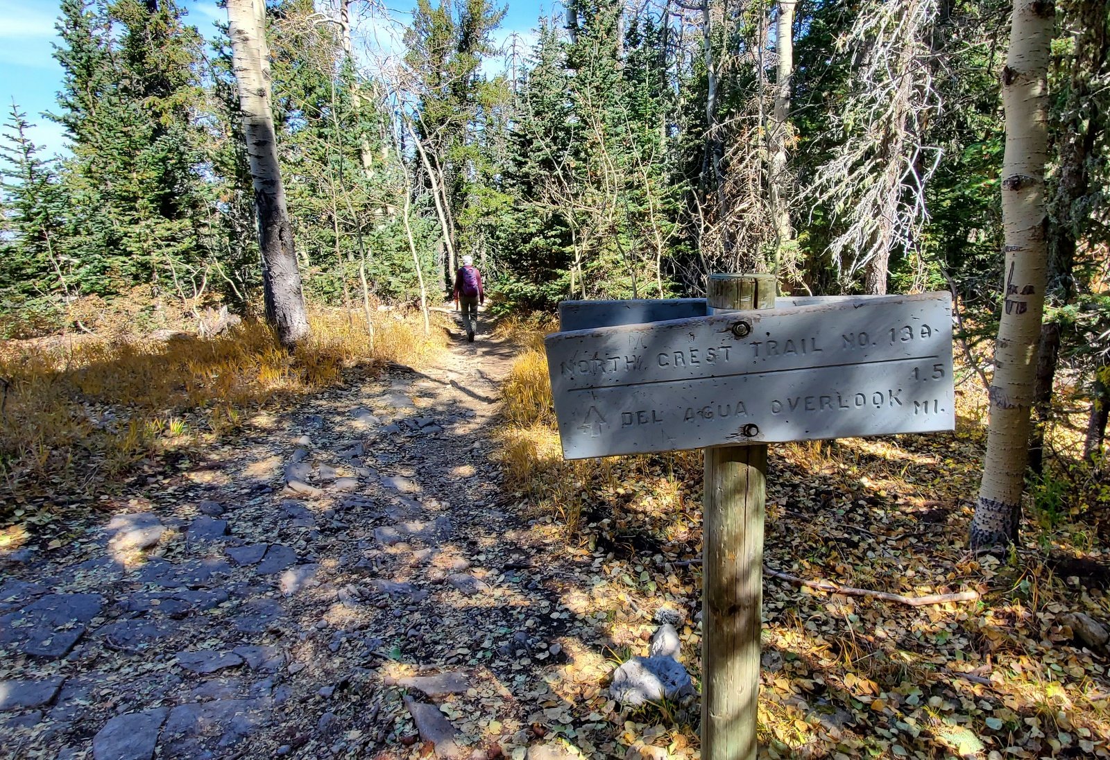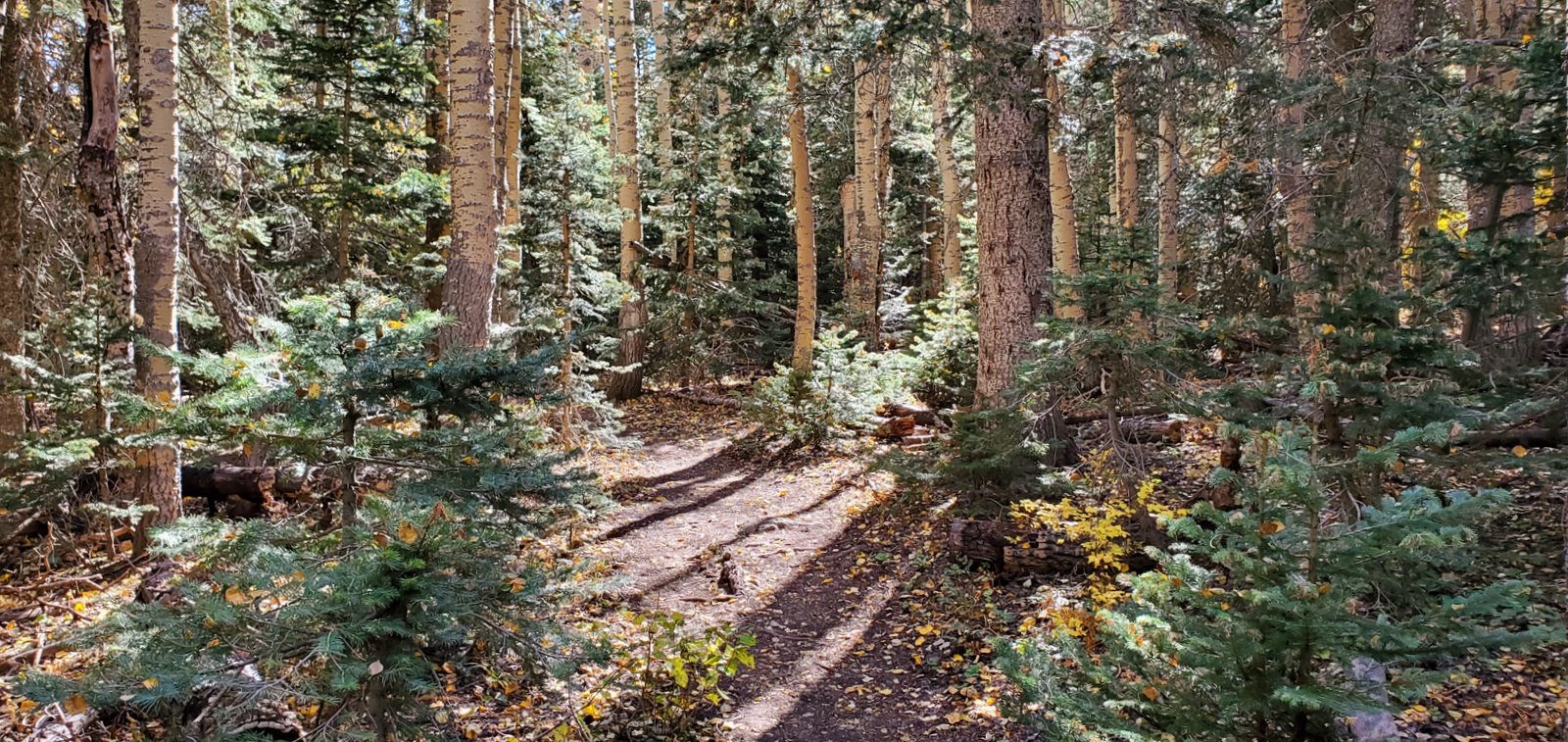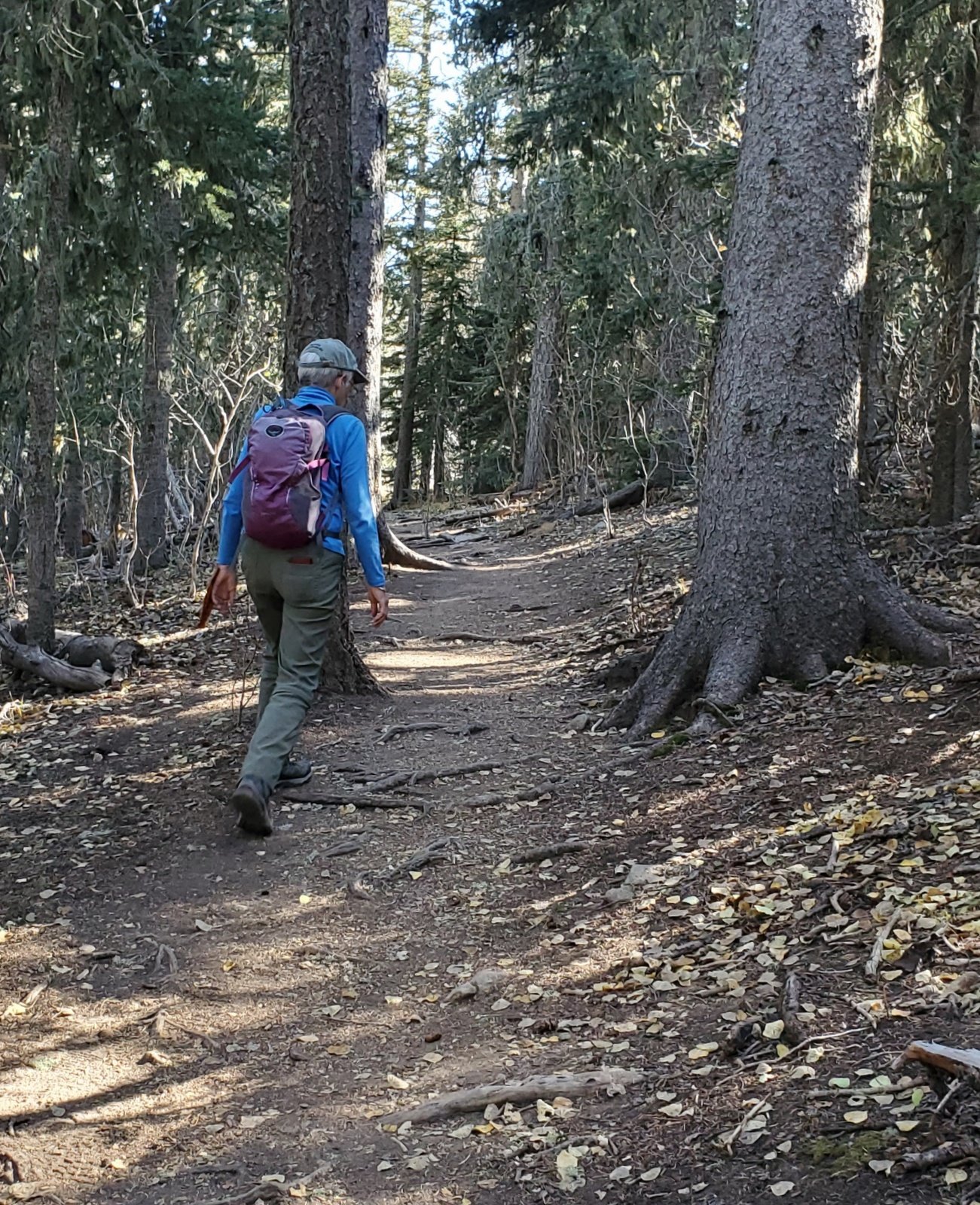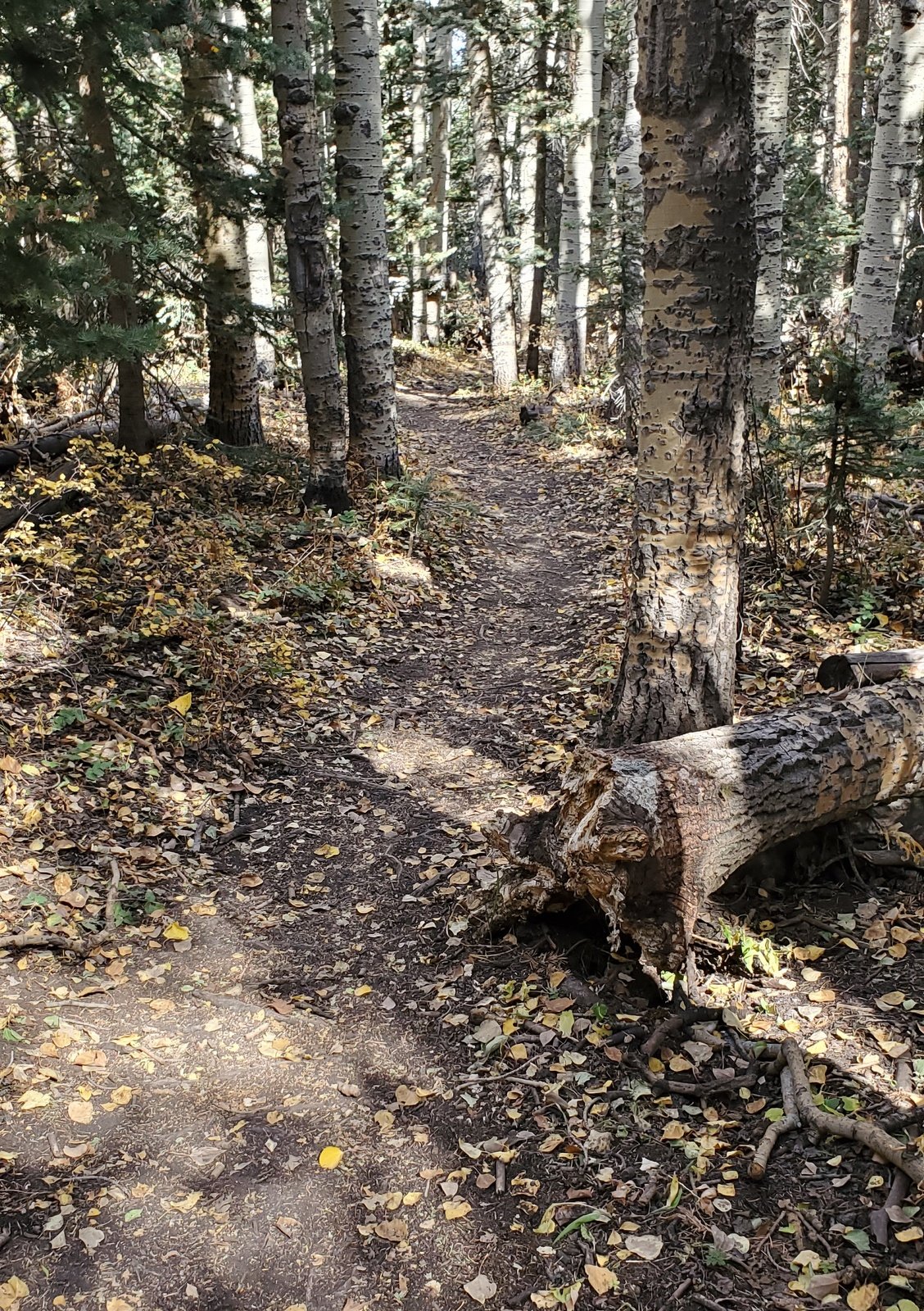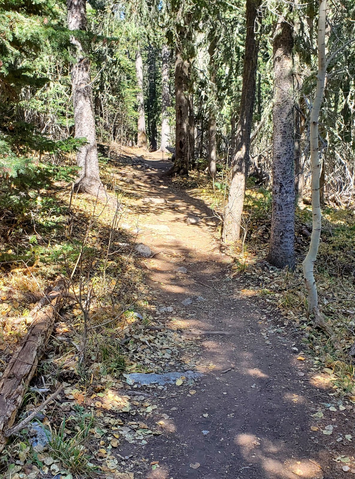 a view of aspen in full color. The trail descends almost all the way, from 10,645 ft to 9,950 ft at the Overlook. The surface is in places rocky (solid, not loose) and in other sections a dirt trail surface, often covered by aspen leaves that had fallen.