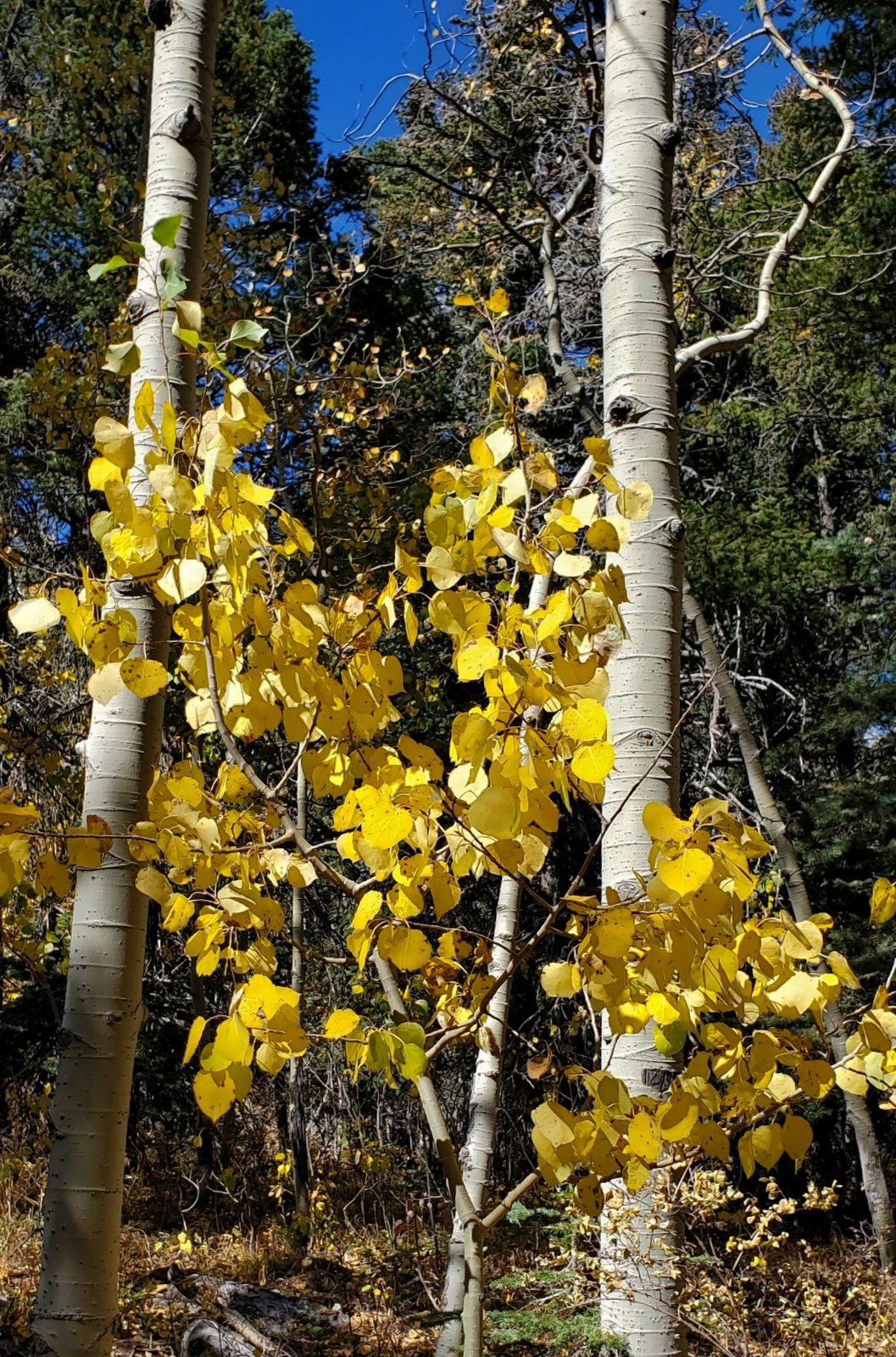 After having lunch at the Overlook, we headed back in a mid-late afternoon sun. We took advantage of that light to enjoy some of the aspen along the trail that still had their leaves. They were so very bright against the clear blue New Mexico sky, almost like they were being lit from within. So we got a taste of aspen in the autumn.