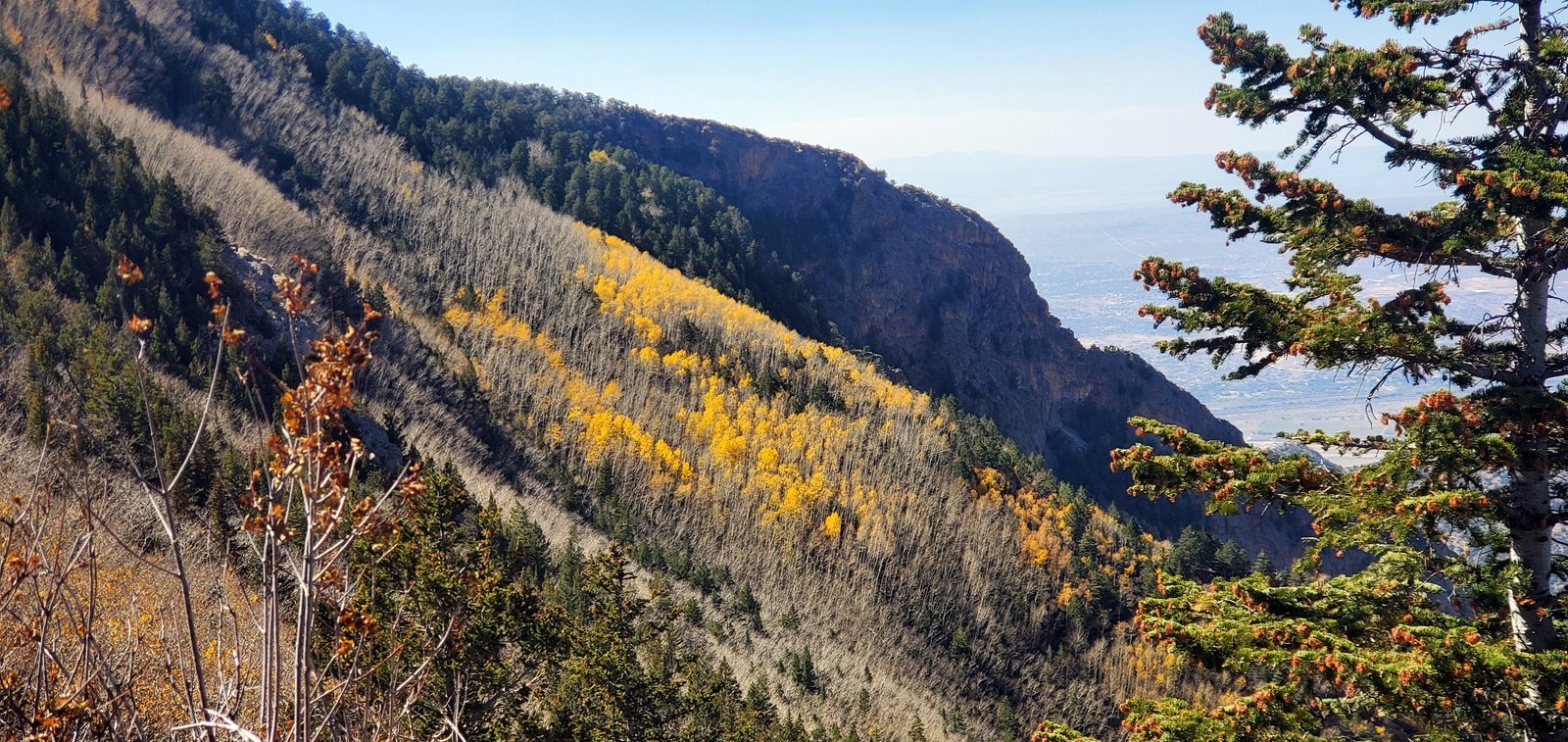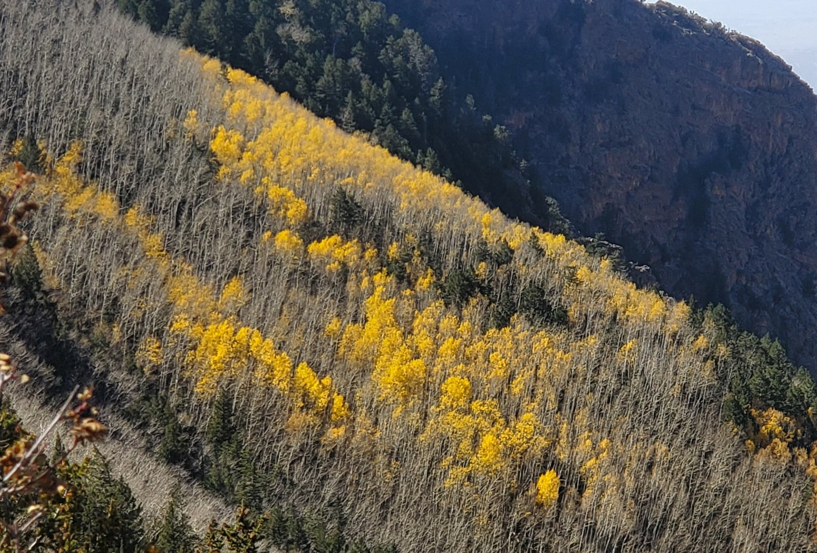 lready fallen. This did not bode well for the destination view. And … sure enough, most of the slope of North Sandia Peak was bare aspen, except of one section in the middle that still had some color.