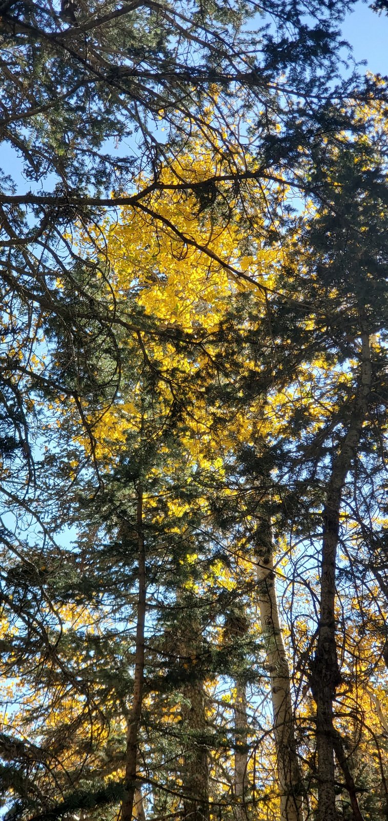 Along the way we could see aspen along the trail, some in bright color but many already turning “dirty yellow” or the leaves had a