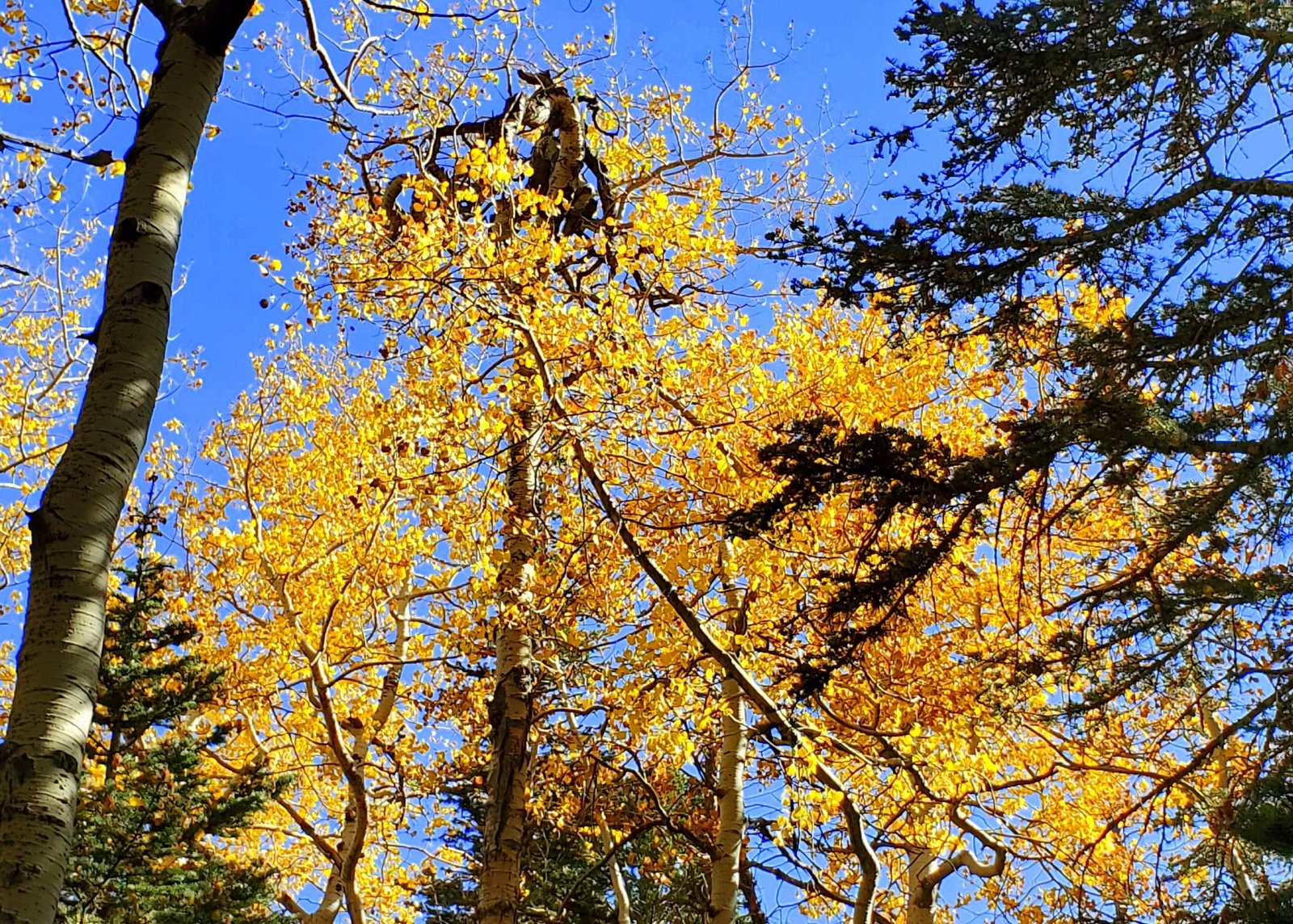 ‘Tis autumn when the aspen forests “bloom” in bright yellow. The northwest slopes of North Sandia Peak have a large forest of aspen. Back in 2017 we hiked the North Crest Trail hoping to catch them in full glory – we were late. This year, we again attempted to see the spectacle – but again we were just a bit late. Next year .. ??