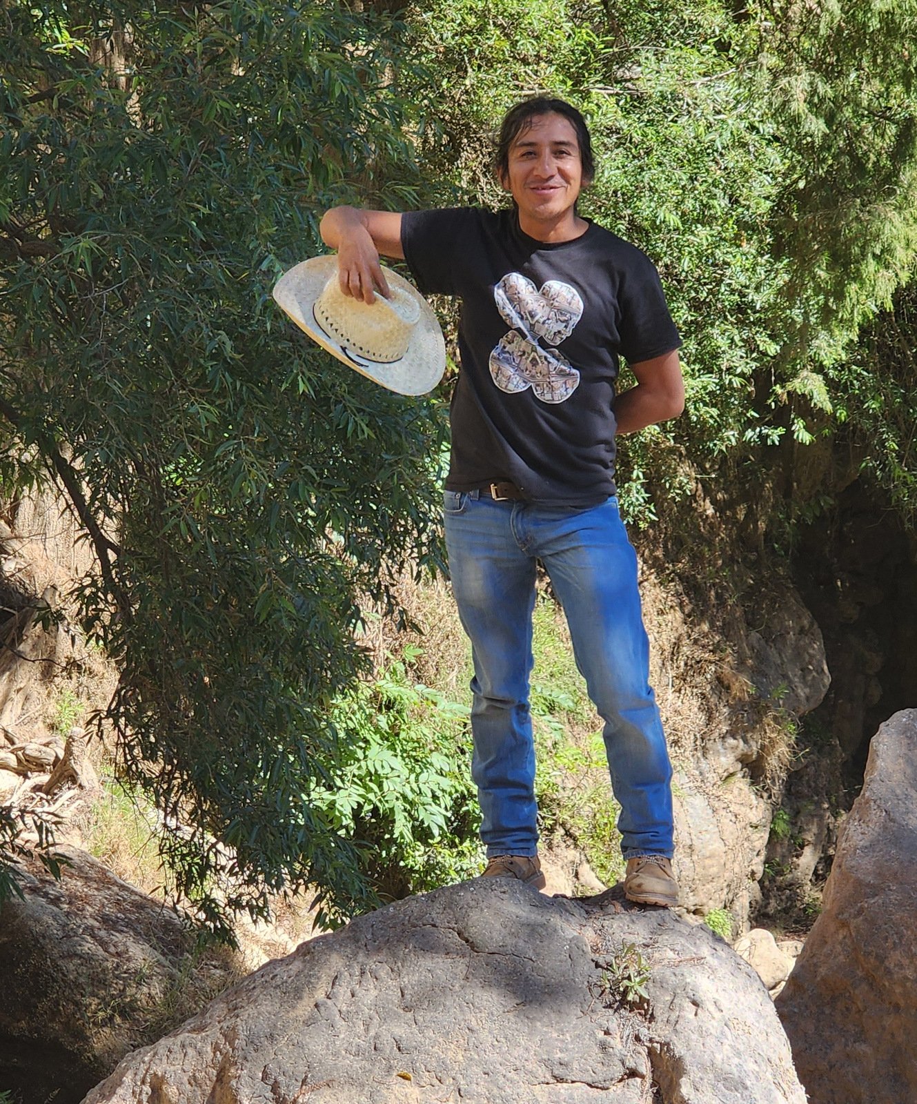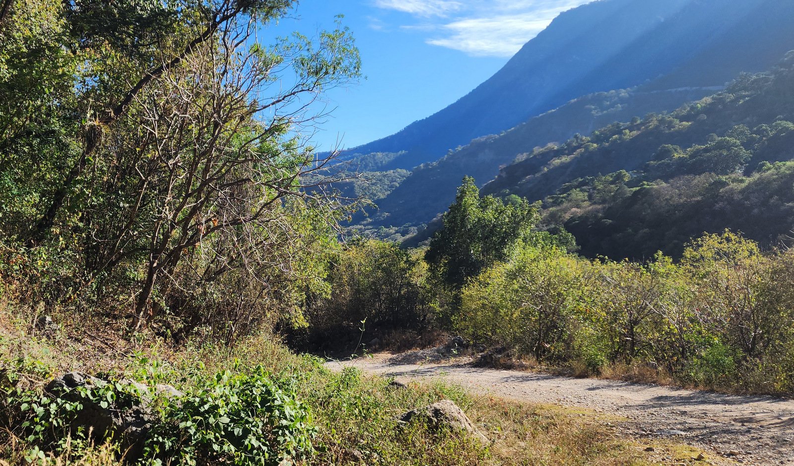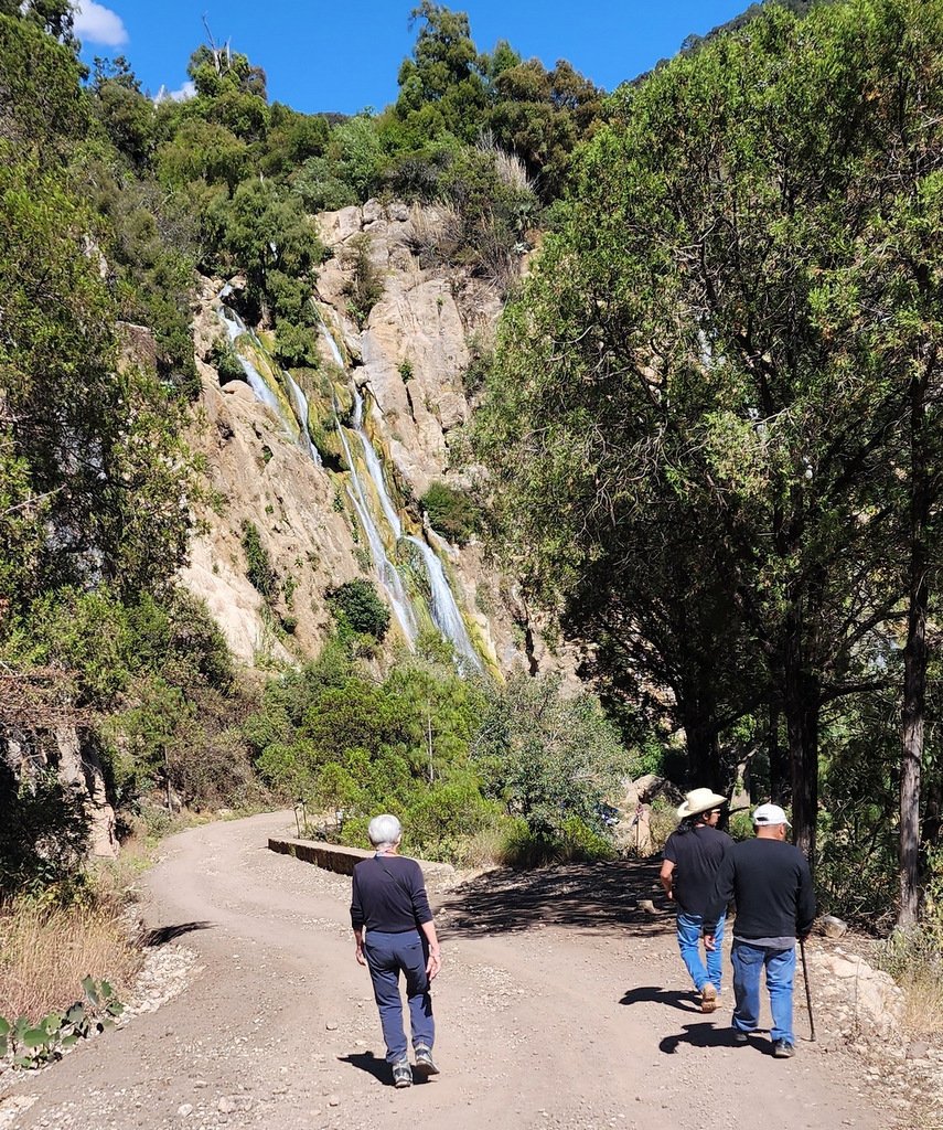 A short distance after leaving the ridge from Yosondúa, we stopped to take in Cascada Esmeralda, a group of waterfalls, (see below). From there, we continued on down to the river, crossing it, and climbing onto the plateau on the other side. The destination – Casa de Los Venados y el Mezcal Nerbasanta Yosondúa. This is first a refuge for venados (deer) but is also a palenque (distillery of mezcal). From there, heading north back towards Yosondúa again along a steep slope down to the river, we passed near Edilberto’s village where we could see farmland on this extensive plateau. To return to Yosondúa we crossed the river, then up the narrow road on the -steep- mountainside, past Cascada Esmeralda, and to the relatively level terrain to Yosondúa.