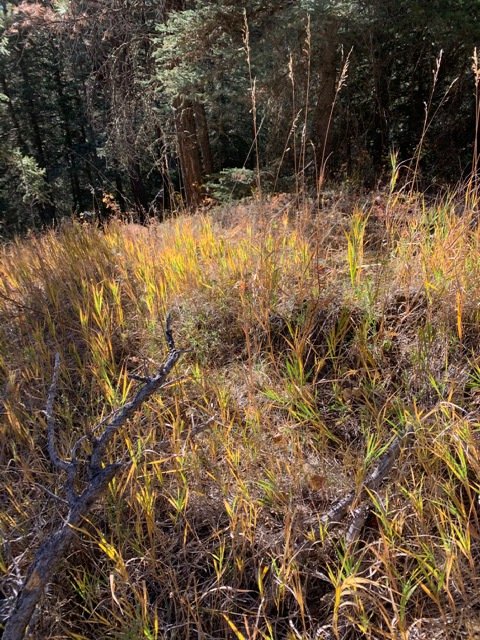 This hike is on a two-track for its full length. Through Sulphur Canyon it presents a steady moderate ascent. The surface is gravel and rock typical of a two-track in active use – it has seen heavy use recently as a crew has been thinning the forest along the road. After turning into Alamo Canyon the road is less used, in some places covered over with grass.