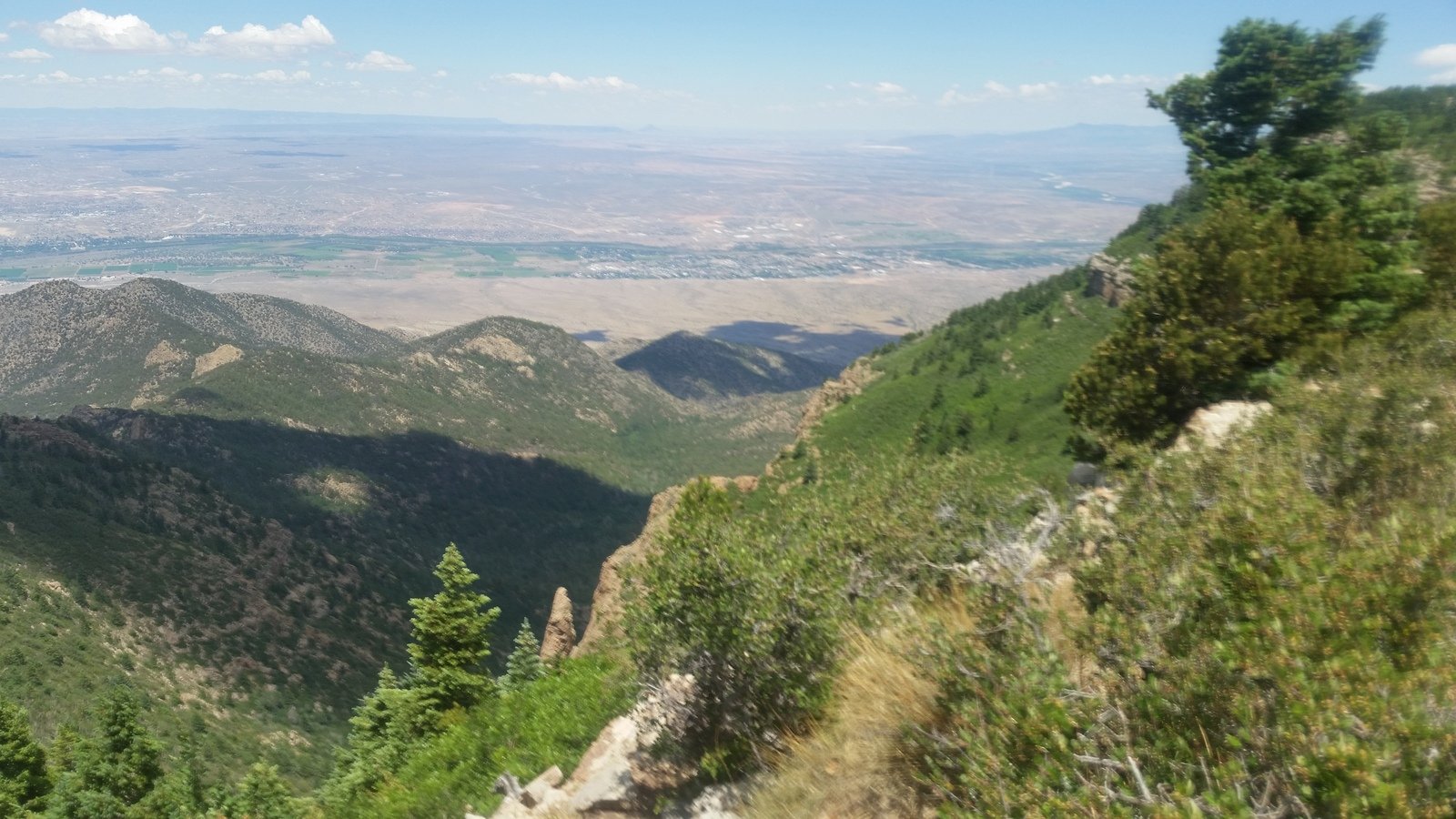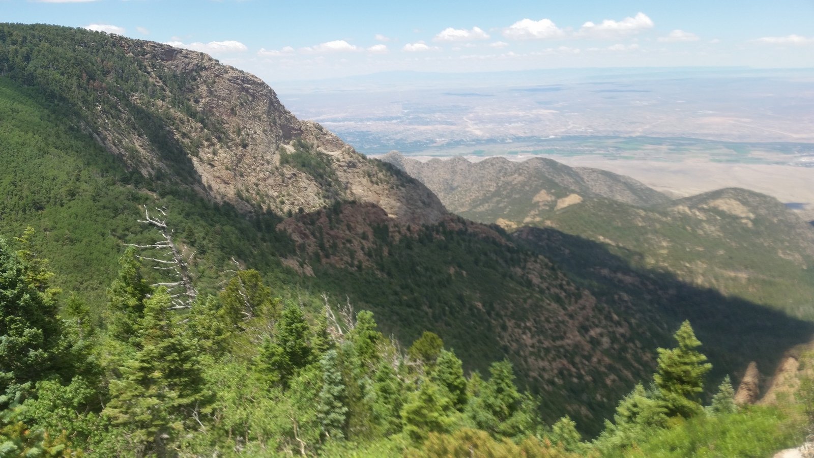 We continued on to the end of the Survey, then turned left onto the Osha Loop Trail, then left onto the Sandia Crest Trail, where we had the only scenic views on this hike – a vista from the north slopes of Sandia Peak clockwise, north to the Rio Grande valley and Jemez Mountains. We continued southward to the intersection with the 10K Trail, then the Survey to return to our car.