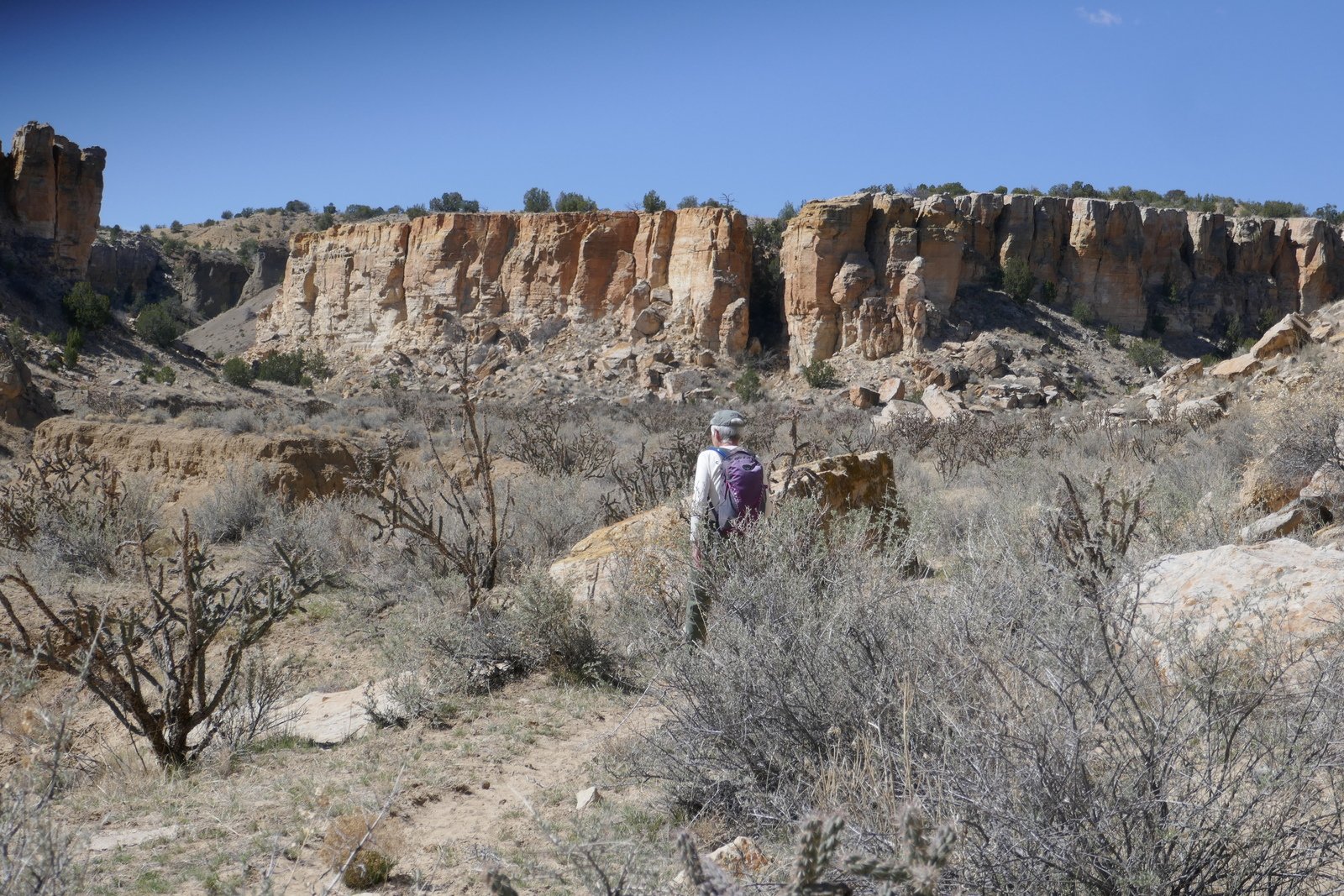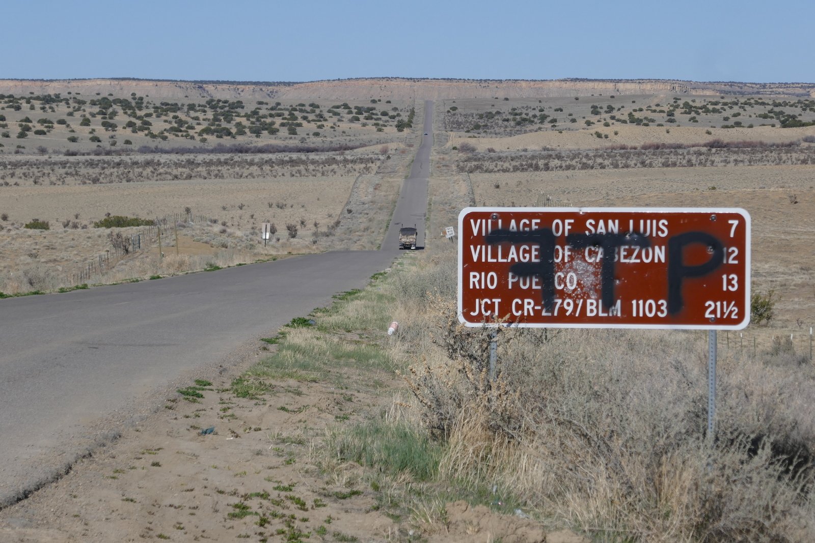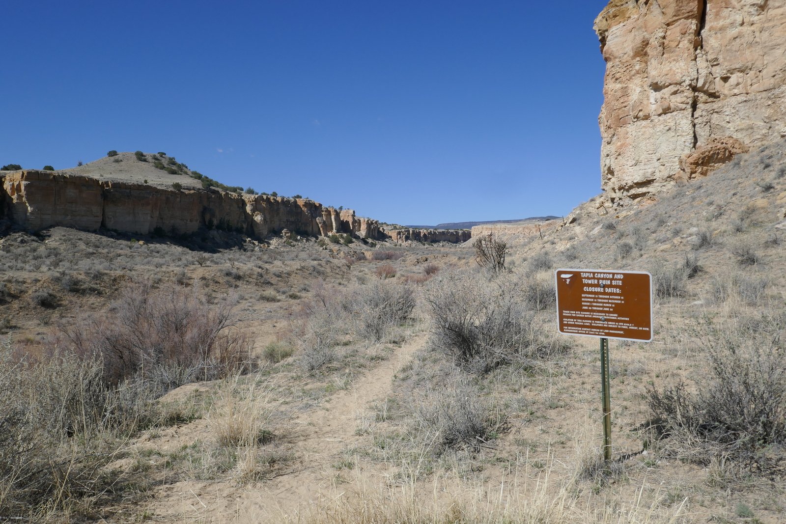 The drive in is straightforward: US 550 to CR 279/San Louis Road. Continue through San Louis, stay on 279 as it turns from pavement to a Class 3 road (‘New Mexico pavement’), about 8 miles. Resist turns at 11.5, 16.8, and 21 miles. The road descends into the Rio Puerco valley; along the way it crosses two deep arroyos – the road to the bottom and out is -very- steep .. interesting to drive thorough. At 29 miles from US 550, the road climbs over a sharp saddle, below the Guadalupe Ruins up on the adjacent mesa. From there its .4 mile to the turnoff into Tapia Canyon on a Class 5 road (two-track). Park at the end (there is ample room to turn around).