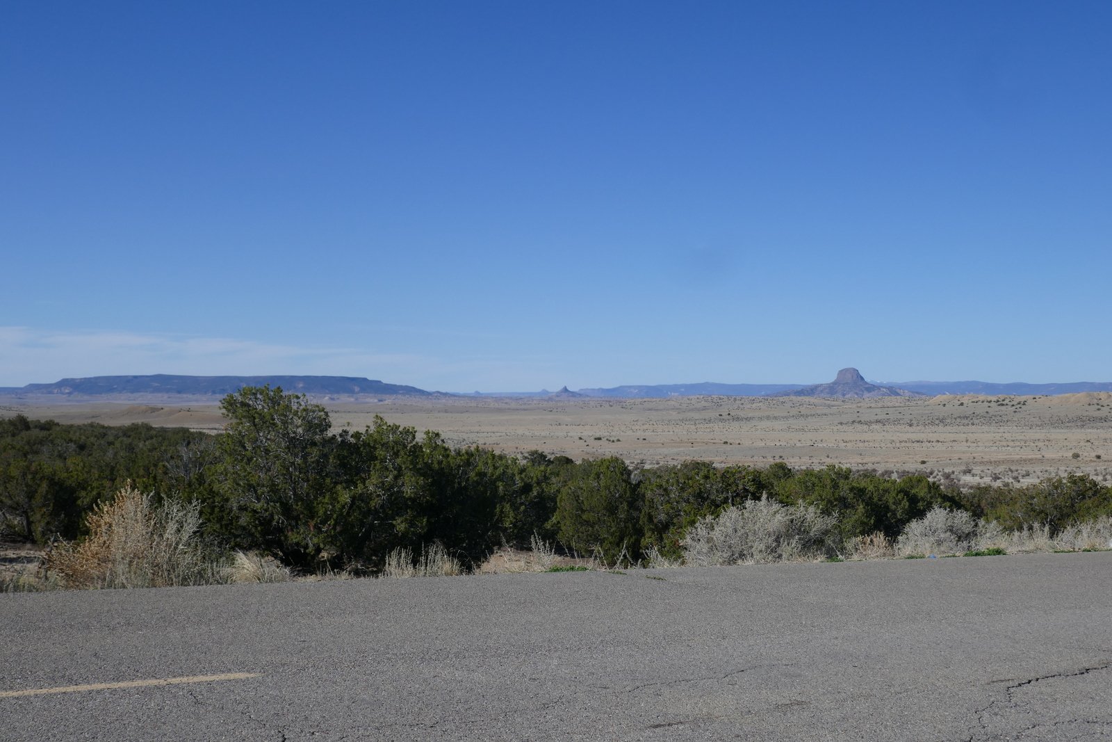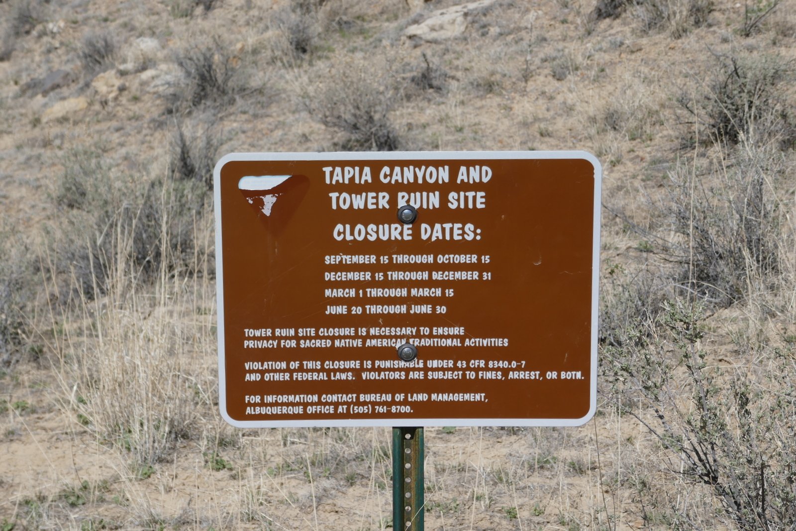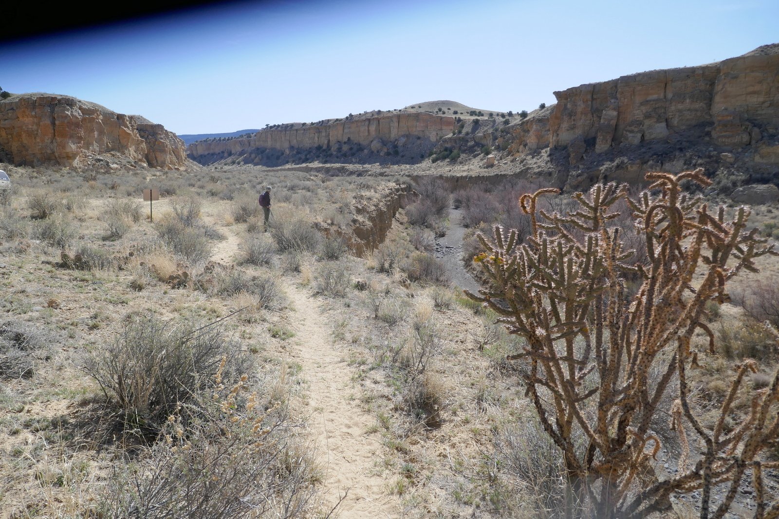 The drive in is straightforward: US 550 to CR 279/San Louis Road. Continue through San Louis, stay on 279 as it turns from pavement to a Class 3 road (‘New Mexico pavement’), about 8 miles. Resist turns at 11.5, 16.8, and 21 miles. The road descends into the Rio Puerco valley; along the way it crosses two deep arroyos – the road to the bottom and out is -very- steep .. interesting to drive thorough. At 29 miles from US 550, the road climbs over a sharp saddle, below the Guadalupe Ruins up on the adjacent mesa. From there its .4 mile to the turnoff into Tapia Canyon on a Class 5 road (two-track). Park at the end (there is ample room to turn around).