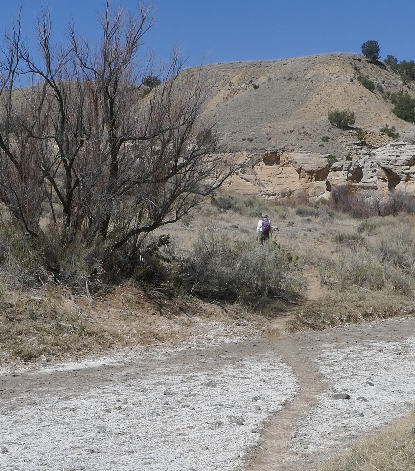 The first challenge is to find a path down into the wash of the canyon. Pat led the way, through the fence 50 yards from the truck, then along the sometimes narrow shelf above the wash, avoiding the sandy/rocky bottom of the wash. We passed through side ravines along the way that were too steep for us to enter the wash, until the shelf ended about a mile along. From there we alternated between hiking -in- the wash and on the margins.