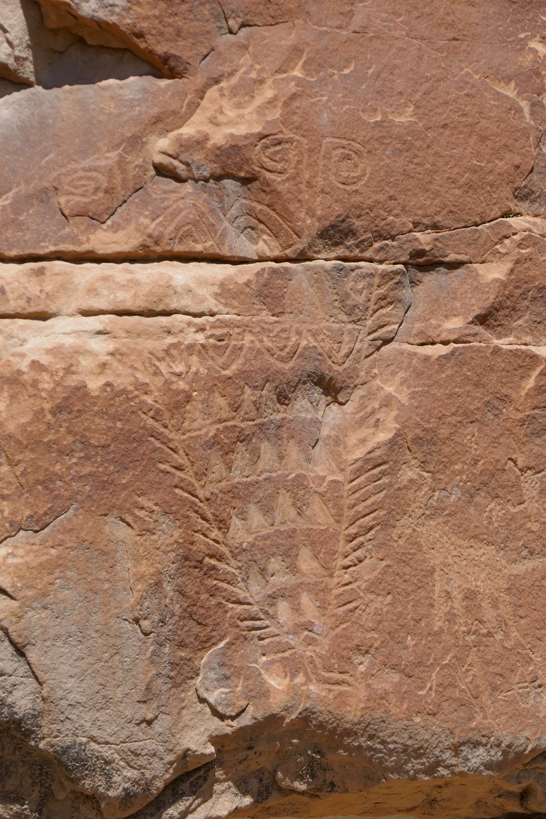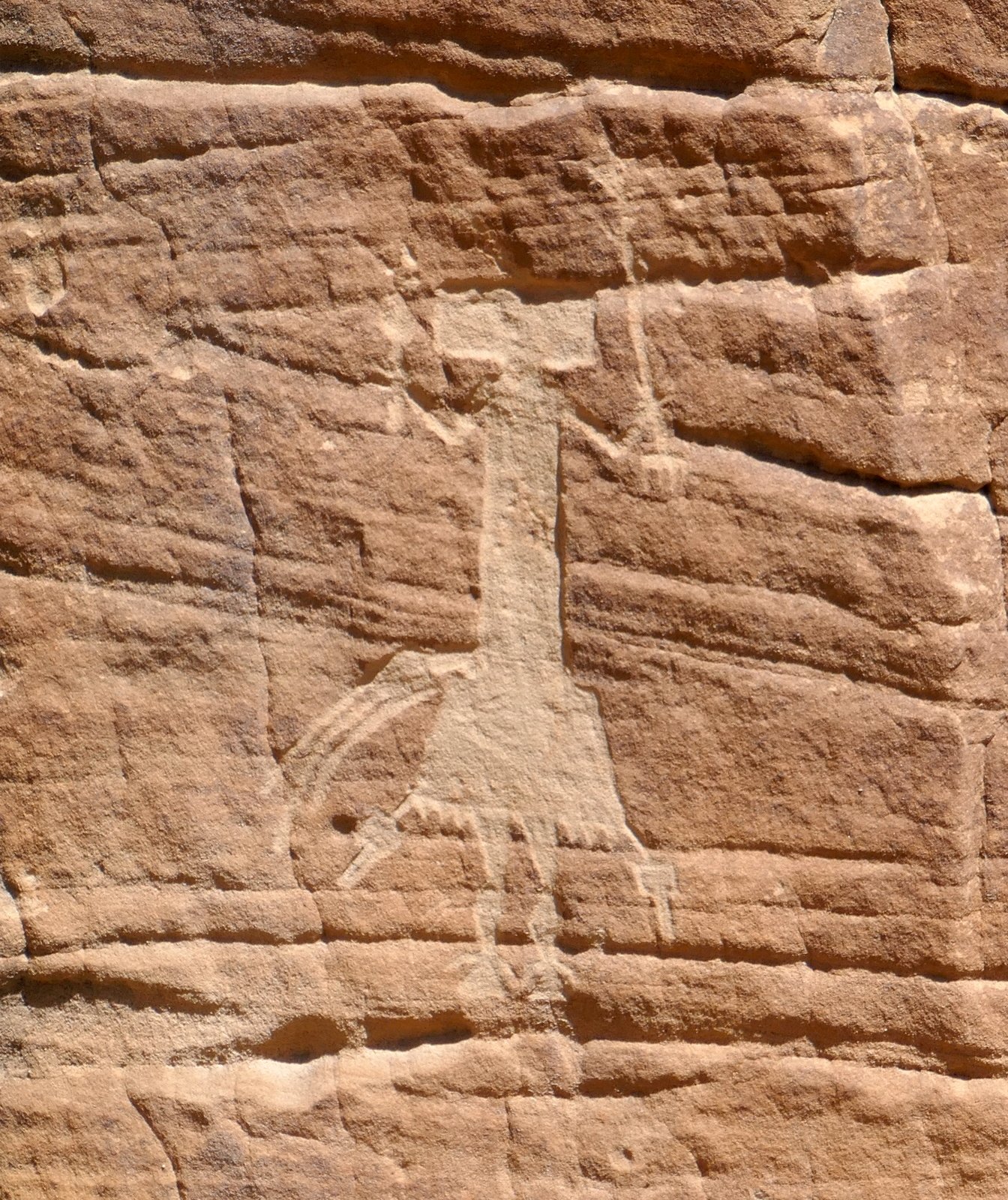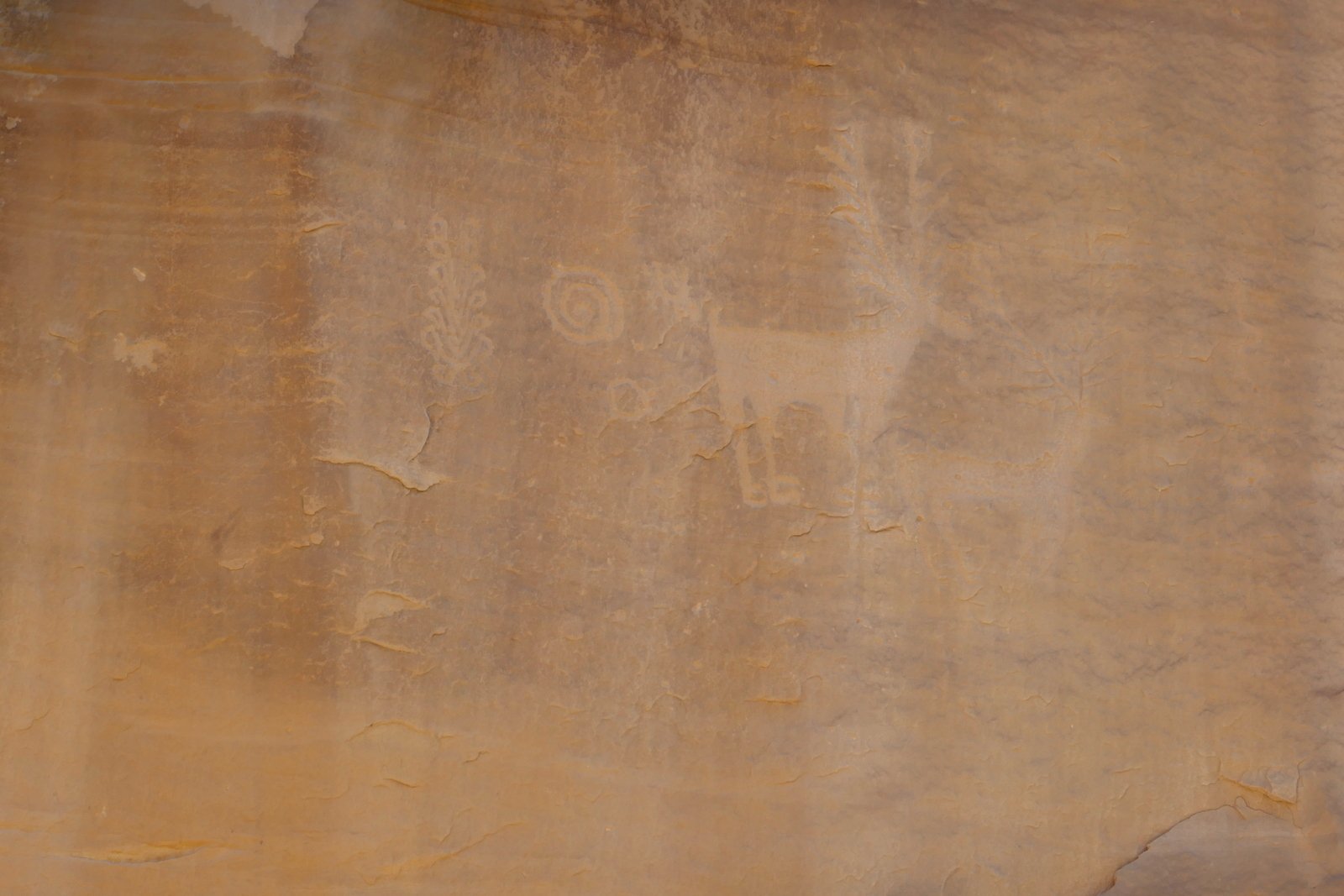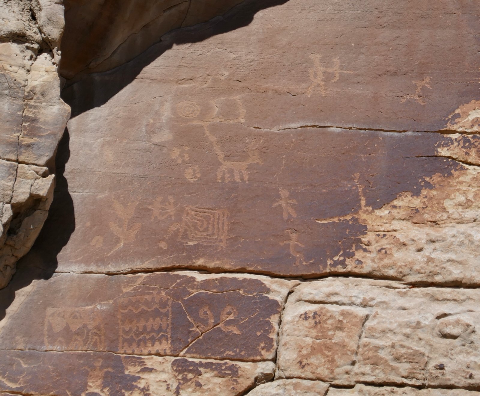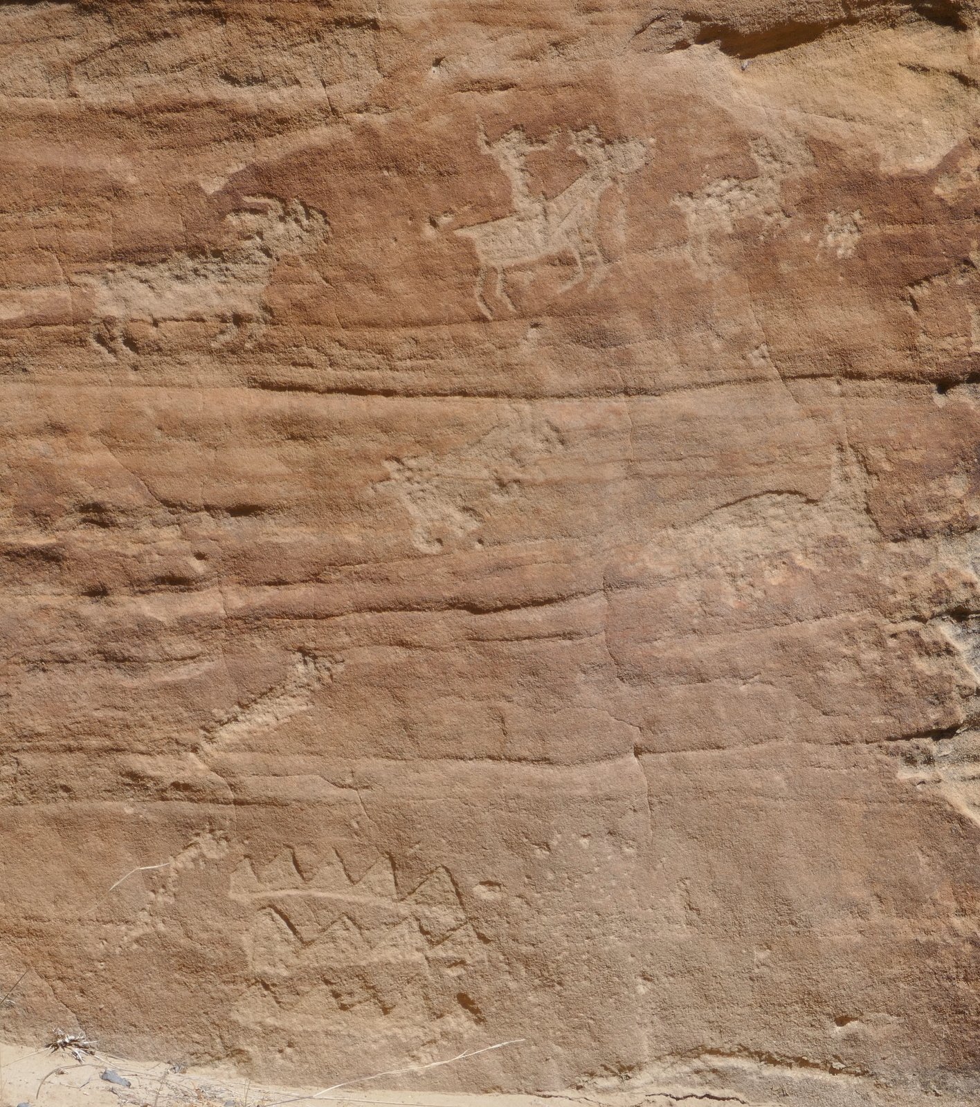 Special features of Tapia Canyon are petroglyphs on the canyon walls. We encountered the first gallery on the left wall 1.6 miles into the hike. The first that we saw appeared to be ‘modern’, a la graffiti. But nearby were others that appeared to be genuine (Gallery #1 on the GE track). About 300 yards further we found a 2nd gallery, then 250 yards to a 3rd gallery, and another 300 yards to the 4th gallery. These last three are on walls above elevated margins on the right (north) side of the canyon. And from Gallery #3 we caught a glimpse of the Torreon on the ridge above the south side of the canyon.