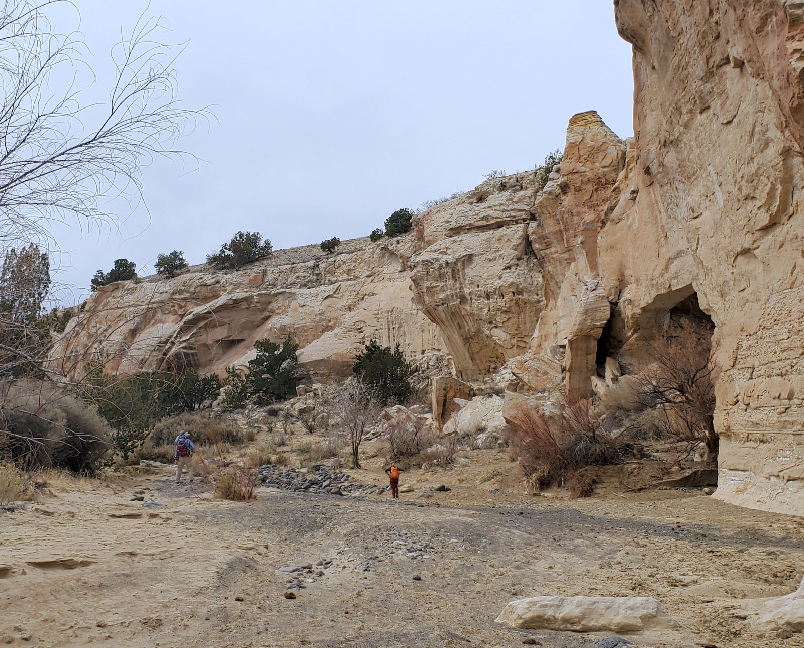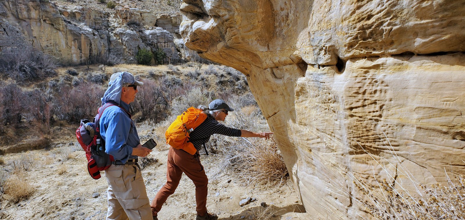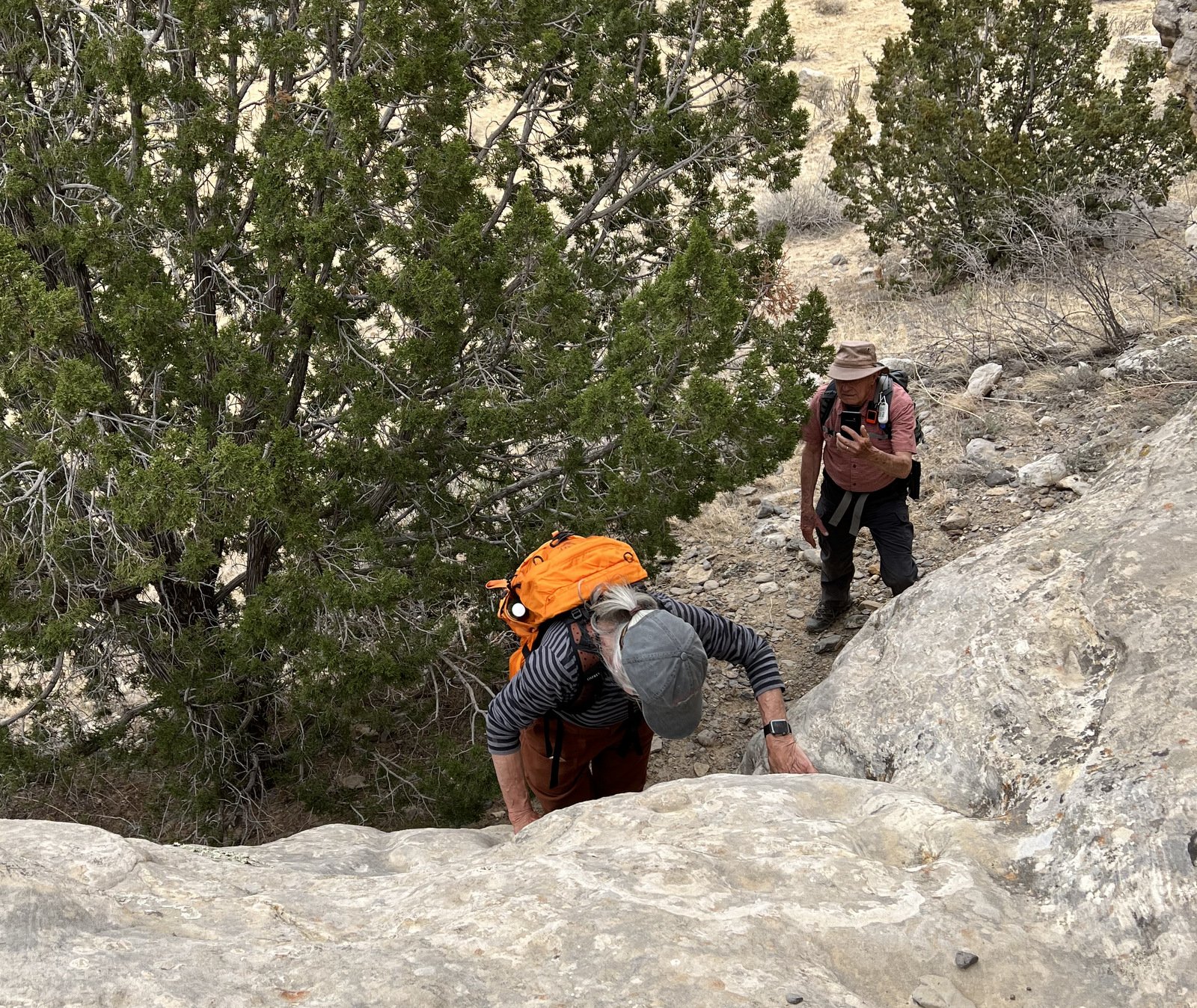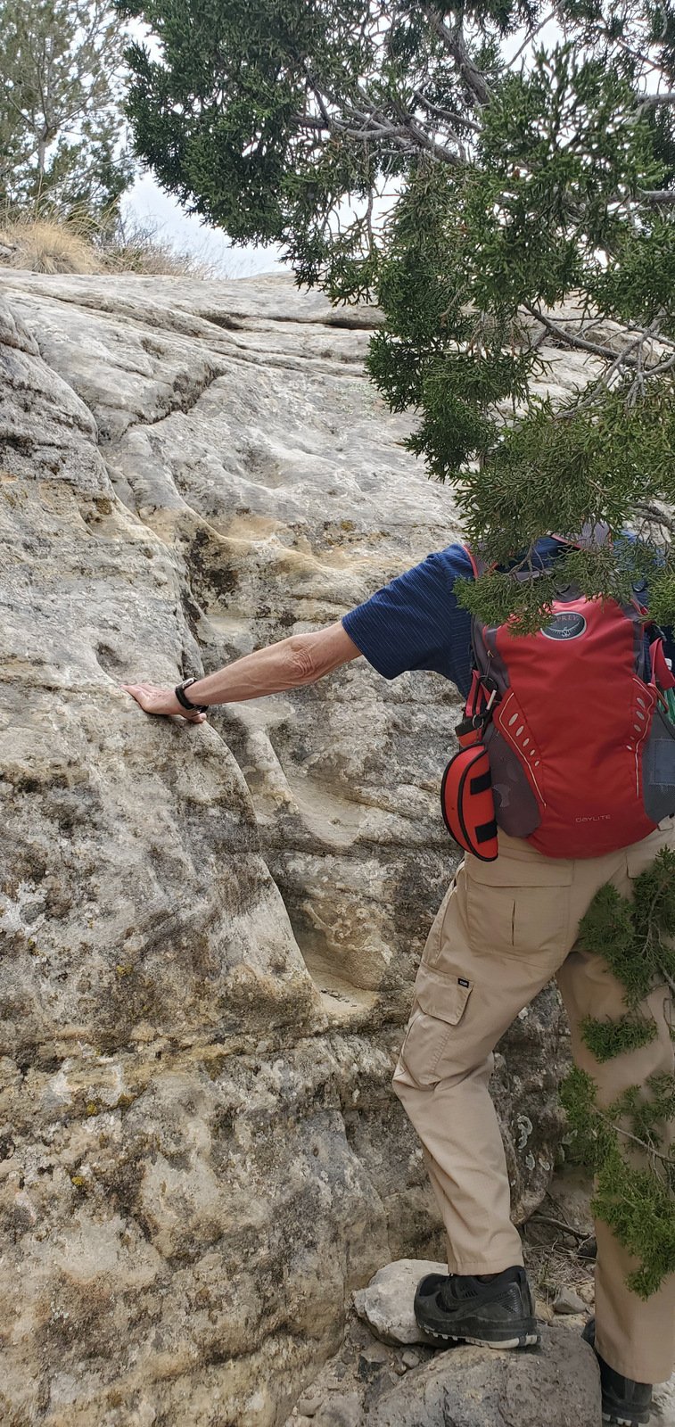 An update, tho’, about the climb out: during this hike I had forgotten about the steps Jay and I found back in 2016. Jay had a clear memory of them, but not where they were located. As we hiked down-canyon we scrutinized the right-hand wall looking for something we recognized. Almost to the point of giving up, we checked one more suspicious break in the wall, and behind a couple of juniper trees were those footsteps (or footholds). Adding to our previous visit: this time we noticed some amazing petroglyphs on the wall at the bottom of the steps and more at the top.