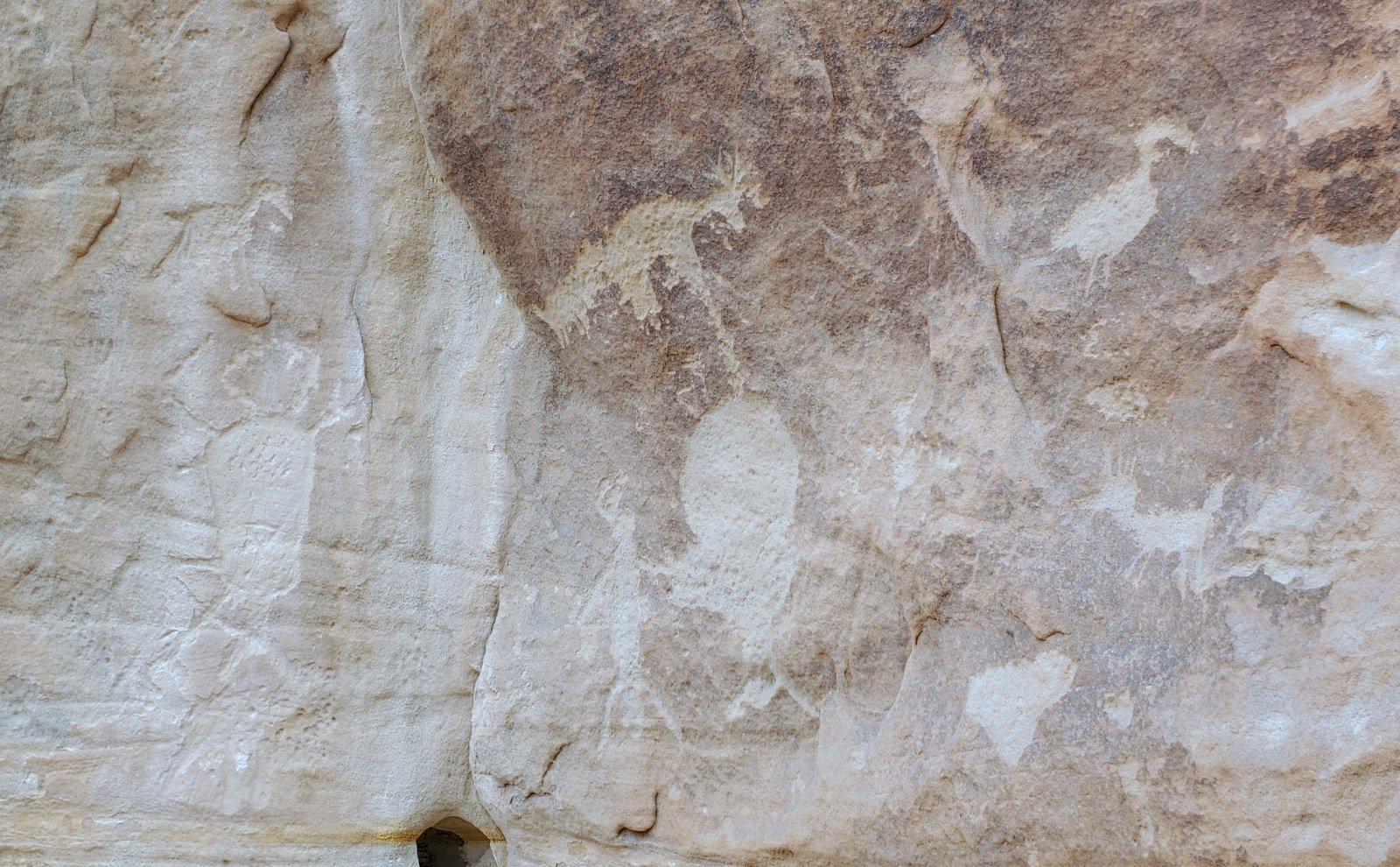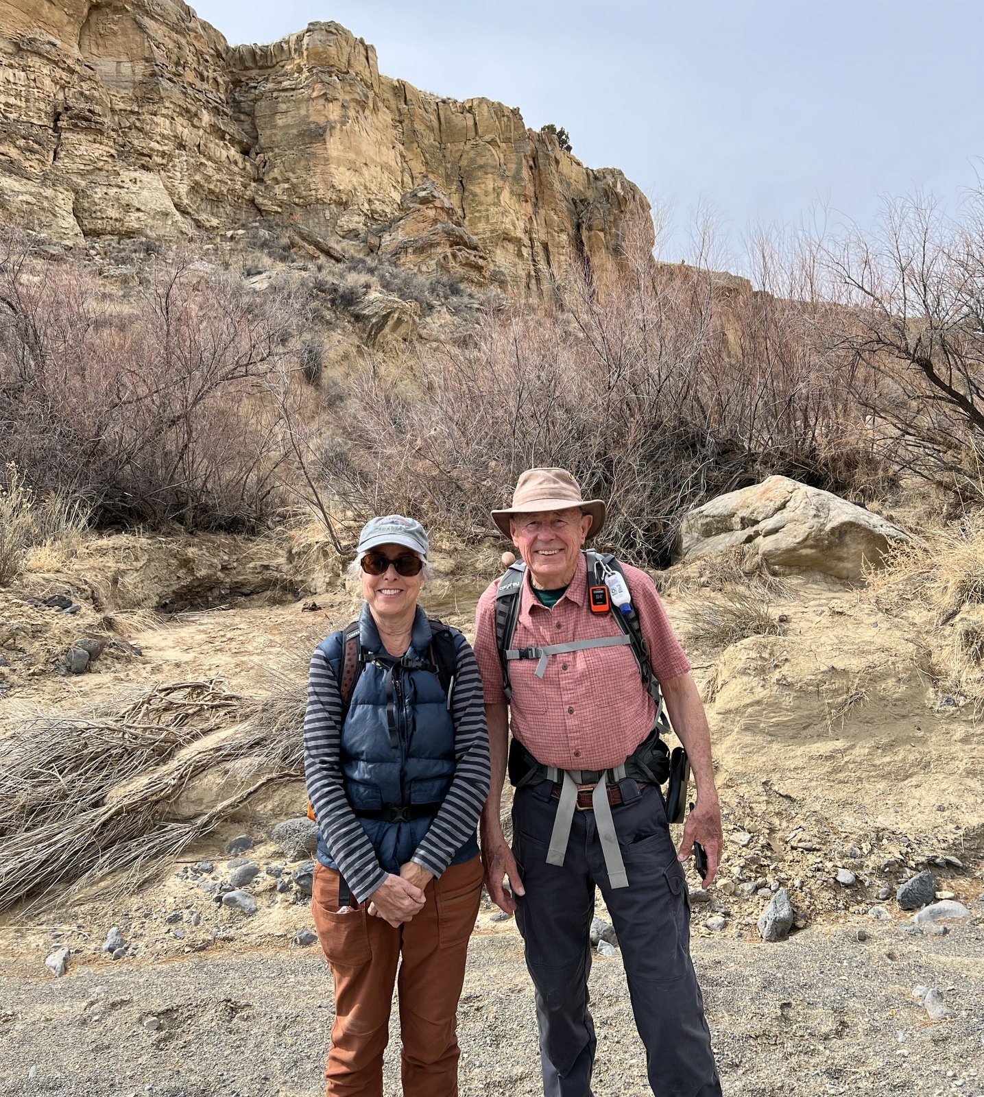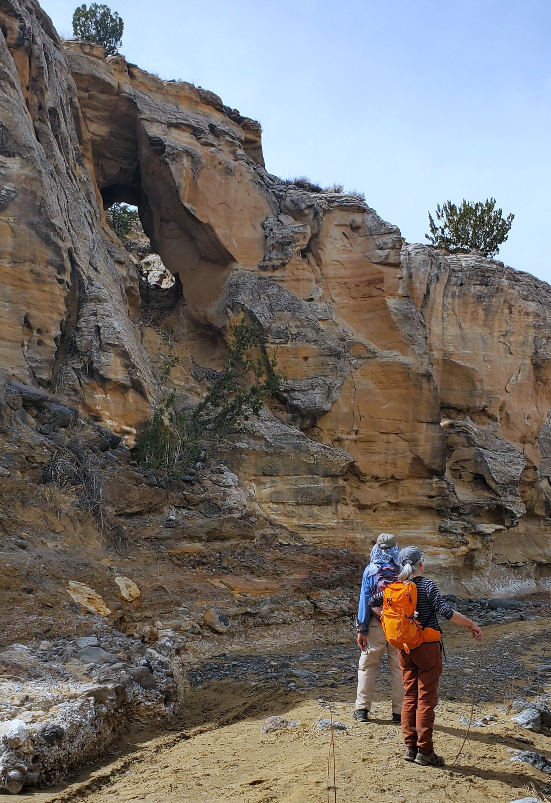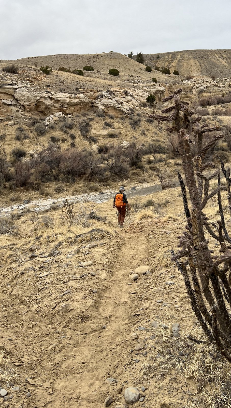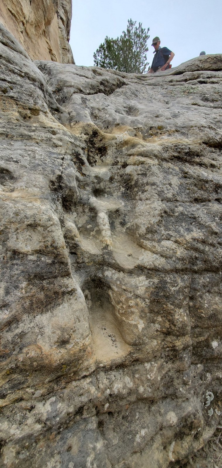 An update, tho’, about the climb out: during this hike I had forgotten about the steps Jay and I found back in 2016. Jay had a clear memory of them, but not where they were located. As we hiked down-canyon we scrutinized the right-hand wall looking for something we recognized. Almost to the point of giving up, we checked one more suspicious break in the wall, and behind a couple of juniper trees were those footsteps (or footholds). Adding to our previous visit: this time we noticed some amazing petroglyphs on the wall at the bottom of the steps and more at the top.