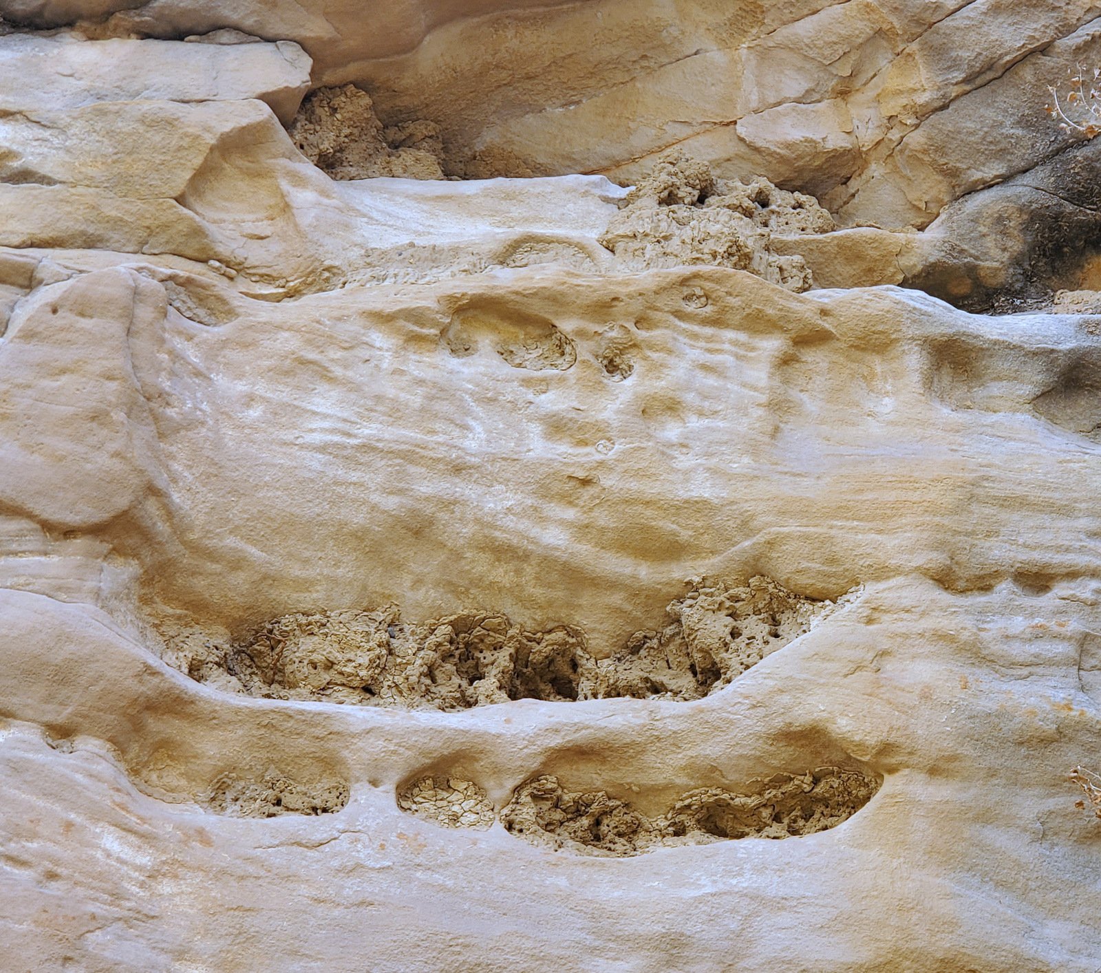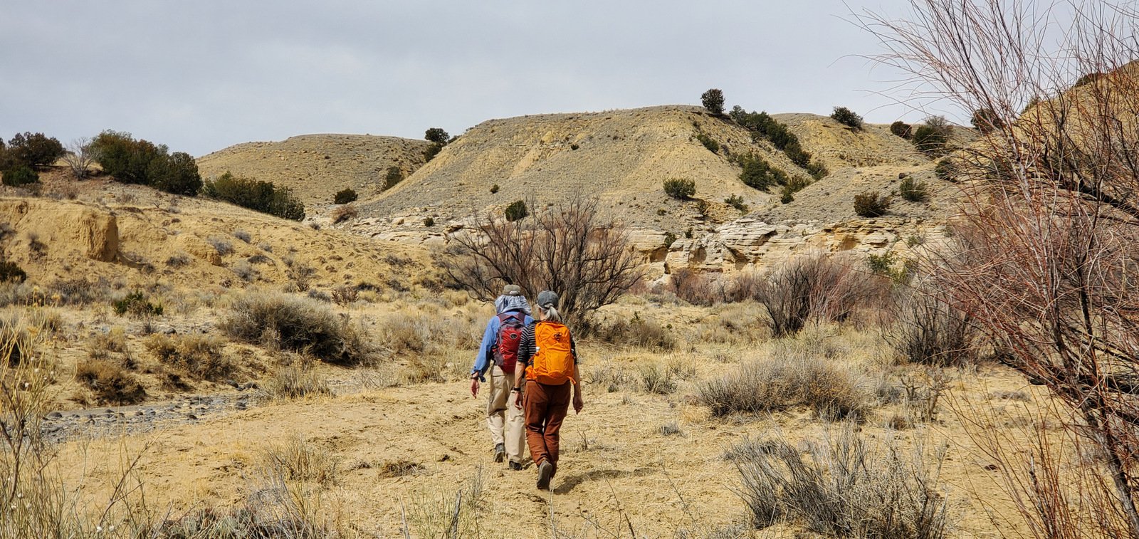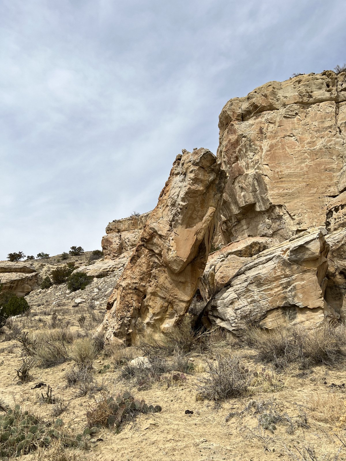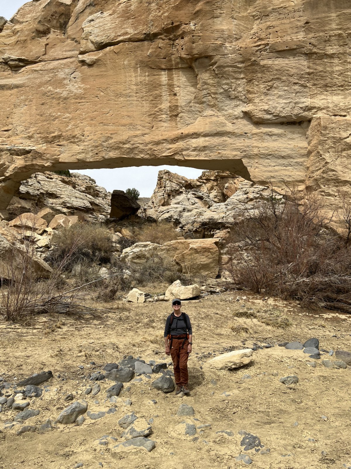An update, tho’, about the climb out: during this hike I had forgotten about the steps Jay and I found back in 2016. Jay had a clear memory of them, but not where they were located. As we hiked down-canyon we scrutinized the right-hand wall looking for something we recognized. Almost to the point of giving up, we checked one more suspicious break in the wall, and behind a couple of juniper trees were those footsteps (or footholds). Adding to our previous visit: this time we noticed some amazing petroglyphs on the wall at the bottom of the steps and more at the top.