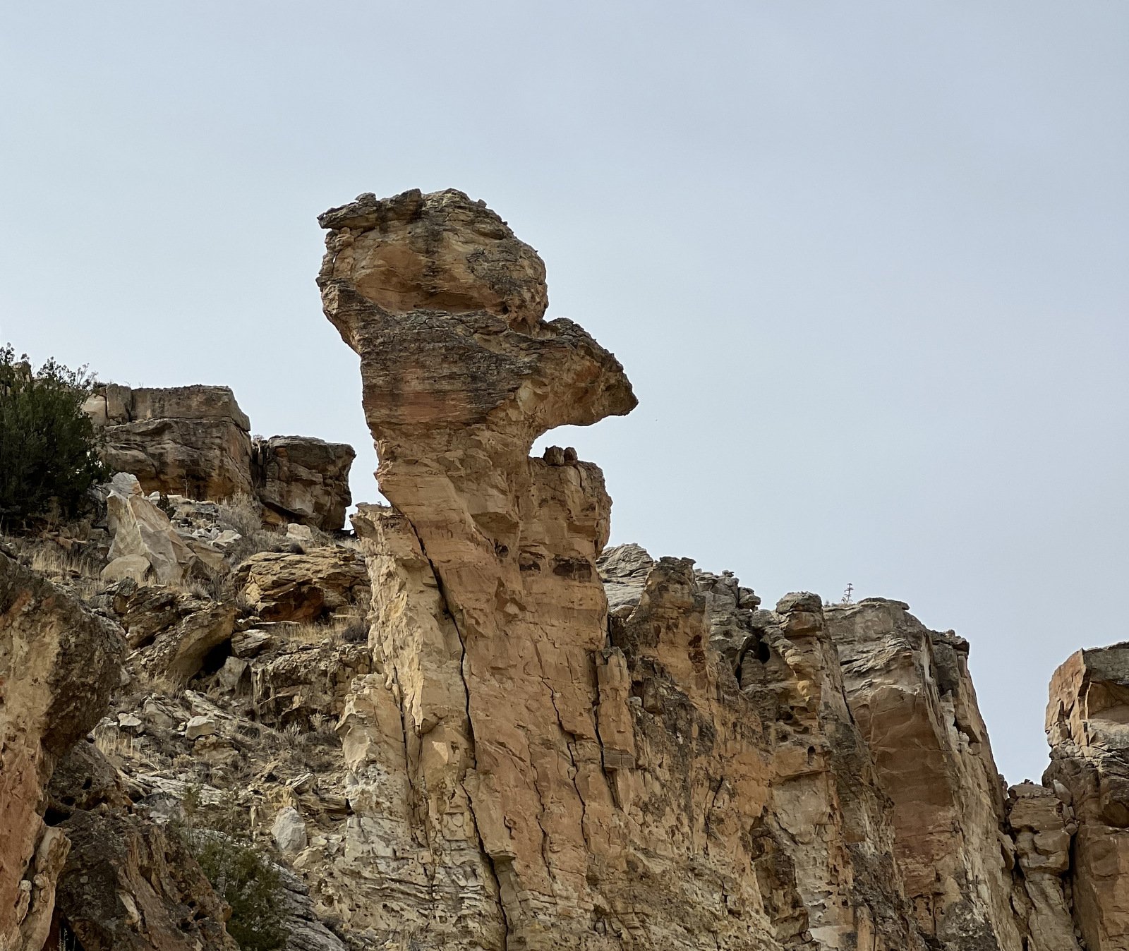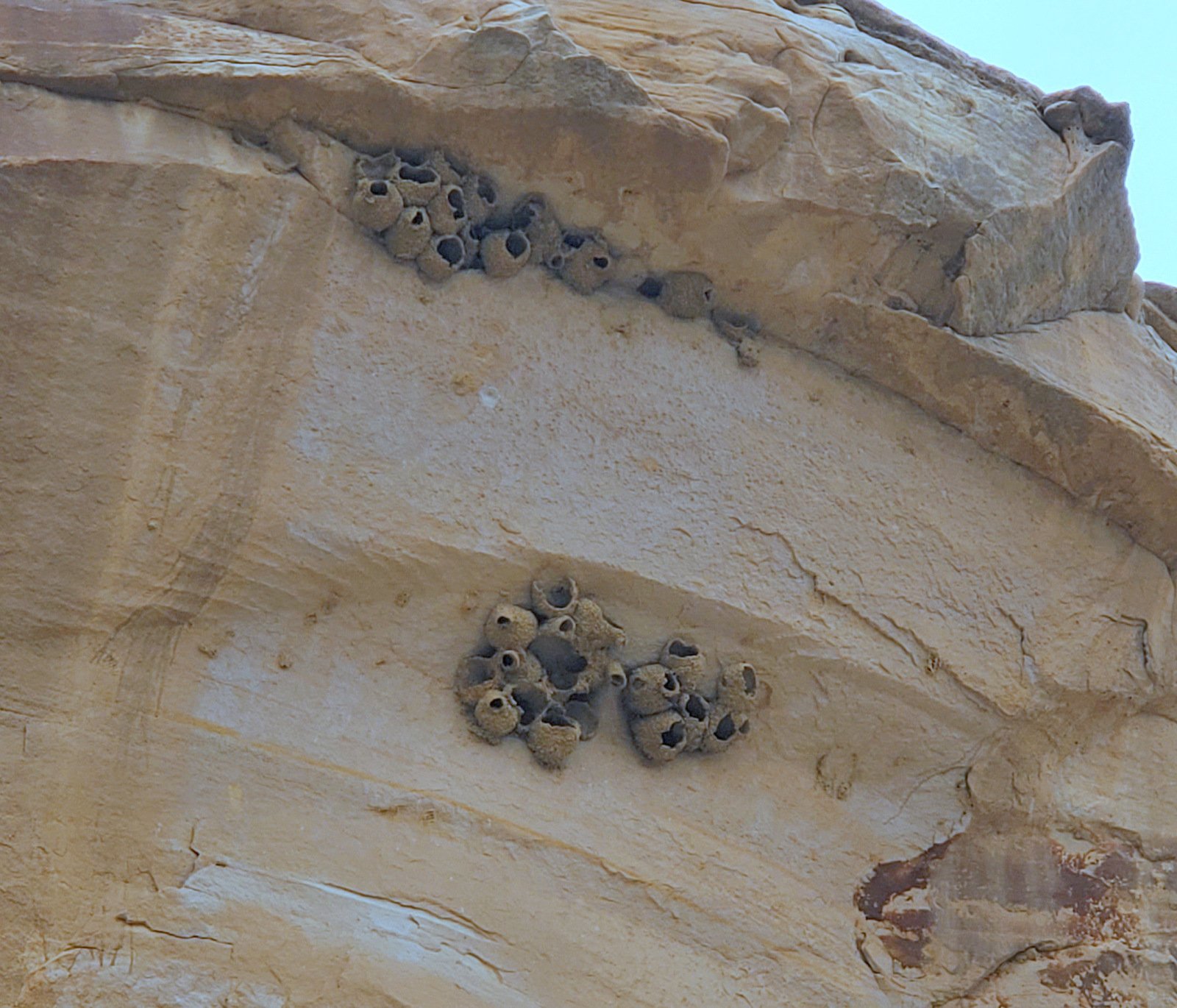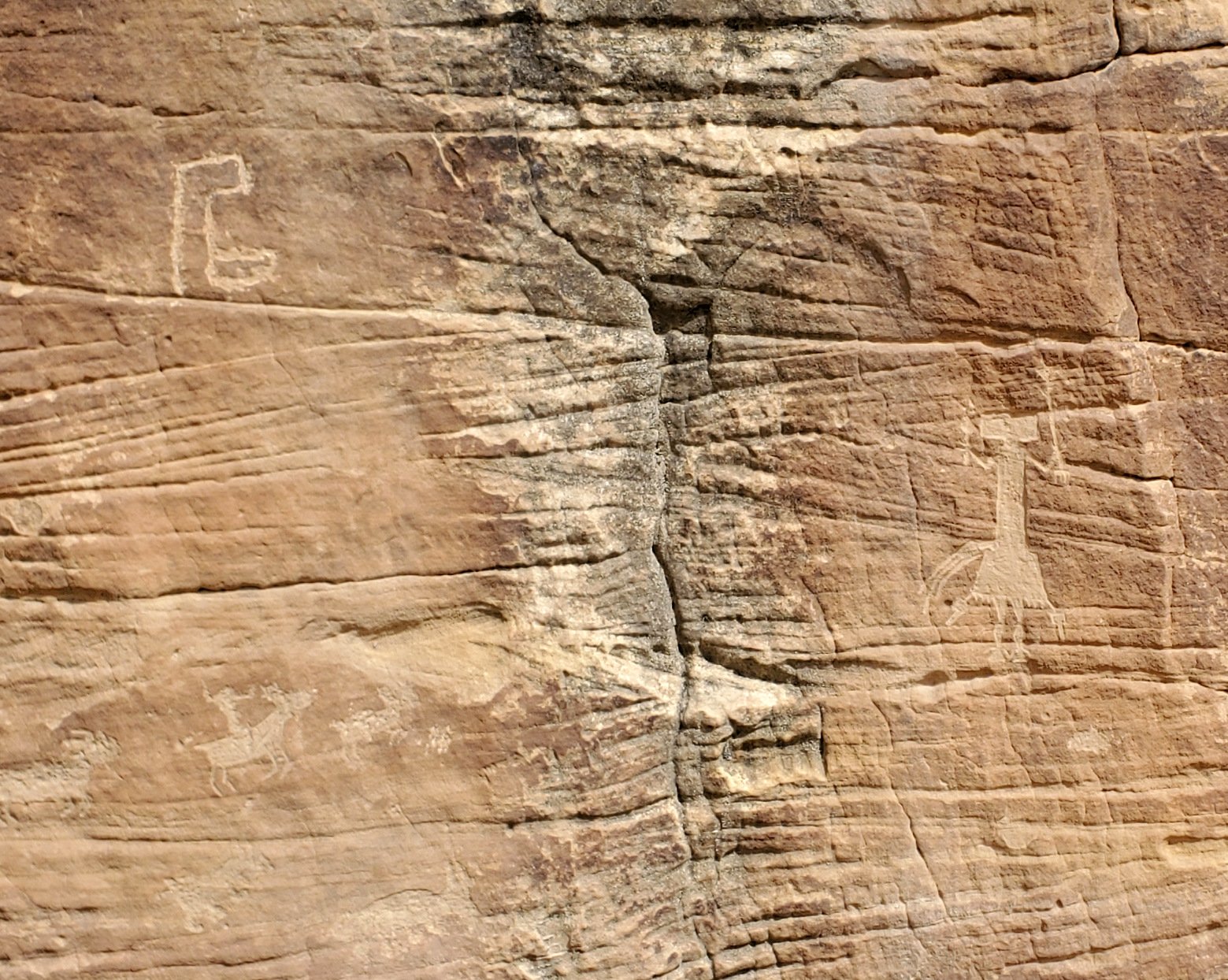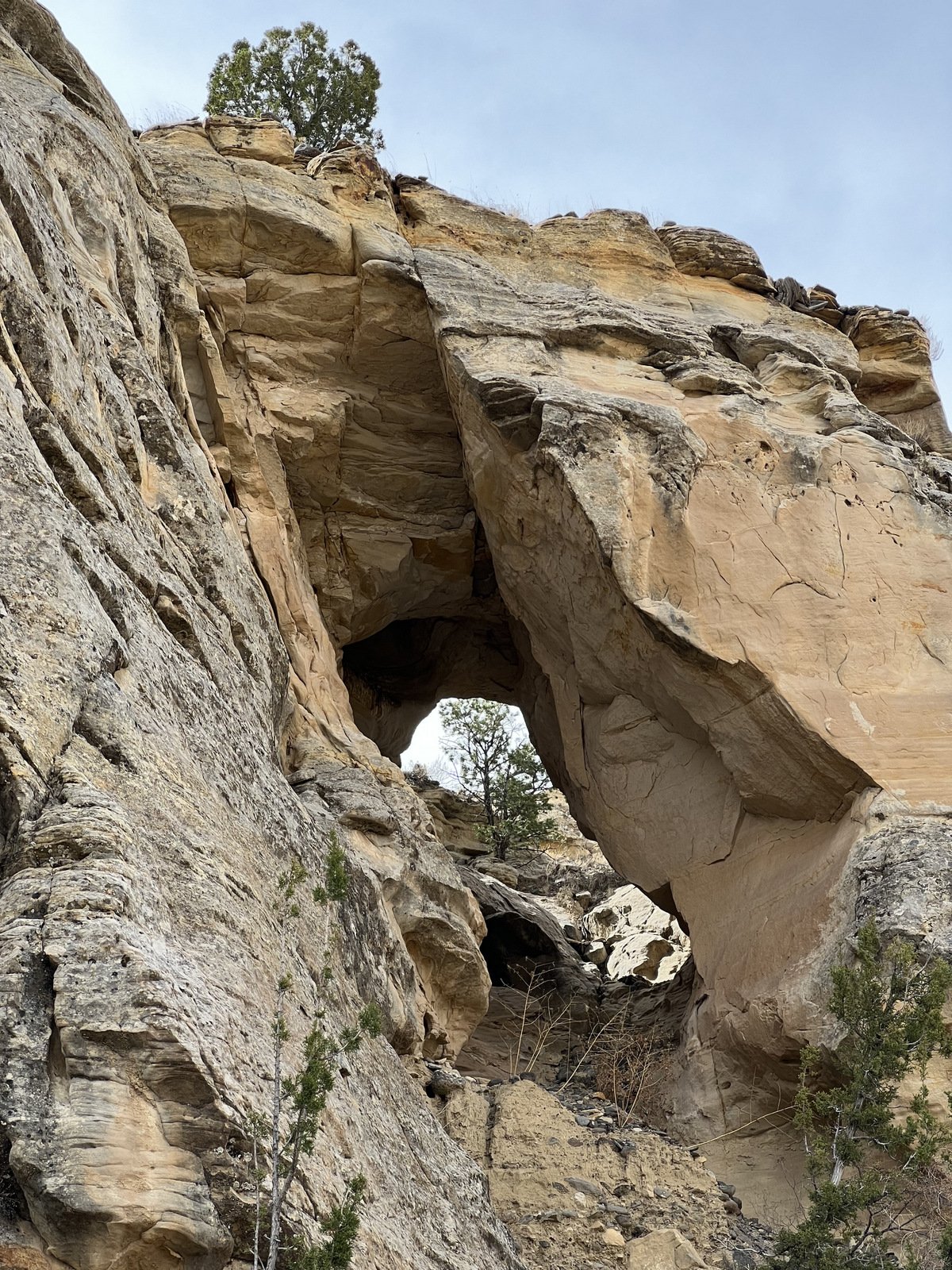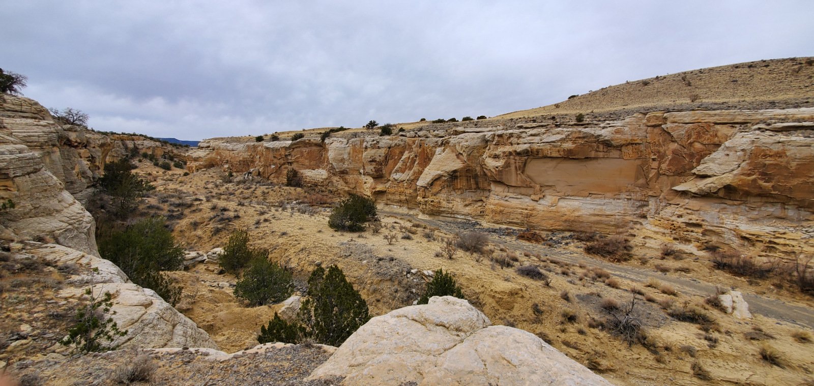 An update, tho’, about the climb out: during this hike I had forgotten about the steps Jay and I found back in 2016. Jay had a clear memory of them, but not where they were located. As we hiked down-canyon we scrutinized the right-hand wall looking for something we recognized. Almost to the point of giving up, we checked one more suspicious break in the wall, and behind a couple of juniper trees were those footsteps (or footholds). Adding to our previous visit: this time we noticed some amazing petroglyphs on the wall at the bottom of the steps and more at the top.