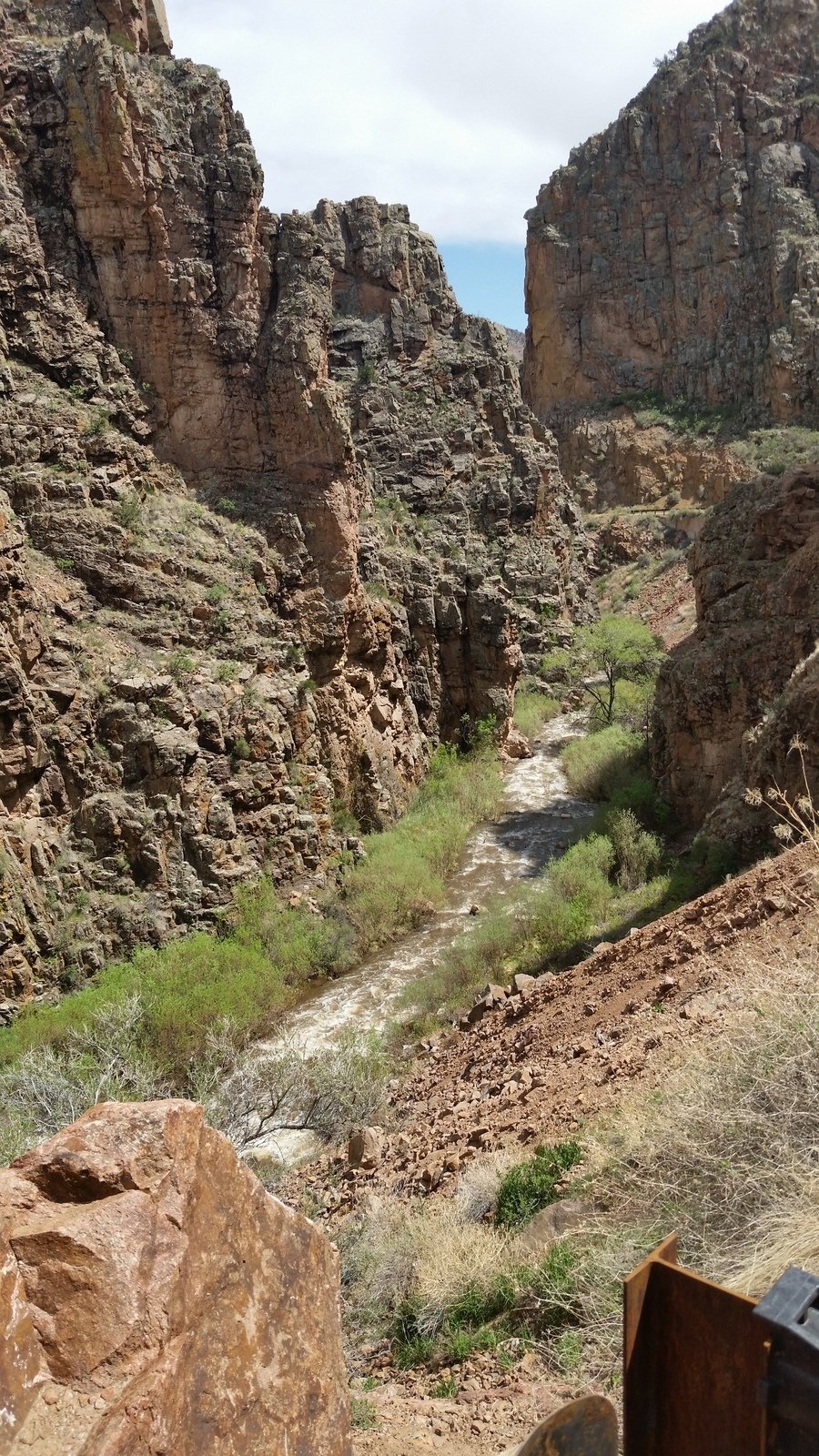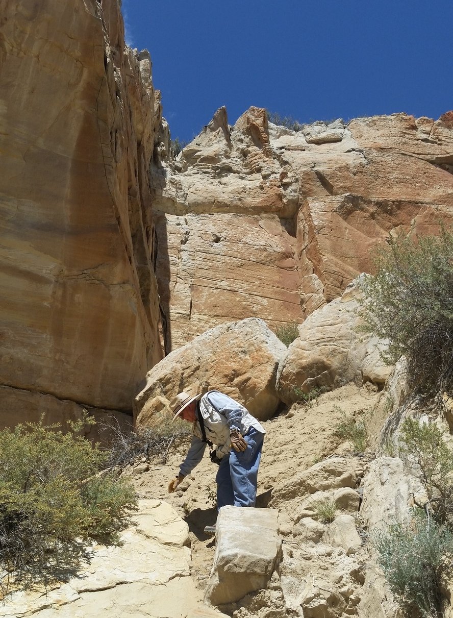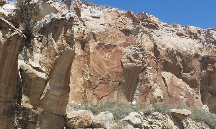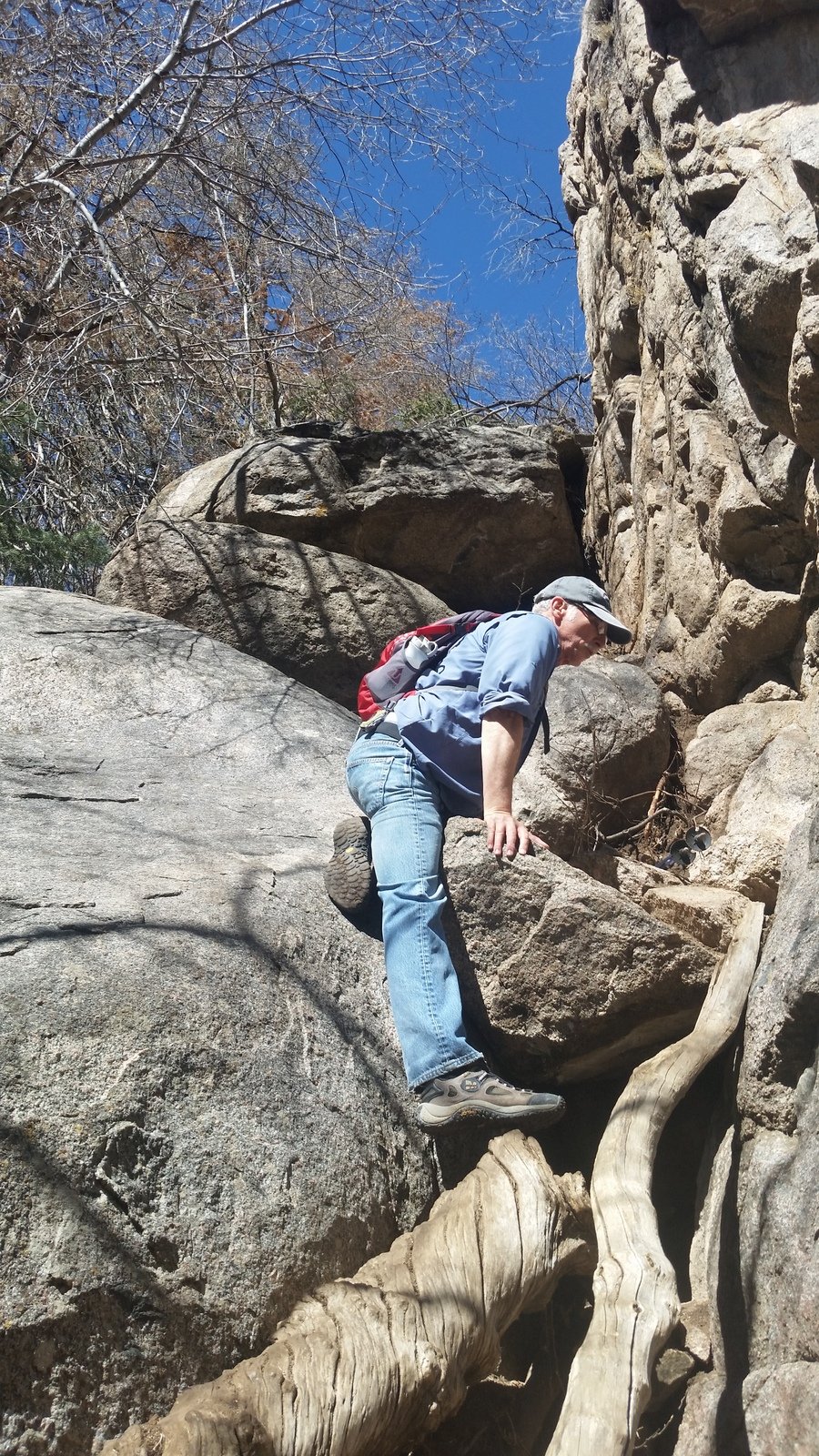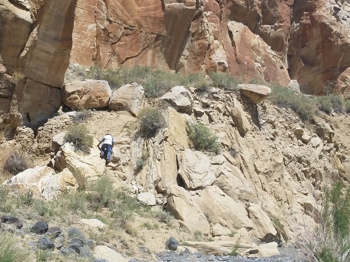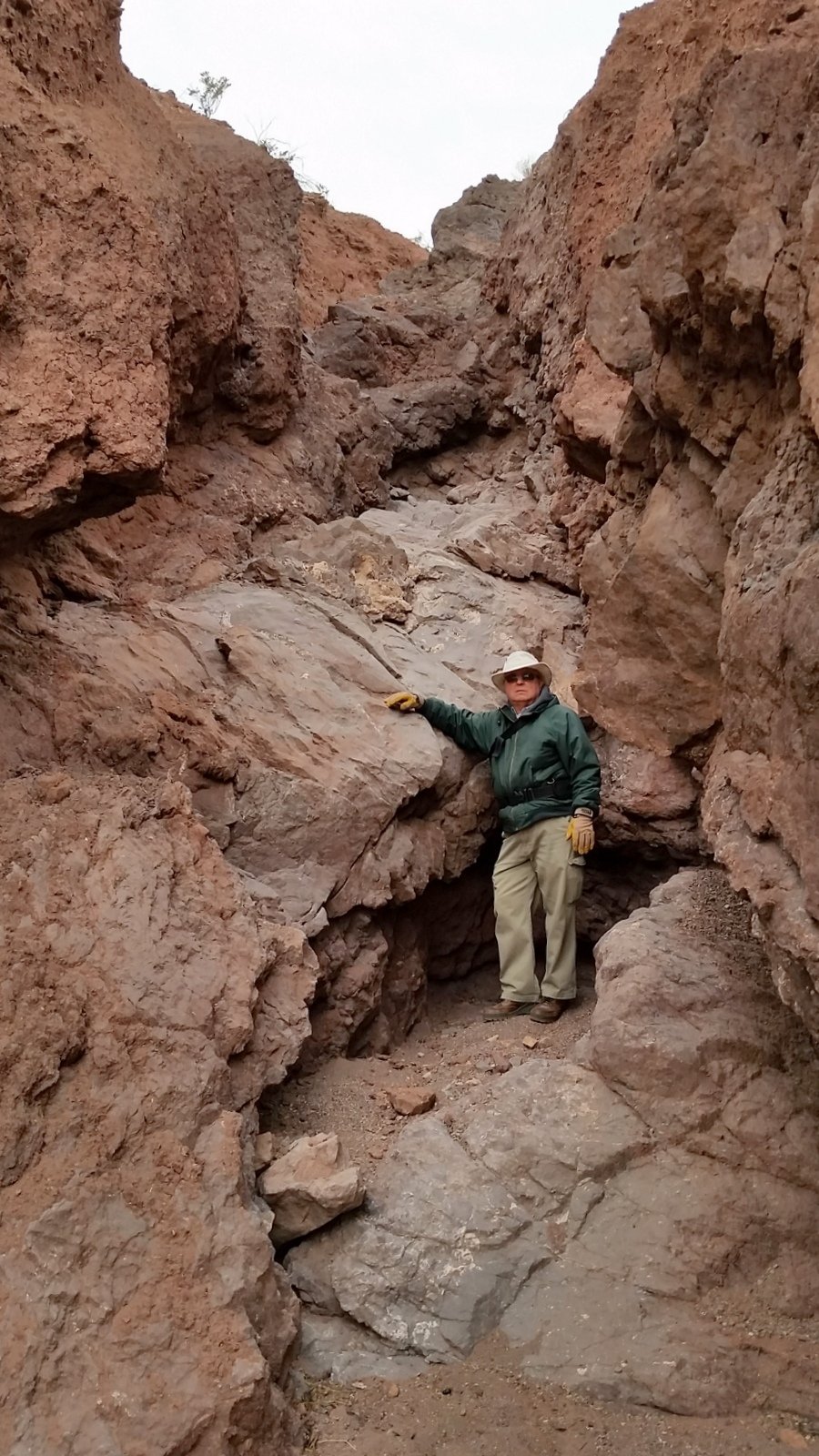 The Box is a short canyon with US 60 passing at its mouth.  ‘Tis a favorite location for rock climbers, working the eastern wall of the canyon; we saw 10 or so people ‘on the wall’ the day we visited. The photos below give one an idea of the depth of the canyon – look closely and you will see Vince down in the canyon’s bottom.