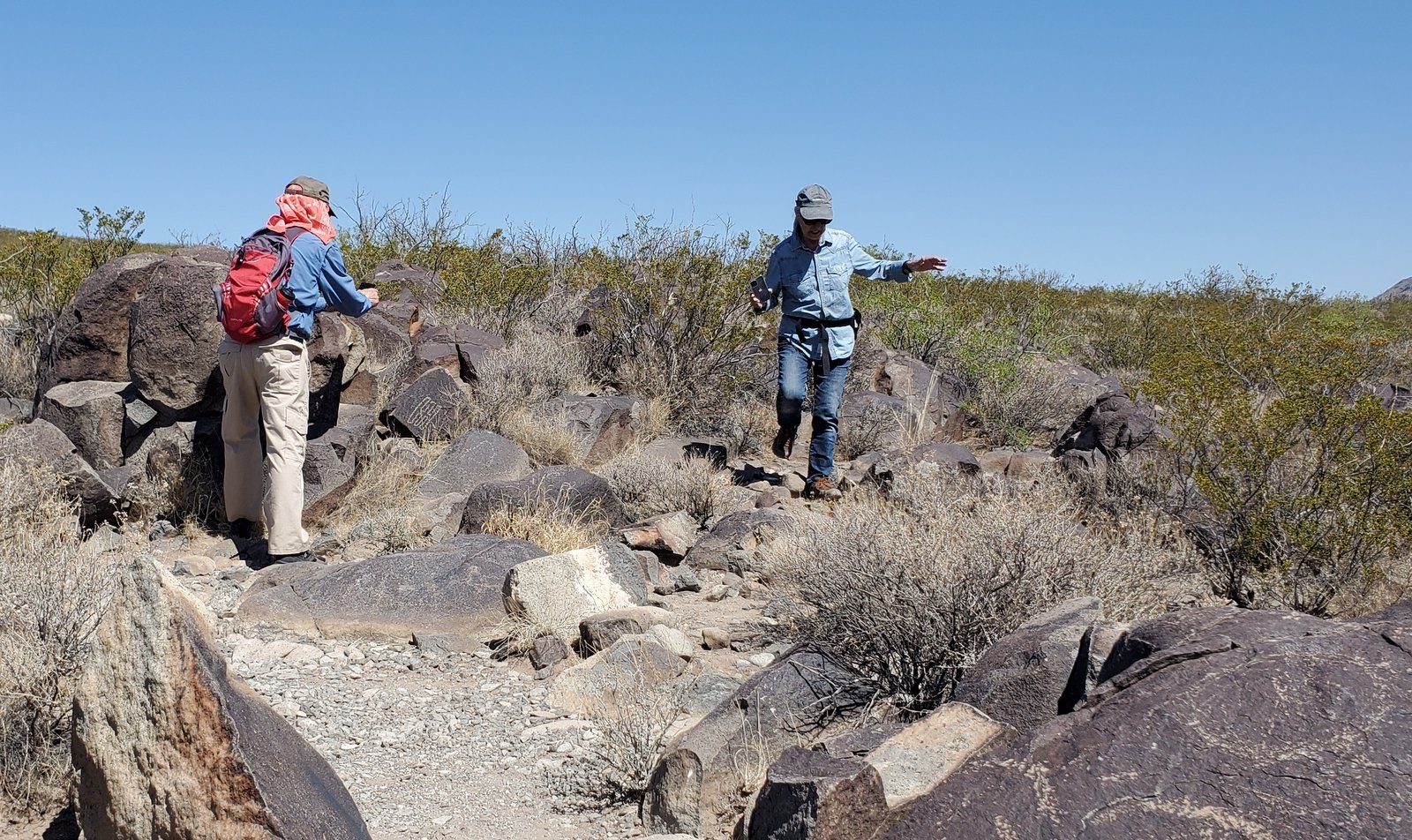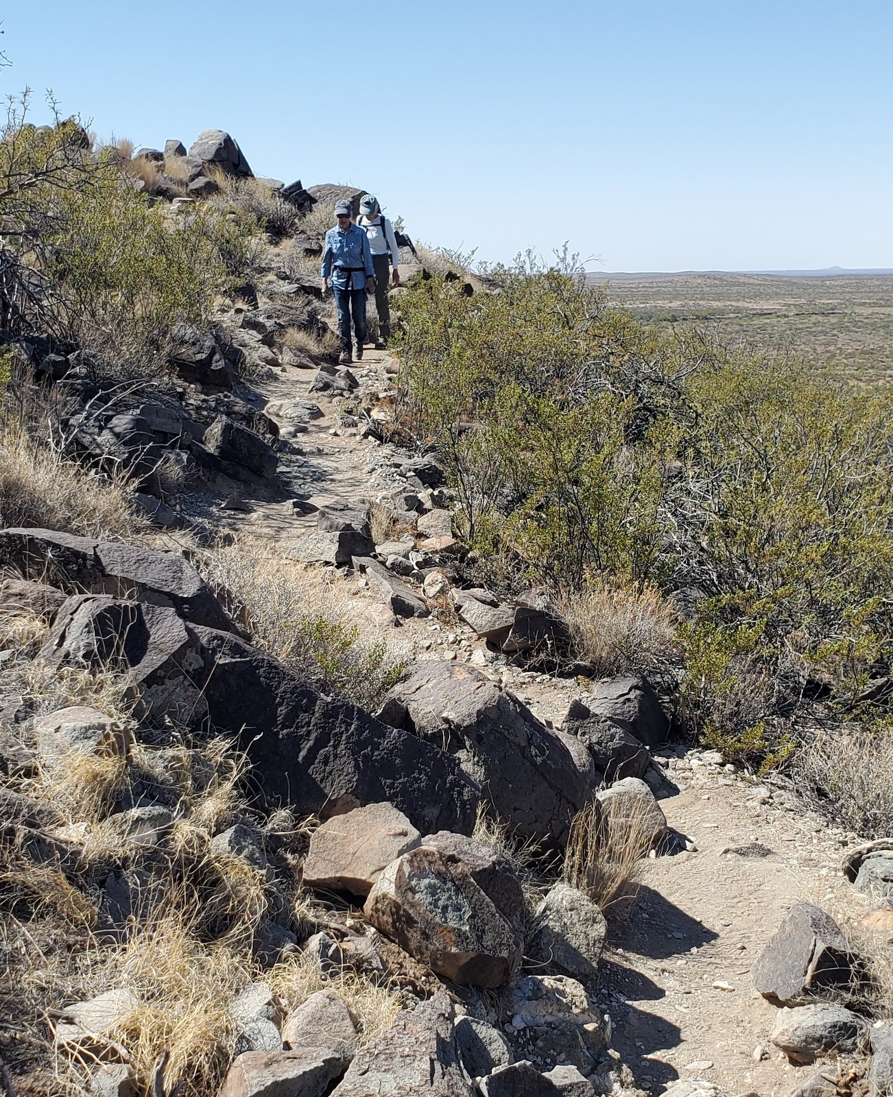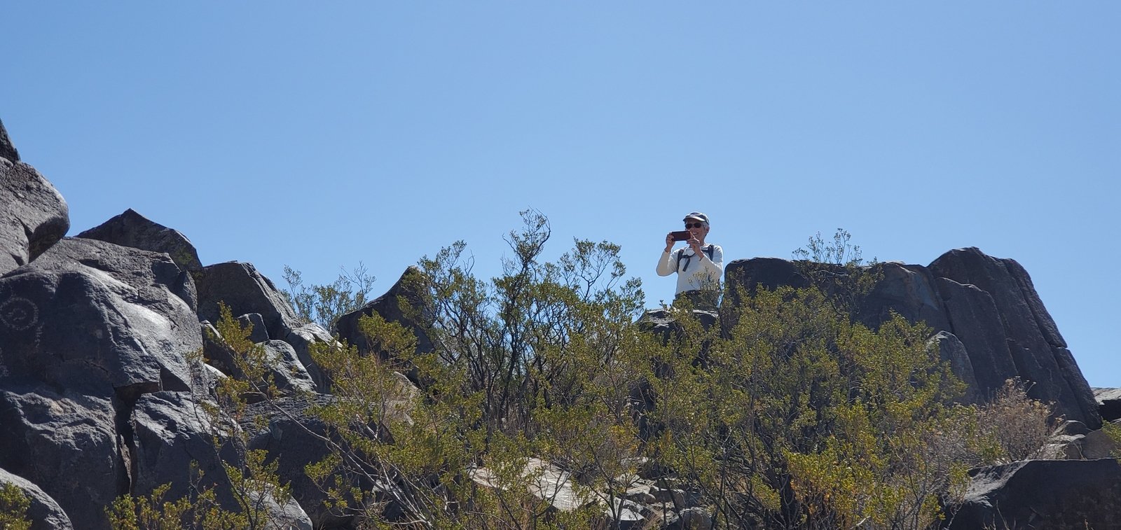 This 2-night camping trip with Jay and Nancy was planned so we could visit the Three Rivers Petroglyph Site. The Petroglyph Trail is just under a mile in length, so we chose to tour the Petroglyphs in the morning, then take a full hike after lunch. Visiting the Site in the cooler air of the morning was a good choice; later in the day it would become quite hot – there is no shade from the sun in New Mexico’s invariably clear blue skies.