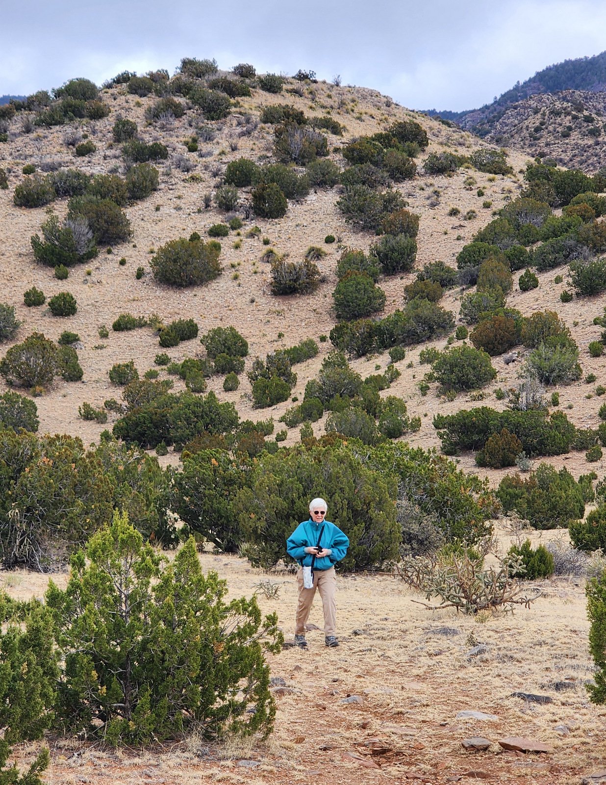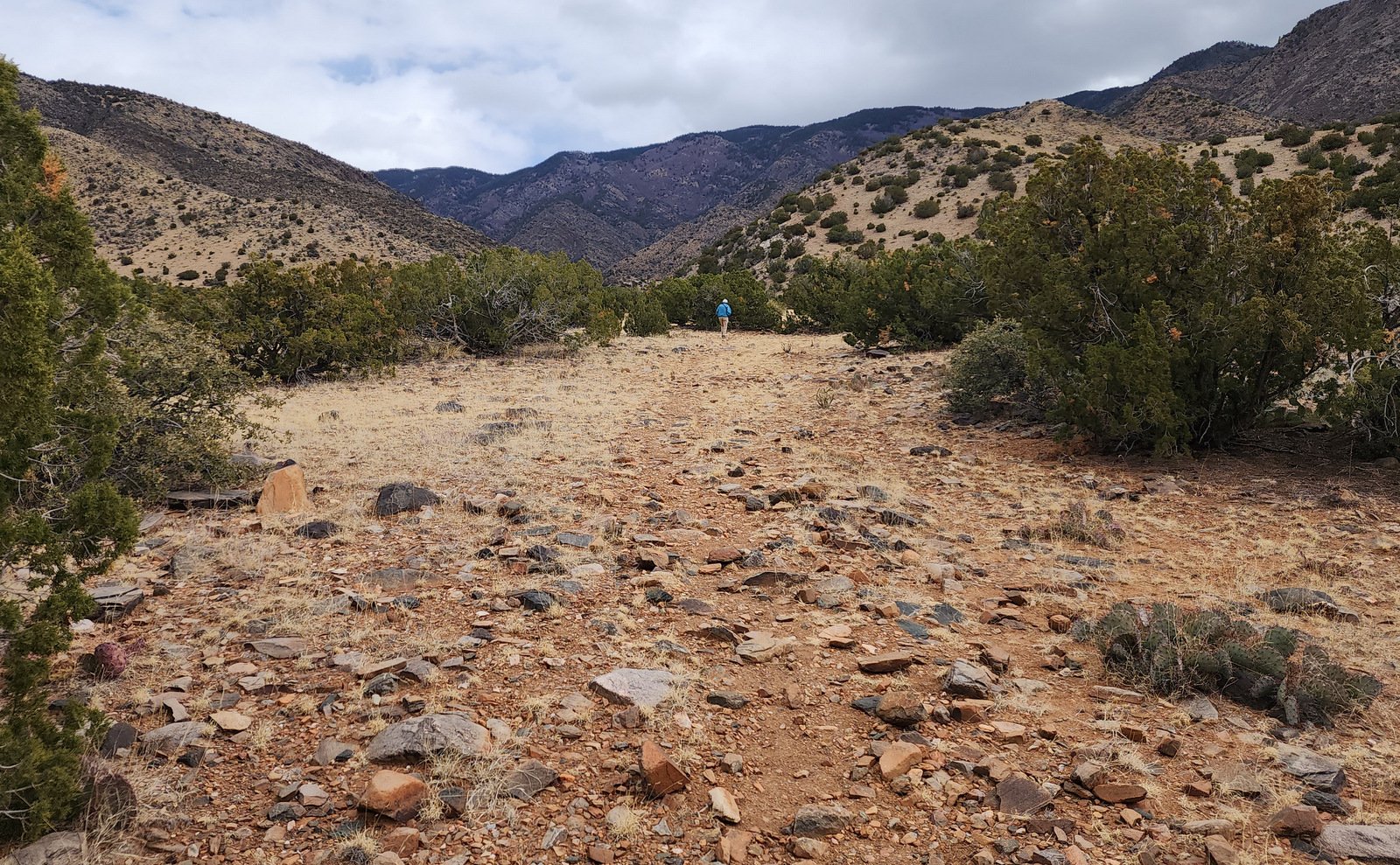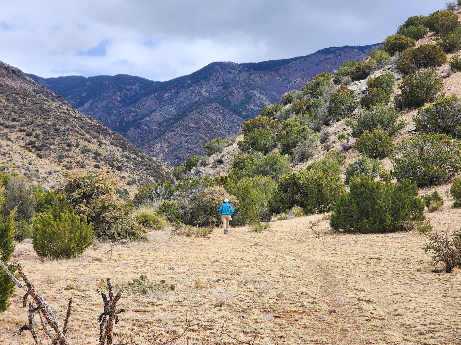 For the distance we walked, the trail was well used and easy to follow. The first quarter mile was a gentle slope among junipers above the bottom of the canyon on the south side. The trail then descended into the bottom and continued, again with gentle slope. We chose to stop this day at .6 mile; at that point the trail joined a two-track that shows on the GAIA map. So only 1.85 miles, but I felt quite comfortable being back on the trail, and looking forward to more hikes and miles in coming weeks/months; I plan to return here to go further on the Monte Largo Trail.