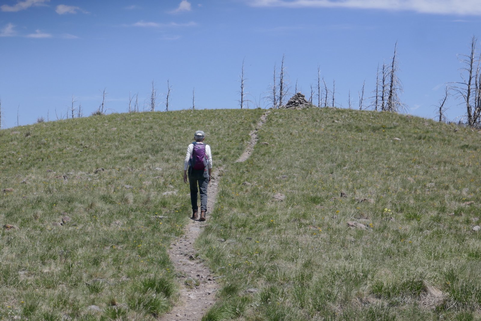 The trail up to the saddle was much like Our first visit; the grasses are still verdant but the flowers have gone past their prime. We remained on the trail rather than making a beeline for the top of the saddle. We were (pleasantly) surprised that the trail did not attack Cerro Grande directly, not a pleasant prospect because it appeared to be a steep climb and the day was sunny – such a climb would be hot and taxing. Rather, the trail headed to the east/northeast, presenting 1) a fair amount of shade and 2) a trail not so steep, rounding the eastern side of Cerro Grande and with a few switchbacks.