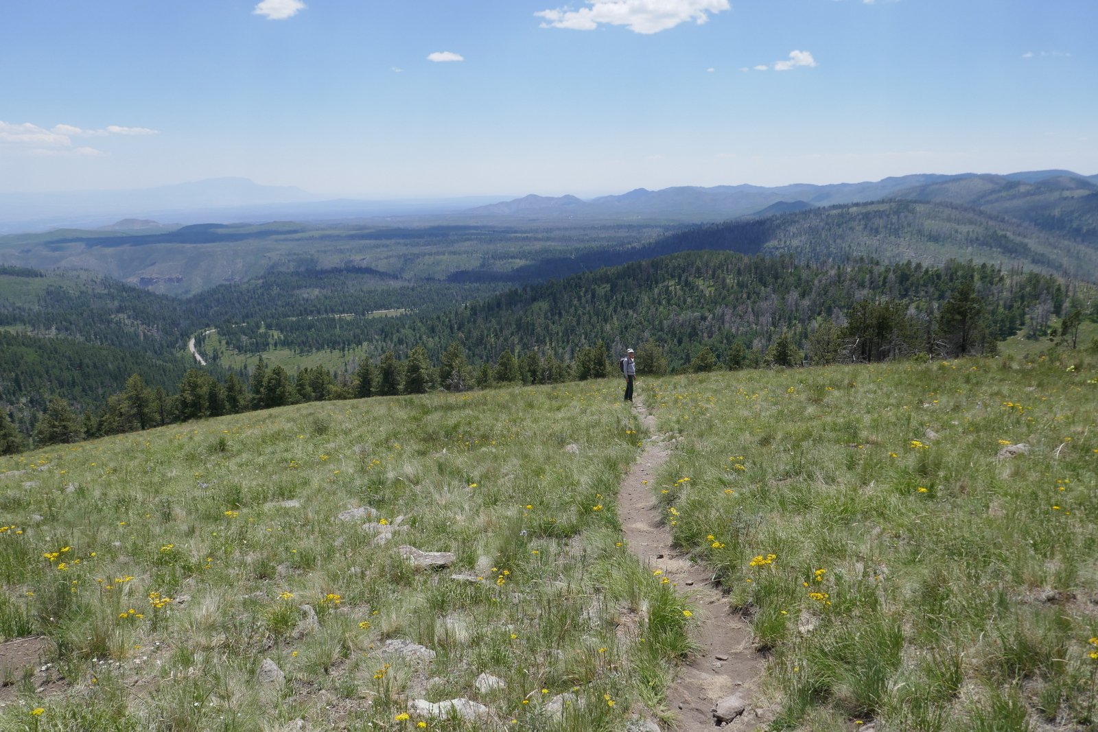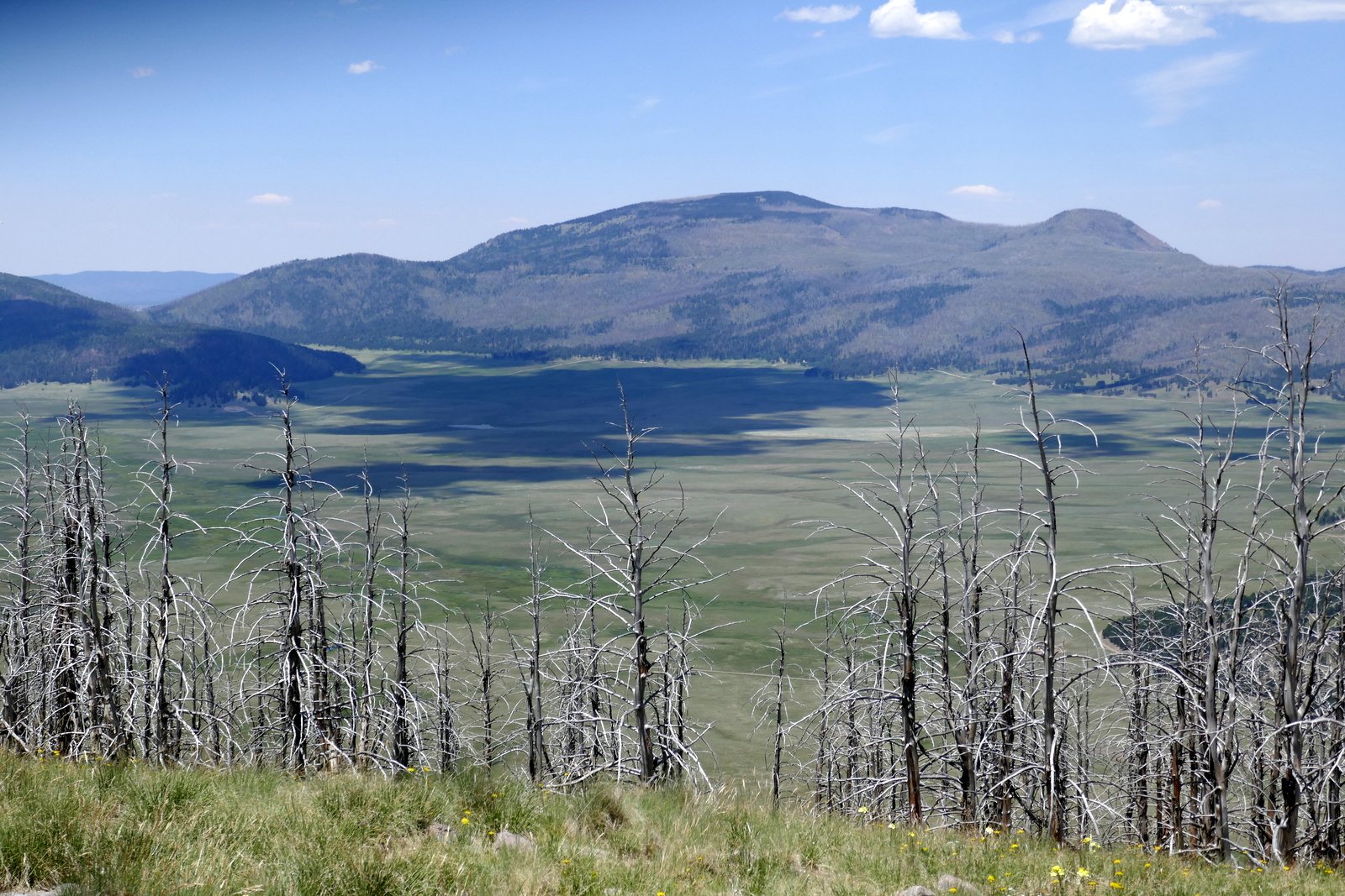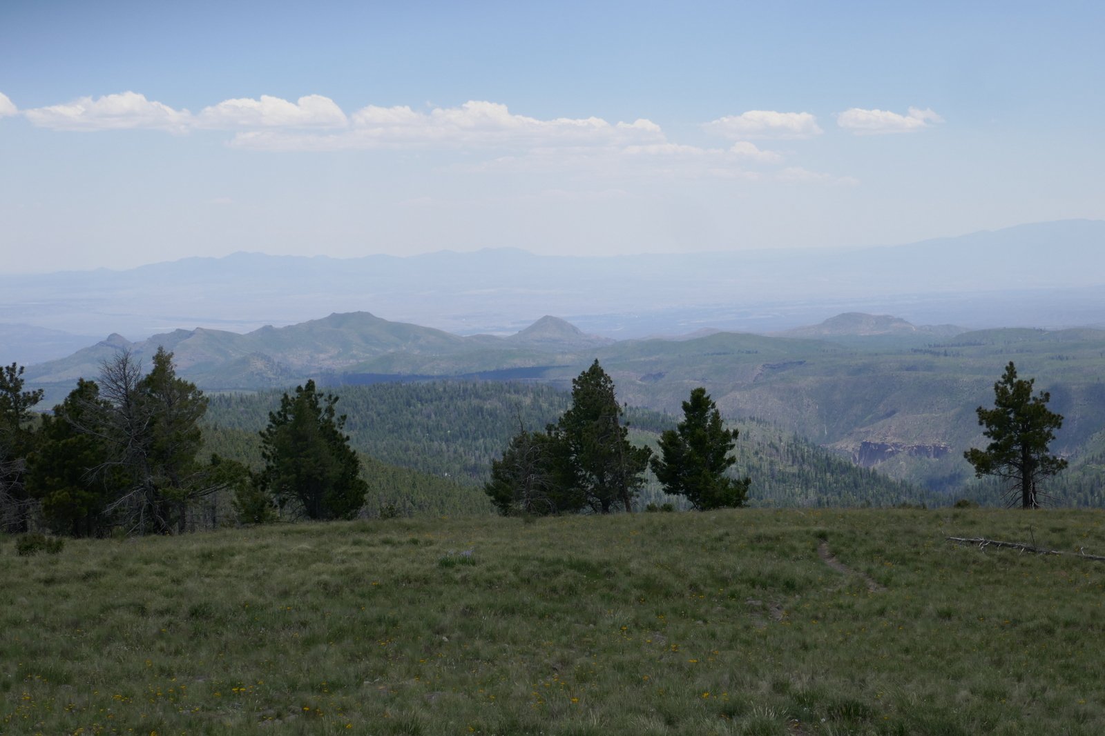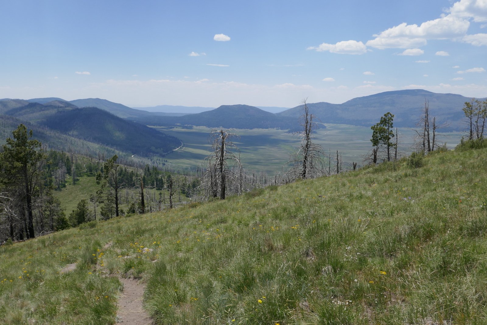 Nearing the top, we left the comfort of shade headed towards the summit which is marked with a large cairn, visible from a distance, and two survey markers (neither of which gave the elevation, but from other sources we understand it to be 10,199 ft; USTopo/GPS on my Galaxy 5 reported 10,194 ft). As expected the view across Valles Grande was “expansive” (?), highlighted by cloud shadows moving across the plain. The air was hazy so the views in other directions weren’t the best, but .. when the air is clear they must be extraordinary.