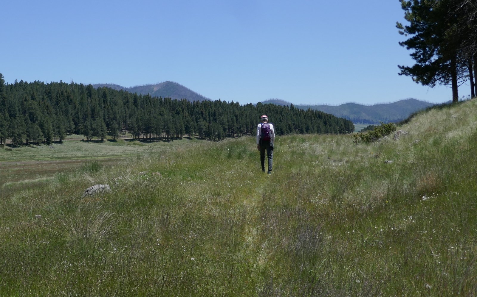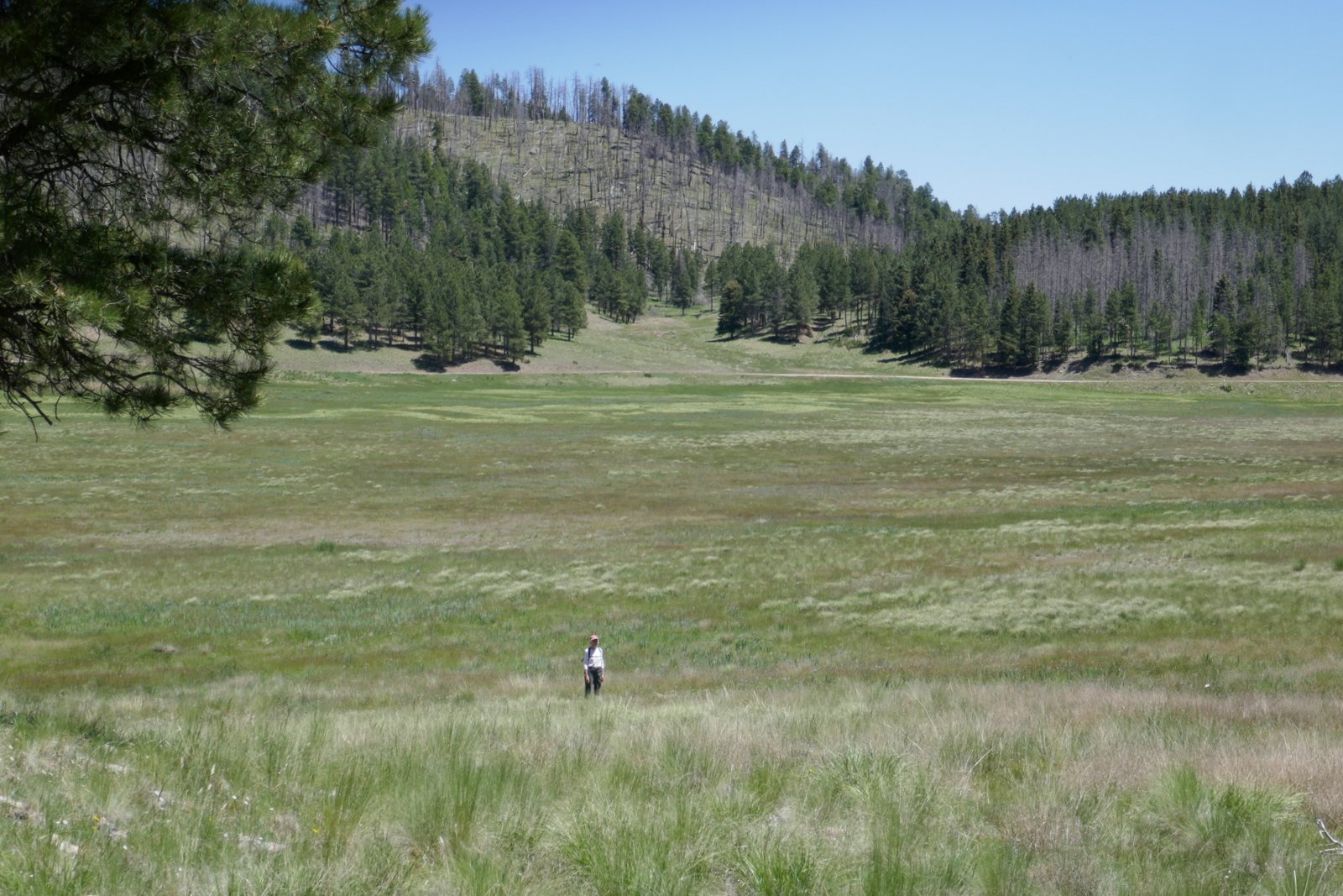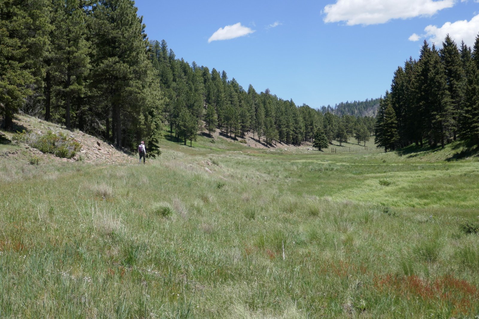 We walked down the hill, saw the work being done to repair the road (we remained clear of the construction area per instructions from the Ranger) and proceed up Jaramillo Creek. We followed an ad hoc trail, an old two-track that runs parallel to Jaramillo Creek (the only recent activity evident on the two-track were bicycles). Lush grasses covered the ground all around and the forest of douglas fir, spruce, and ponderosa pine trees covered the sides of Cerro Piño on our right and Redondo on our left, with burned areas on the ridge tops ahead.